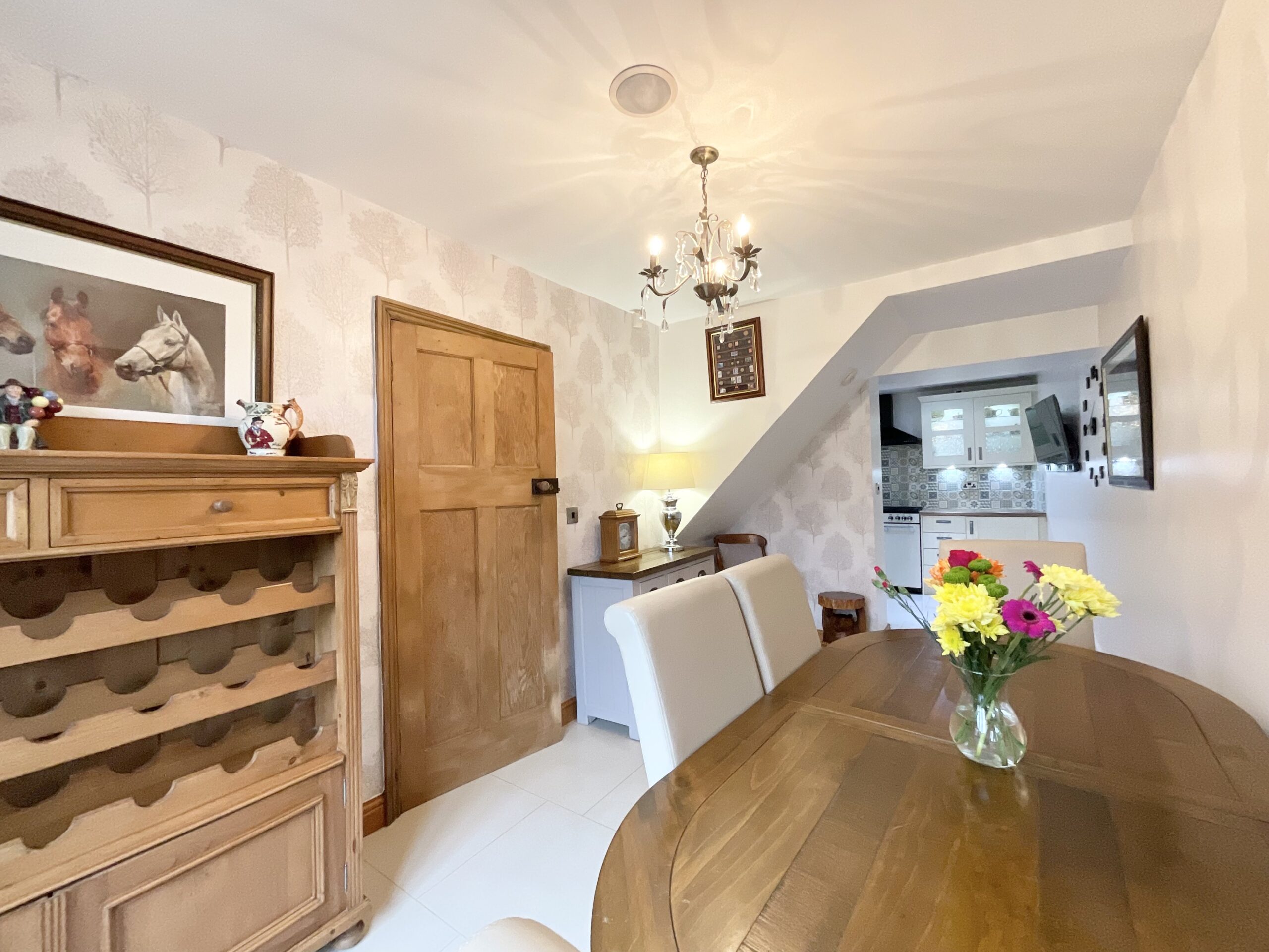From here, the home moves into a gentle canter as it opens into the kitchen and dining area. The dining space acts as the gathering paddock, ideal for rounding up friends and family for meals and celebrations. Adjoining this, the kitchen is smartly turned out in cream cabinetry with plenty of storage, contrasting worktops and eye-catching tiled splashbacks that really stand out from the herd. A classic ceramic sink with drainer takes centre rein, while an integrated dishwasher keeps everything trotting along smoothly.