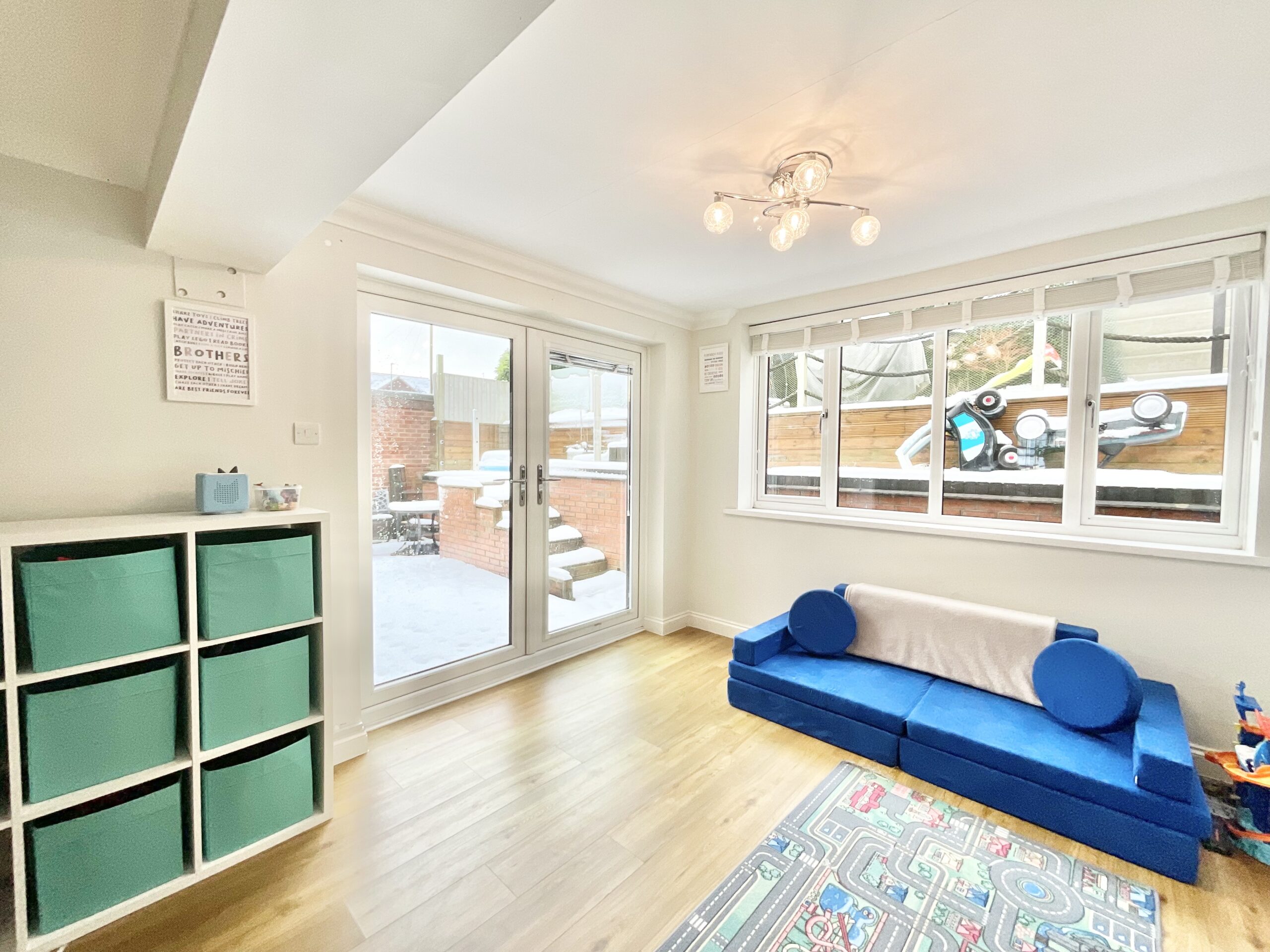 - Re-imagined downstairs space with a bright living room with bay window and feature media wall, additional reception to the rear currently a playroom, study, kitchen/breakfast room, storage , and W/C.