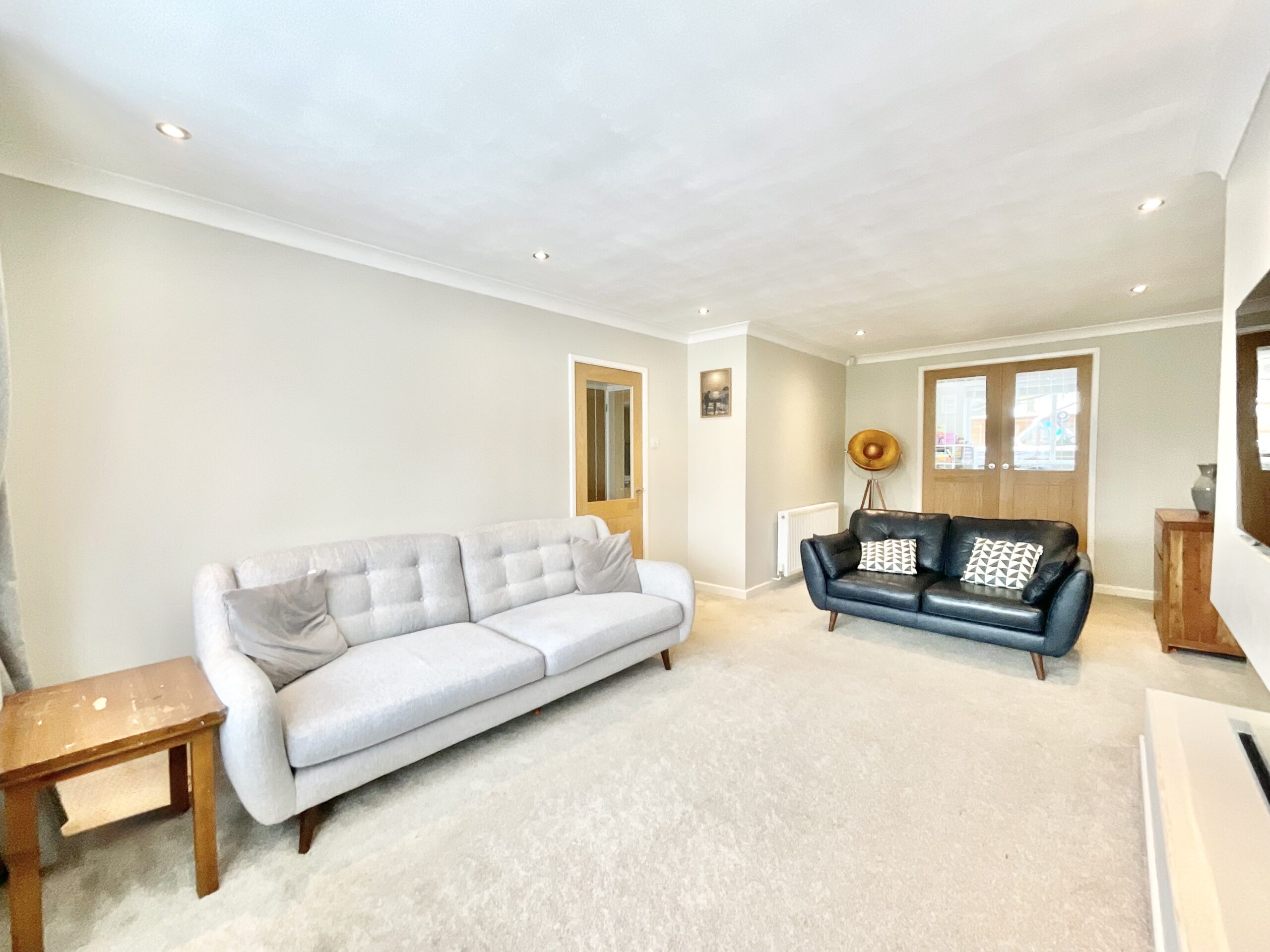 Outside, a South-West facing tiered rear garden awaits with generous patio seating spaces and steps leading up to a lush grass lawn. To the front, a driveway providing ample off-road parking.