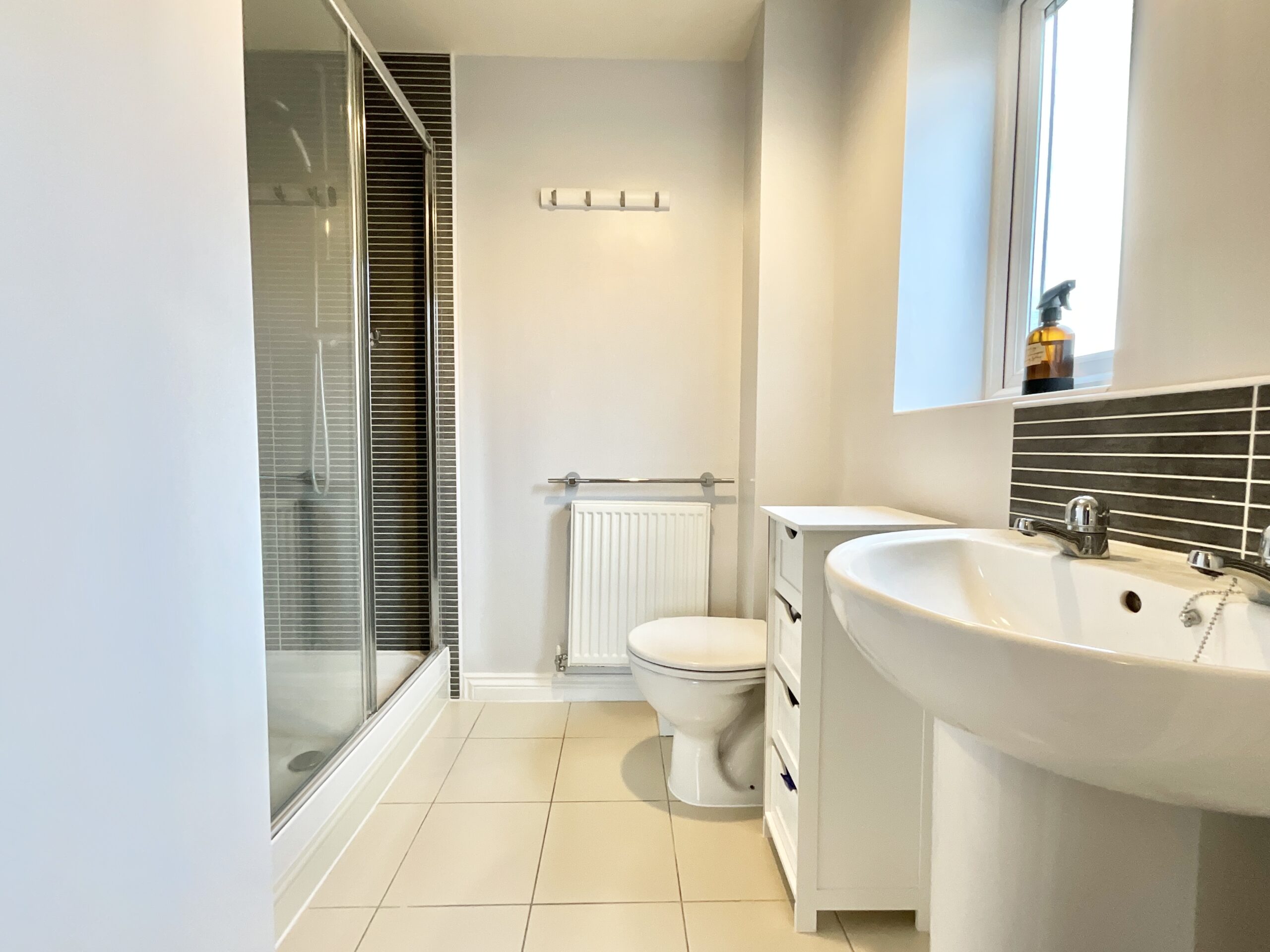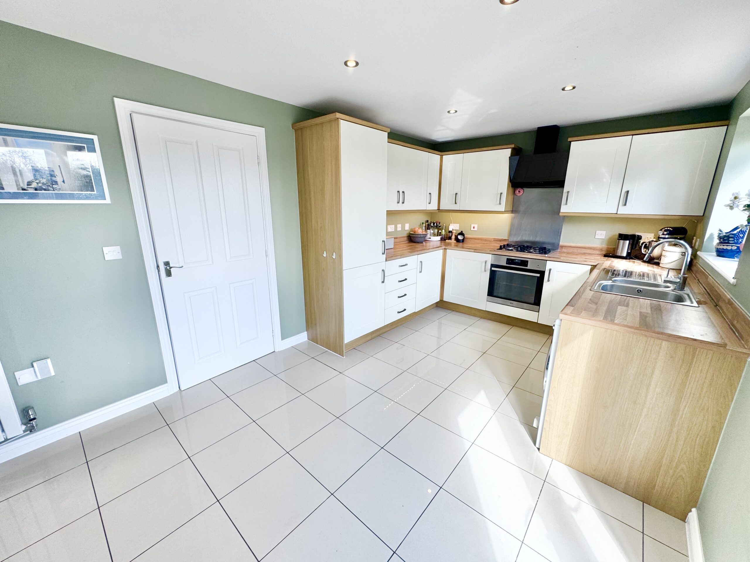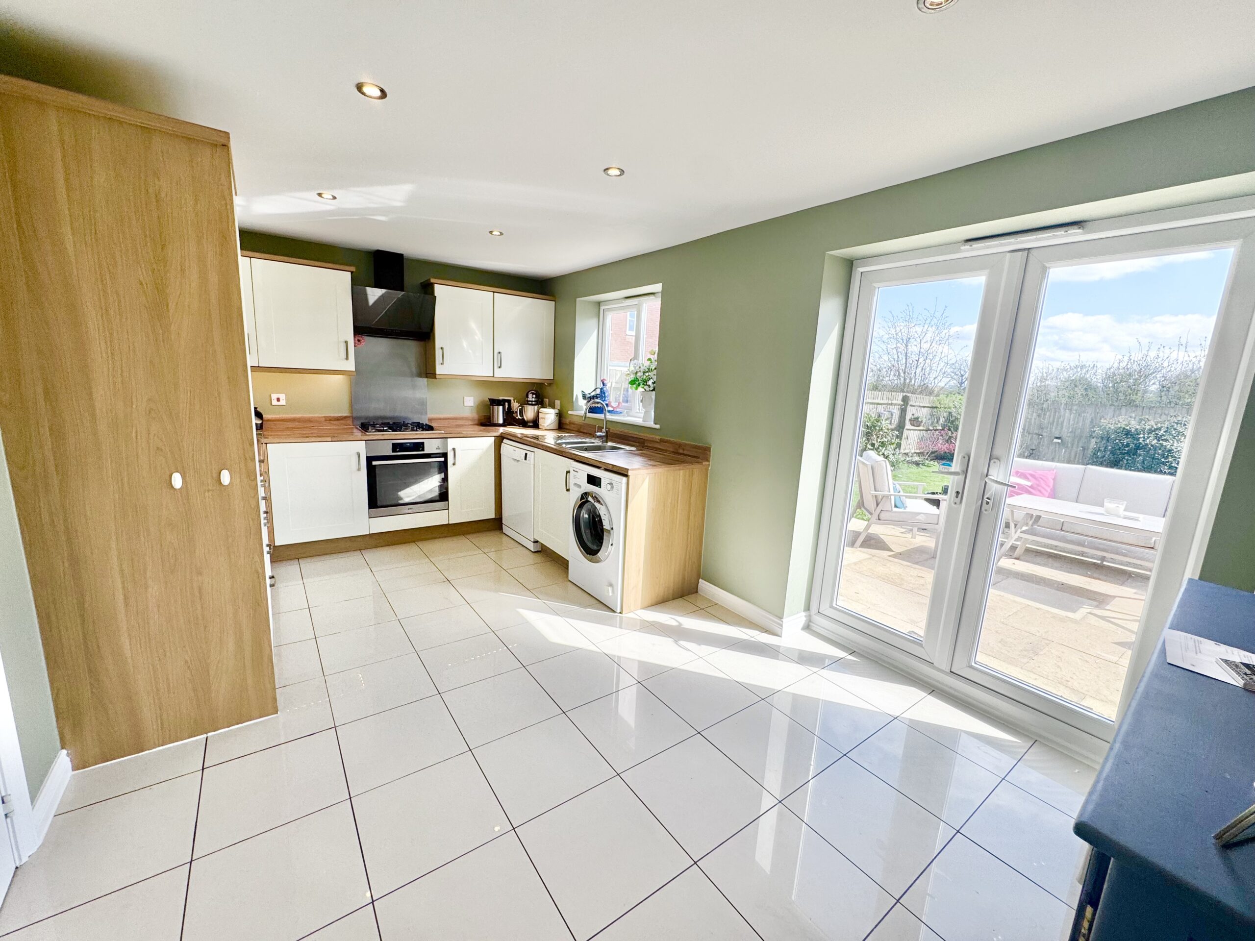 At the heart of the home lies the impressive kitchen diner, fitted with a modern range of wall and base units complemented by generous work surfaces. Integrated appliances include a fridge freezer, oven, and gas hob with a sleek extractor hood, alongside space for additional appliances. A one-and-a-half bowl stainless steel sink sits beneath a rear-facing window, while double doors open directly onto the patio, effortlessly blending indoor and outdoor living. Ceiling spotlights and a contemporary vertical radiator complete this stylish and functional space.