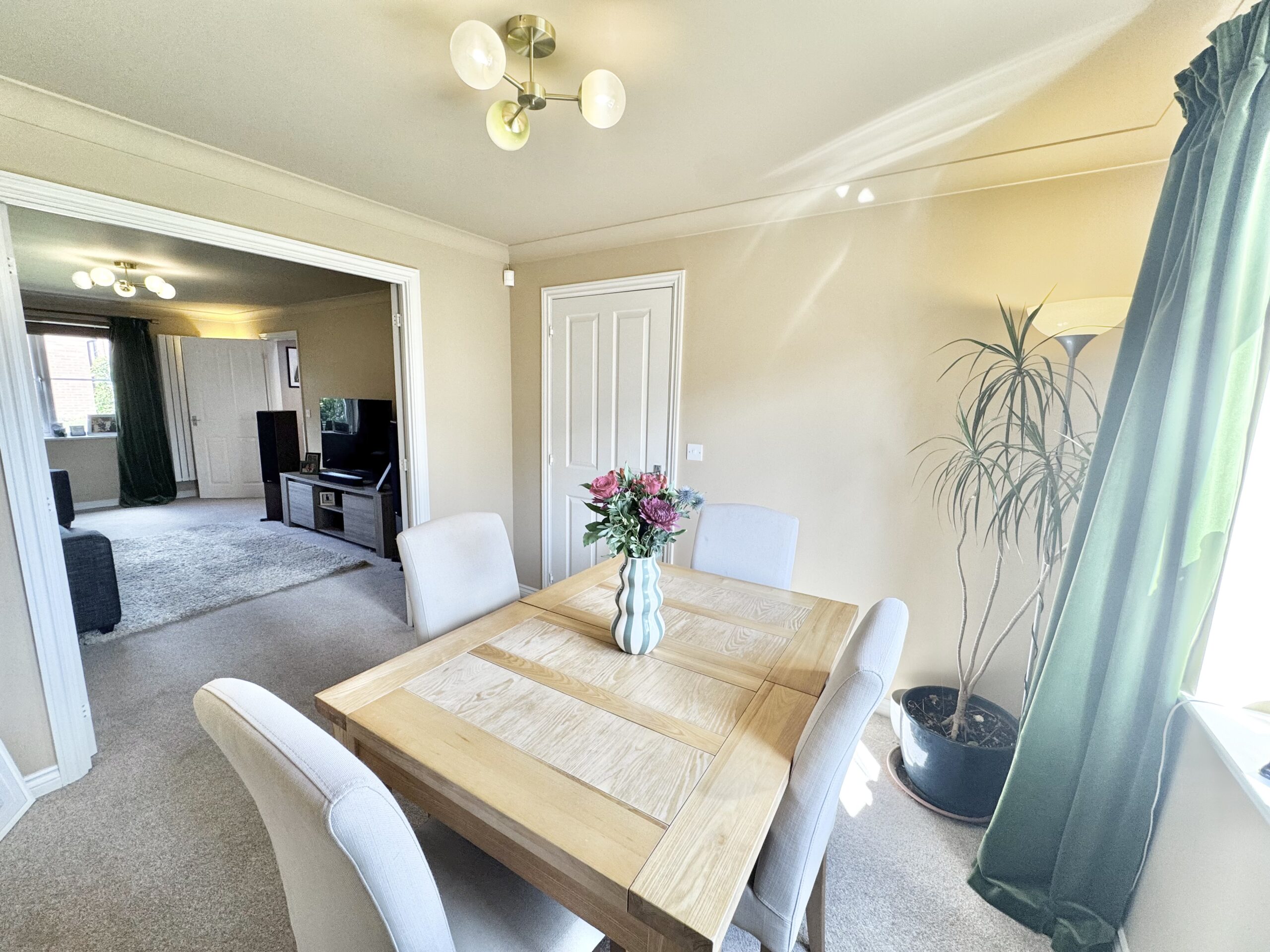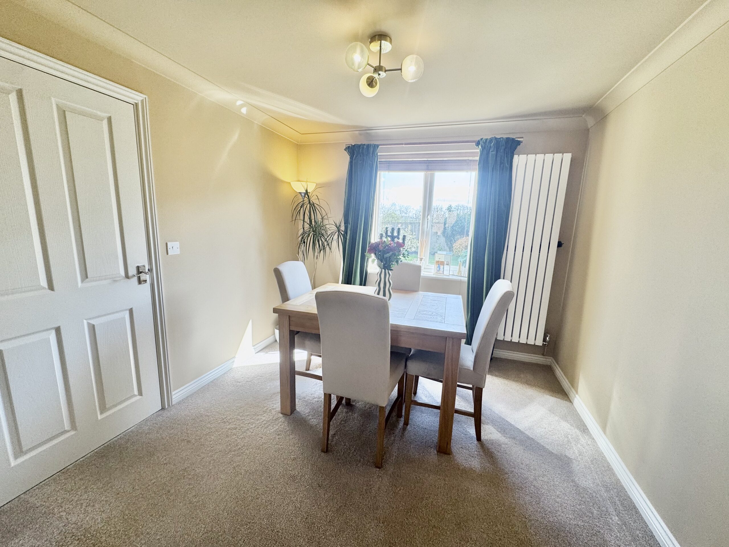 The lounge is a warm and stylish retreat, featuring a front-facing double-glazed window, a striking vertical double panel radiator, and double doors that flow seamlessly into the dining room, perfect for both everyday living and entertaining. The dining room itself enjoys tranquil views over the rear garden and offers direct access into the spacious kitchen diner.