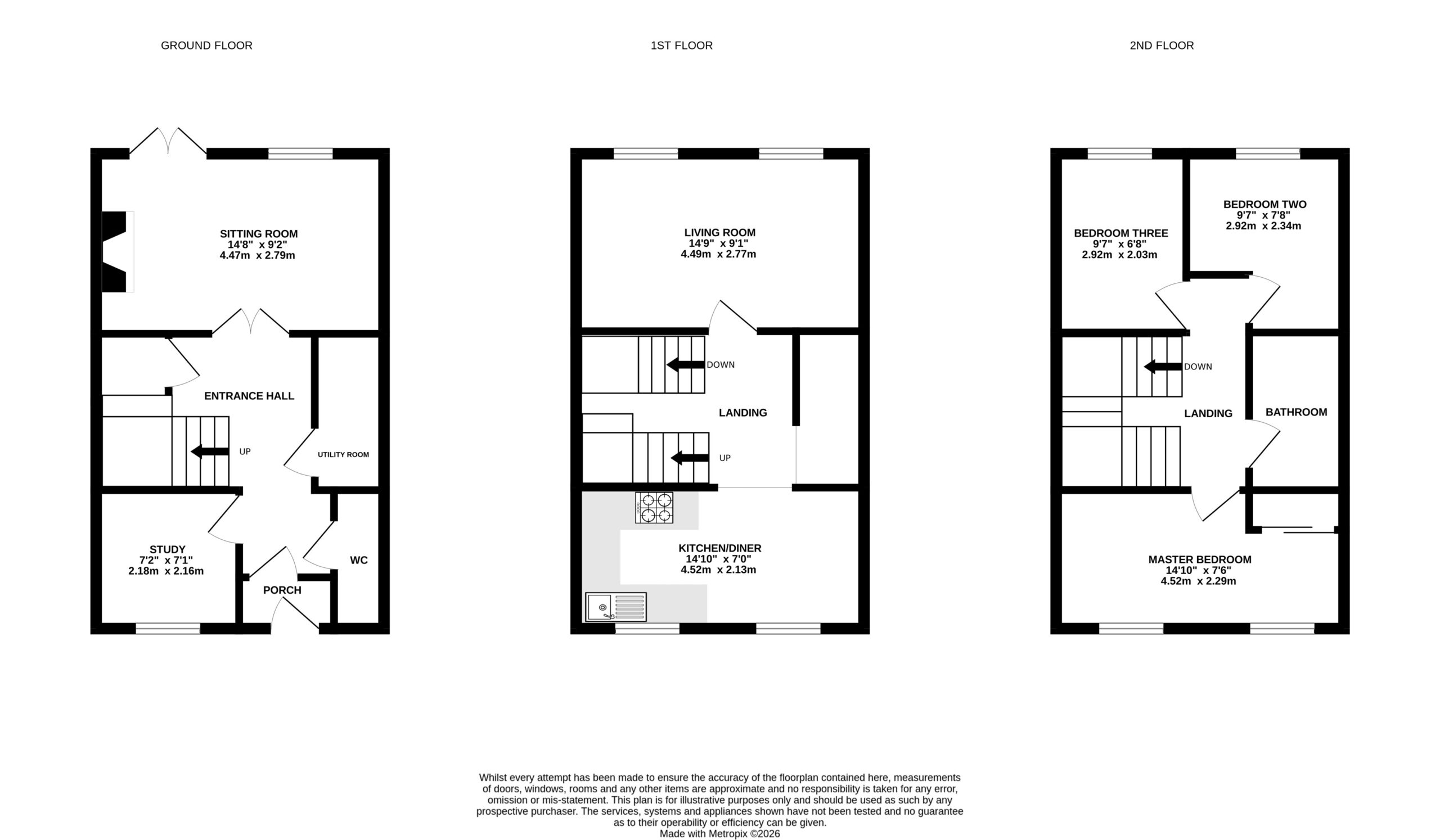 All three bedrooms are located on the second floor. The master bedroom comfortably accommodates a double bed and benefits from built-in wardrobe space. Bedrooms two and three are similar in size and work well as small doubles. The main bathroom is fitted with a bath and overhead shower.