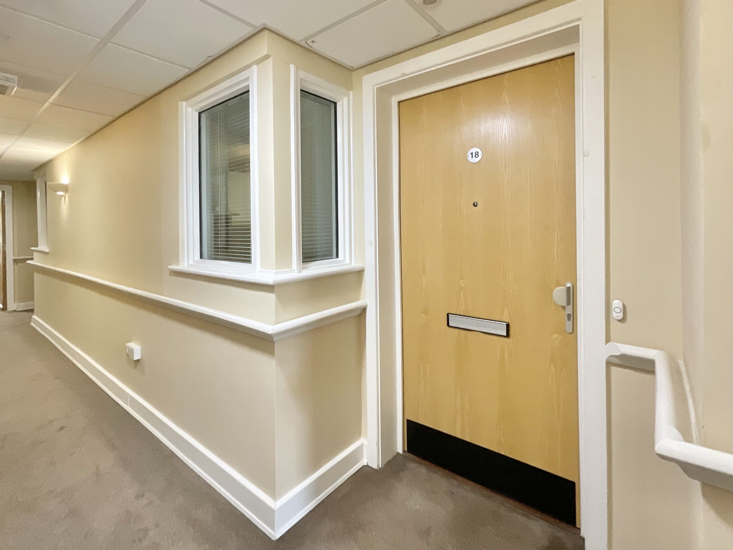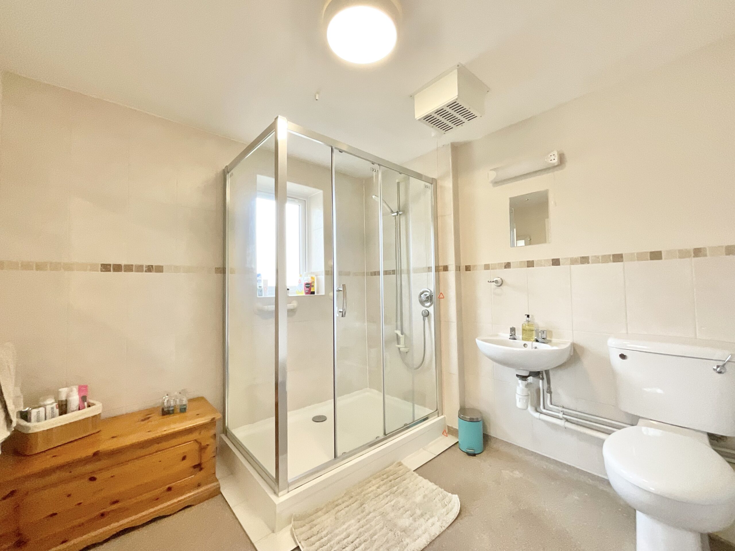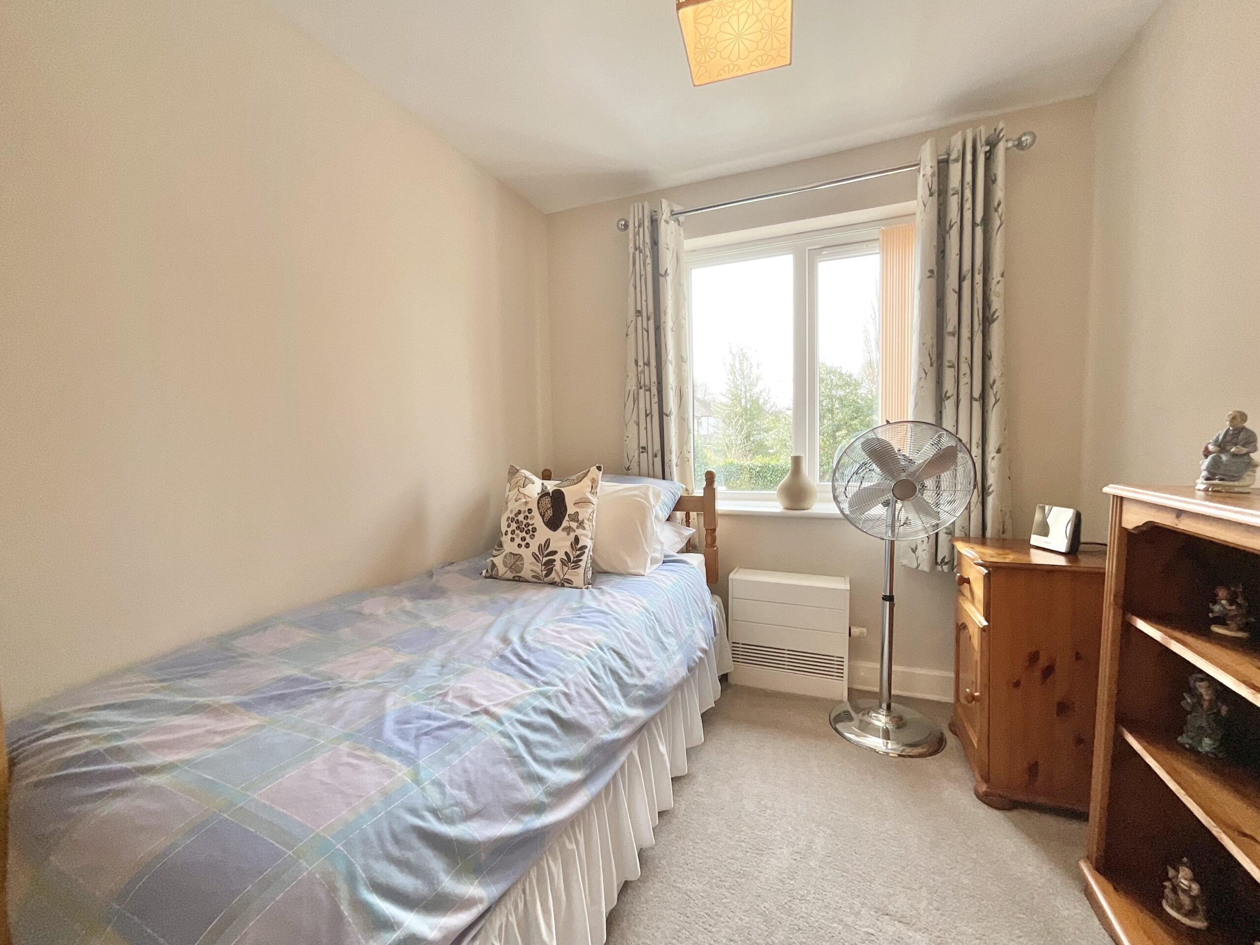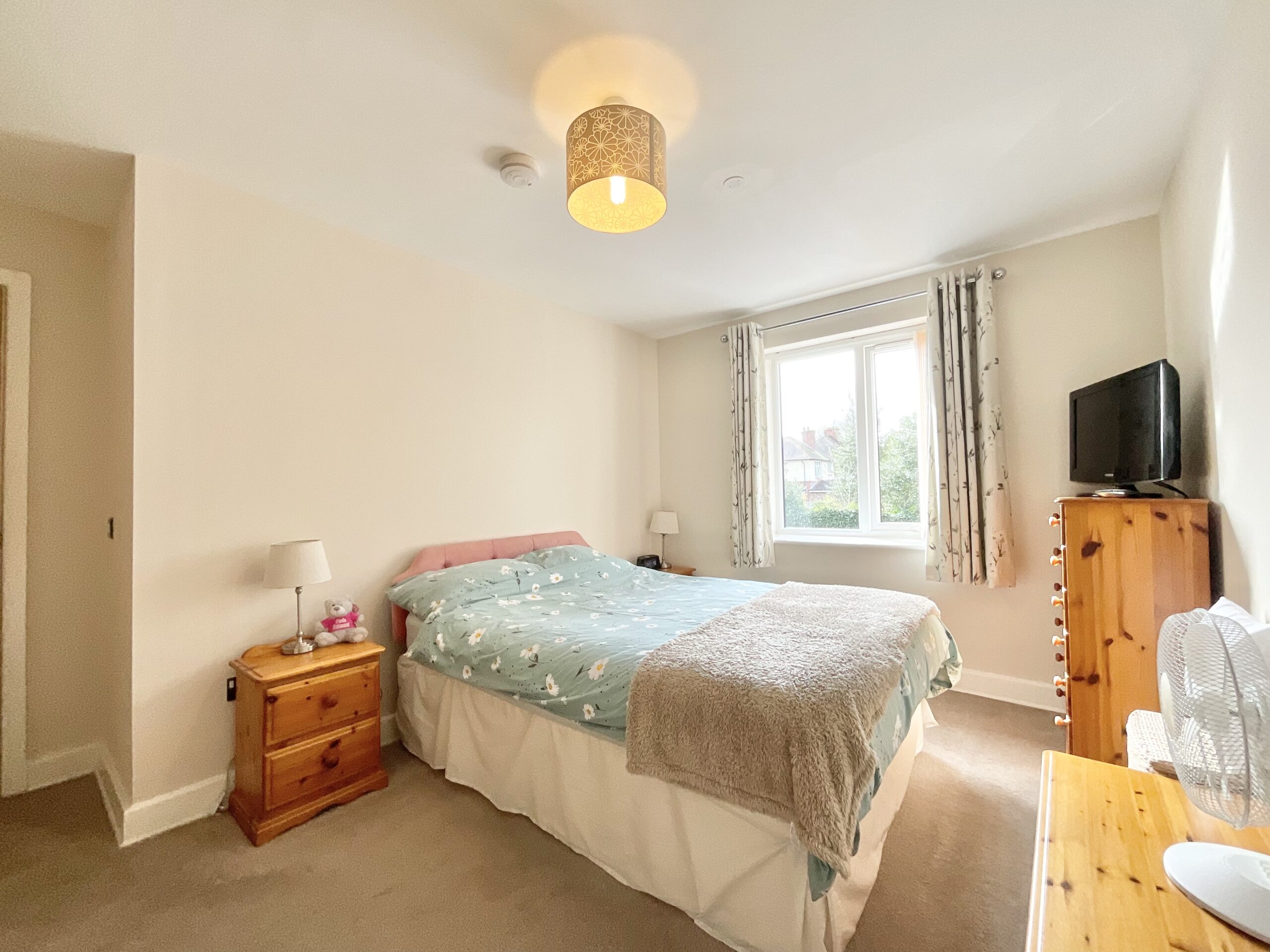 The main bedroom is a spacious double room with a window to the rear, fitted wardrobes, a TV point, and a pull cord for warden assistance, and it also provides direct access to the bathroom, which is fitted with a low-level WC, wash hand basin, and shower enclosure, along with tiled walls and an extractor fan. The second bedroom is another double room with a window to the rear.