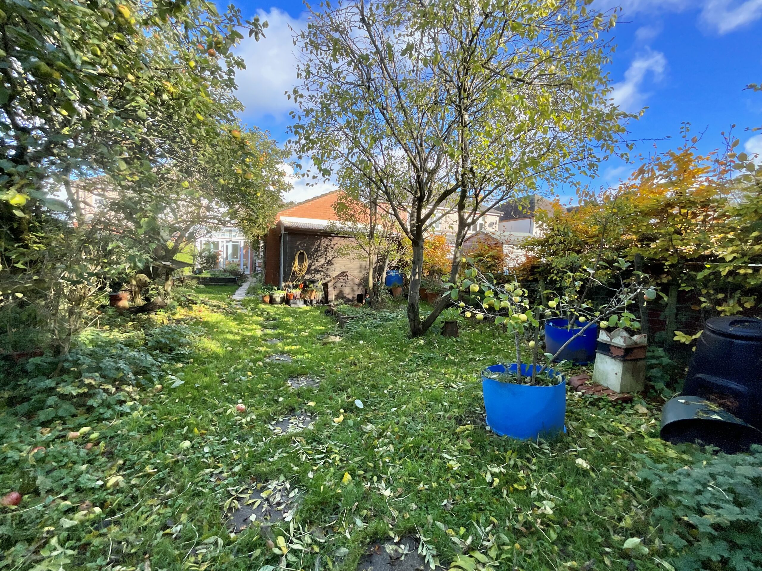 - The rear garden features a raised pond home to a few fish, surrounded by lush lawns, mature shrubs, and privacy-giving hedges. Two garden sheds offer even more space.
