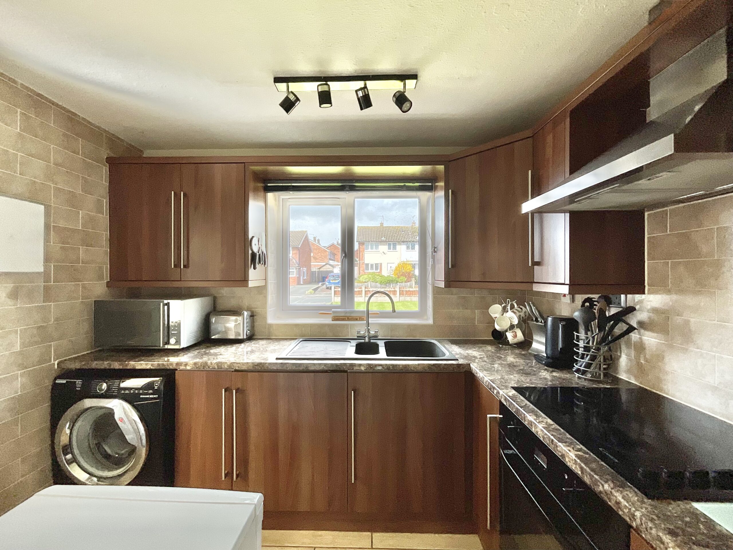 3. Practical L-shaped kitchen with dark wood-effect cabinetry and complimenting worktops and space for a range of appliances.