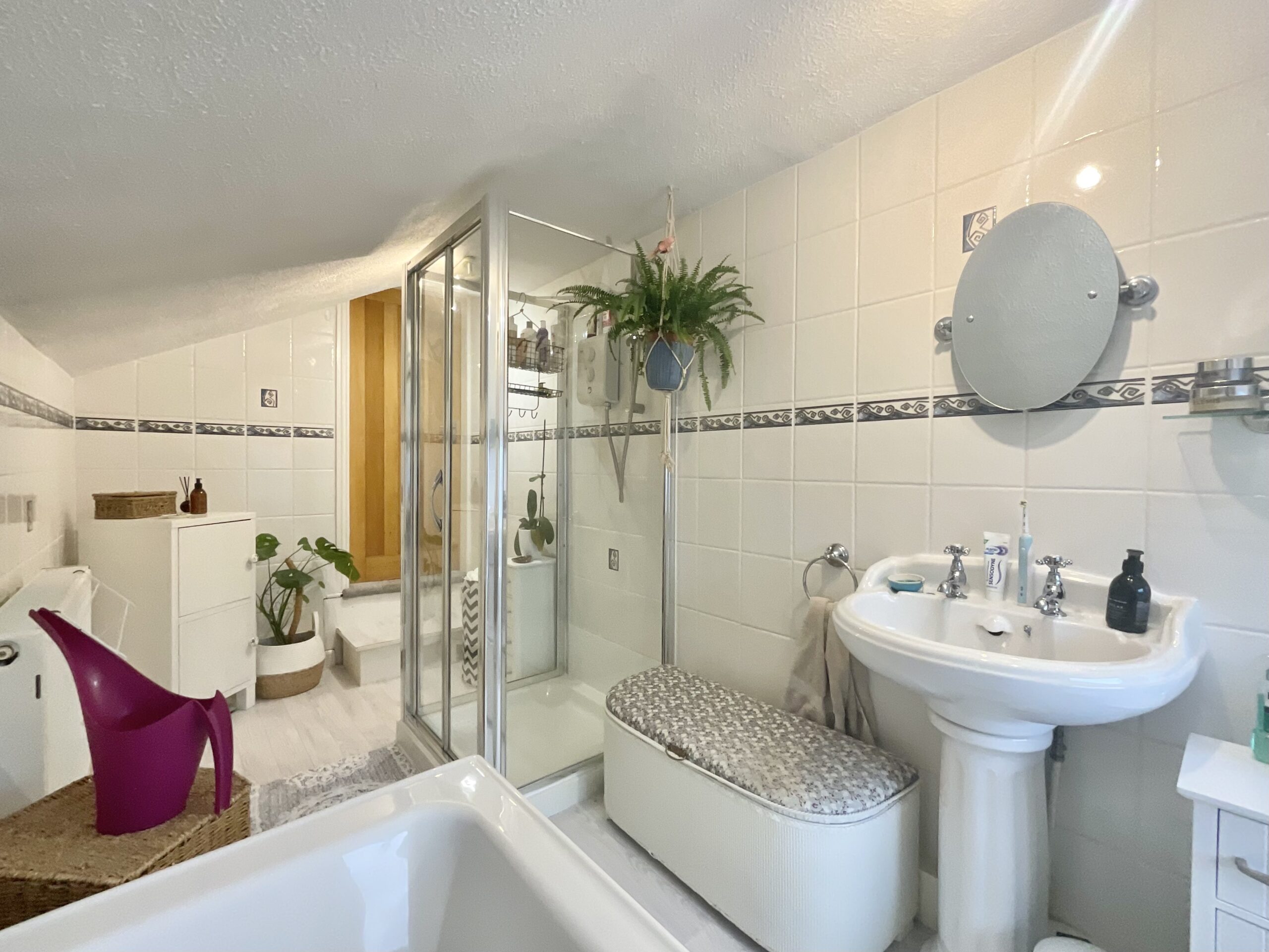 The main bathroom is stylishly finished and features both a bath and a separate shower, offering a sleek and contemporary feel.