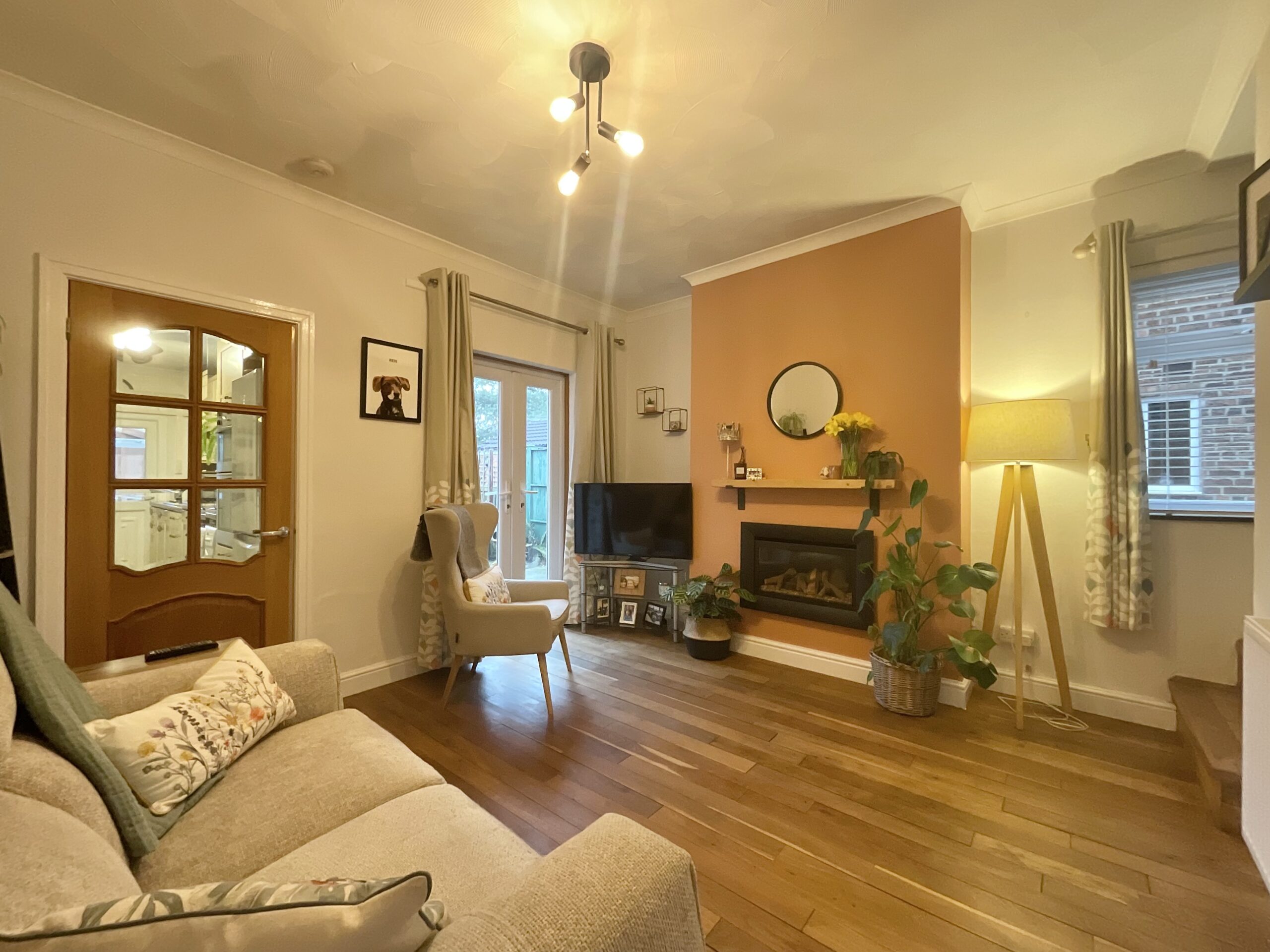 The living room is a cosy and welcoming space, featuring an gas fire as a focal point. French doors open directly onto the patio area, creating a seamless connection to the garden and allowing plenty of natural light to fill the room.