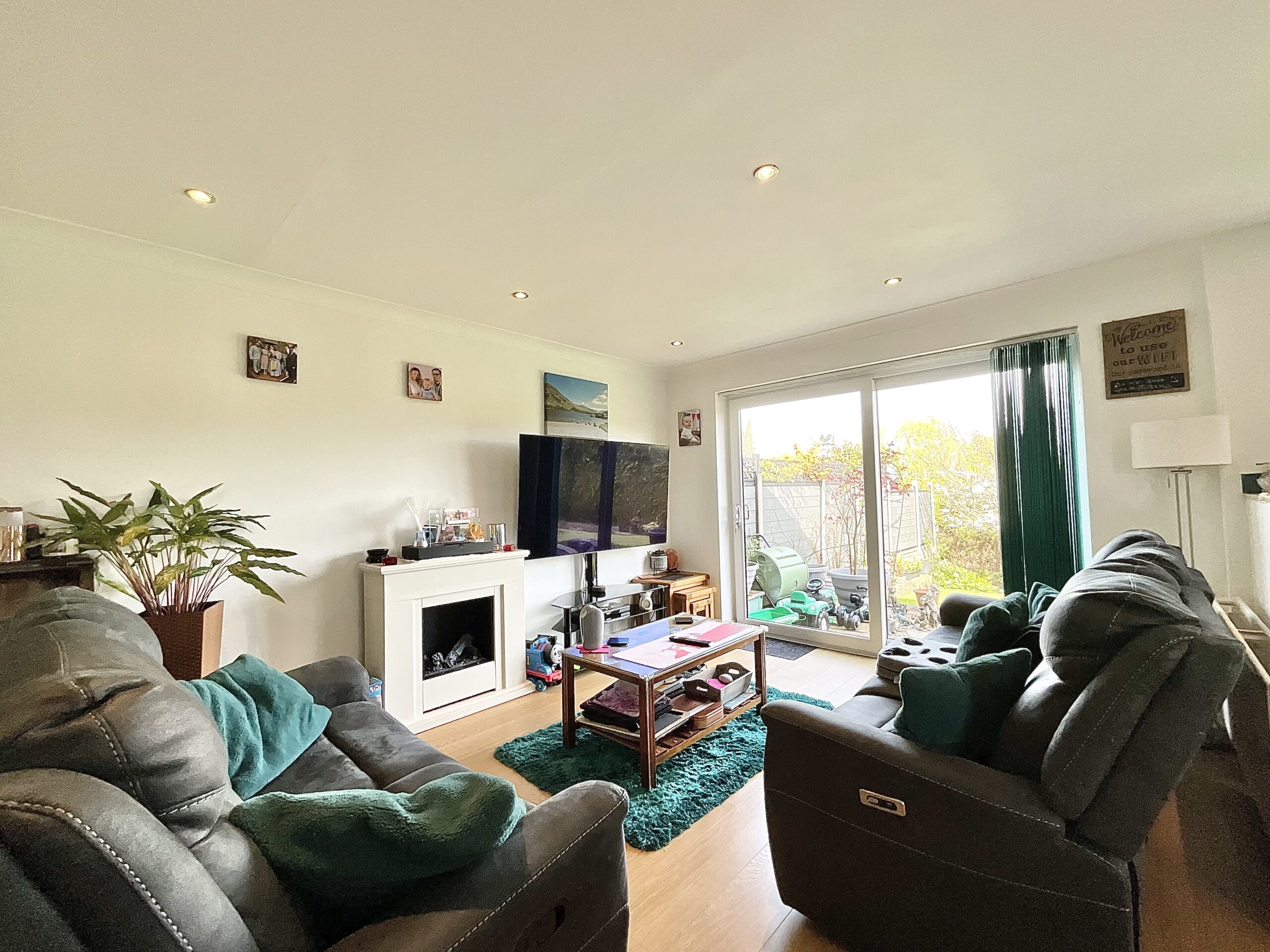 2. A bright open-plan kitchen, lounge, and dining area, perfect for entertaining guests with warm vibes from the electric fire and garden views.
