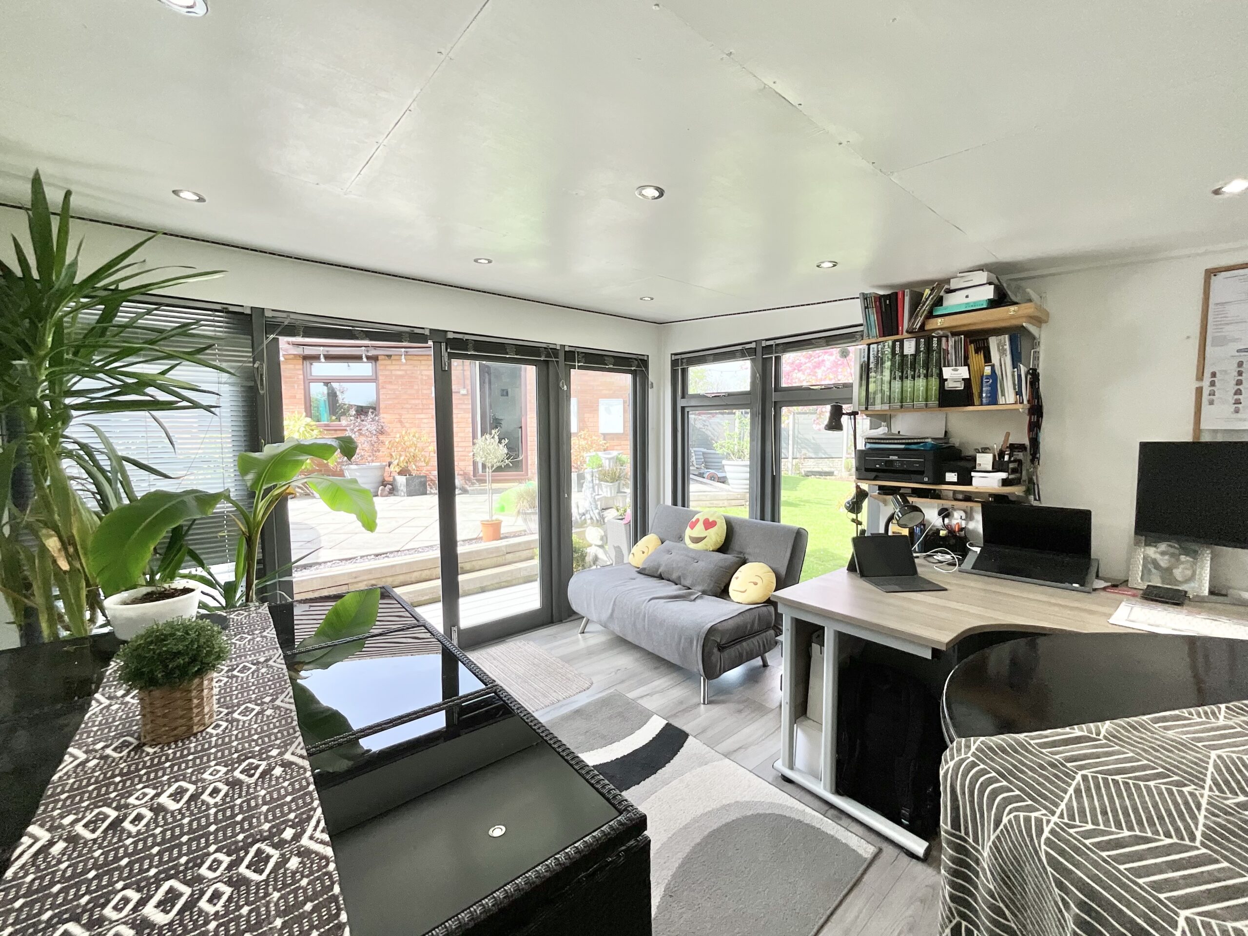 4. A delightful garden cabin/studio with plenty of natural light and a log burner, perfect for hobbies, work, or a magical escape.