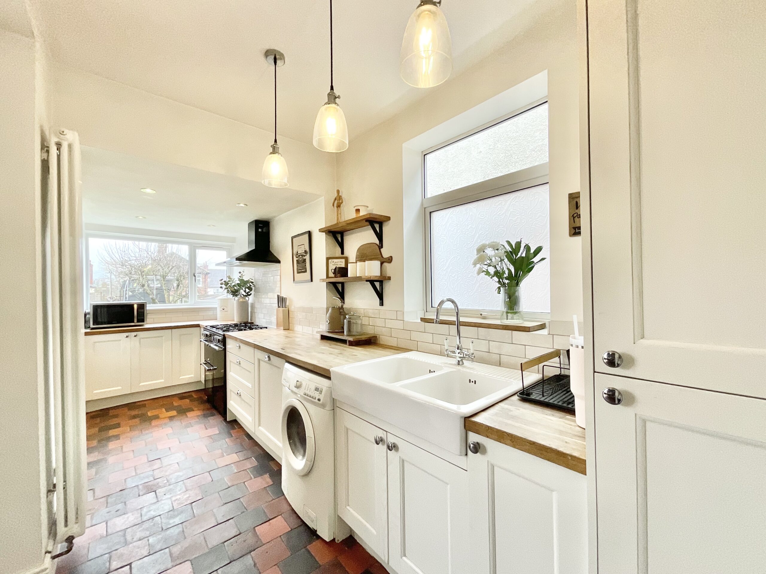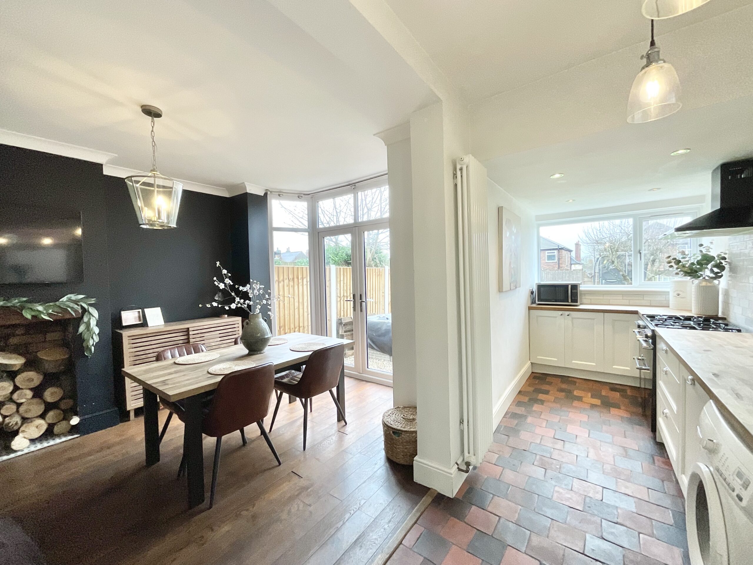 Step inside to a welcoming living room, where a log burner creates a cosy focal point and a large bay window fills the space with natural light. It’s an inviting room designed for relaxing evenings and everyday comfort. To the rear, the open-plan kitchen and dining area provides a generous, sociable space ideal for both daily life and entertaining. French doors open directly onto the garden, allowing light to flow through and creating an easy connection between indoors and out. The kitchen is well equipped with integrated appliances including a dishwasher and fridge freezer, along with a double ceramic sink, offering both practicality and style.
