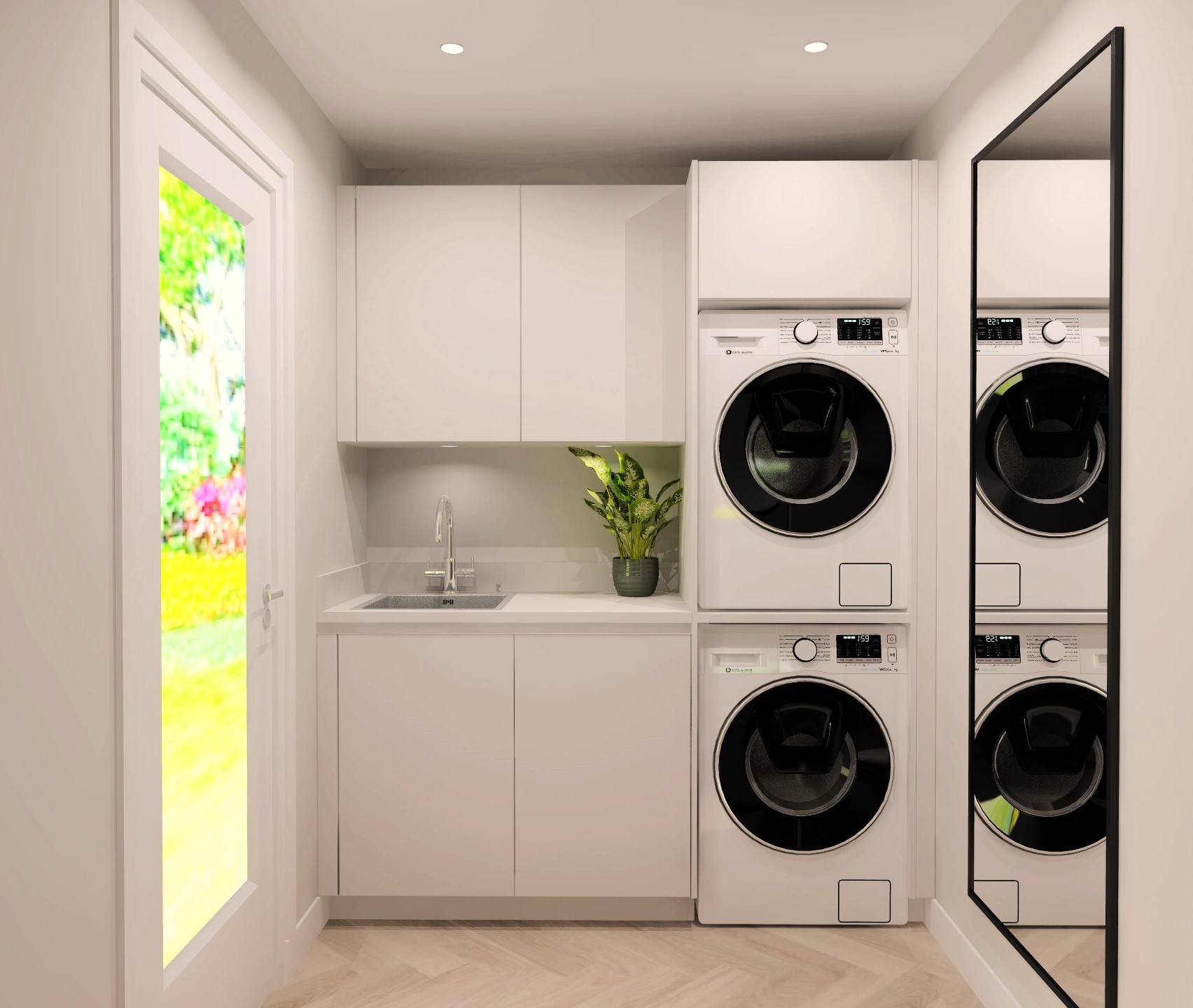 Including a full-size fridge and freezer, hide and slide oven, microwave oven, warming drawer, induction hob, dishwasher, washing machine, heat pump dryer, and recycling bins.