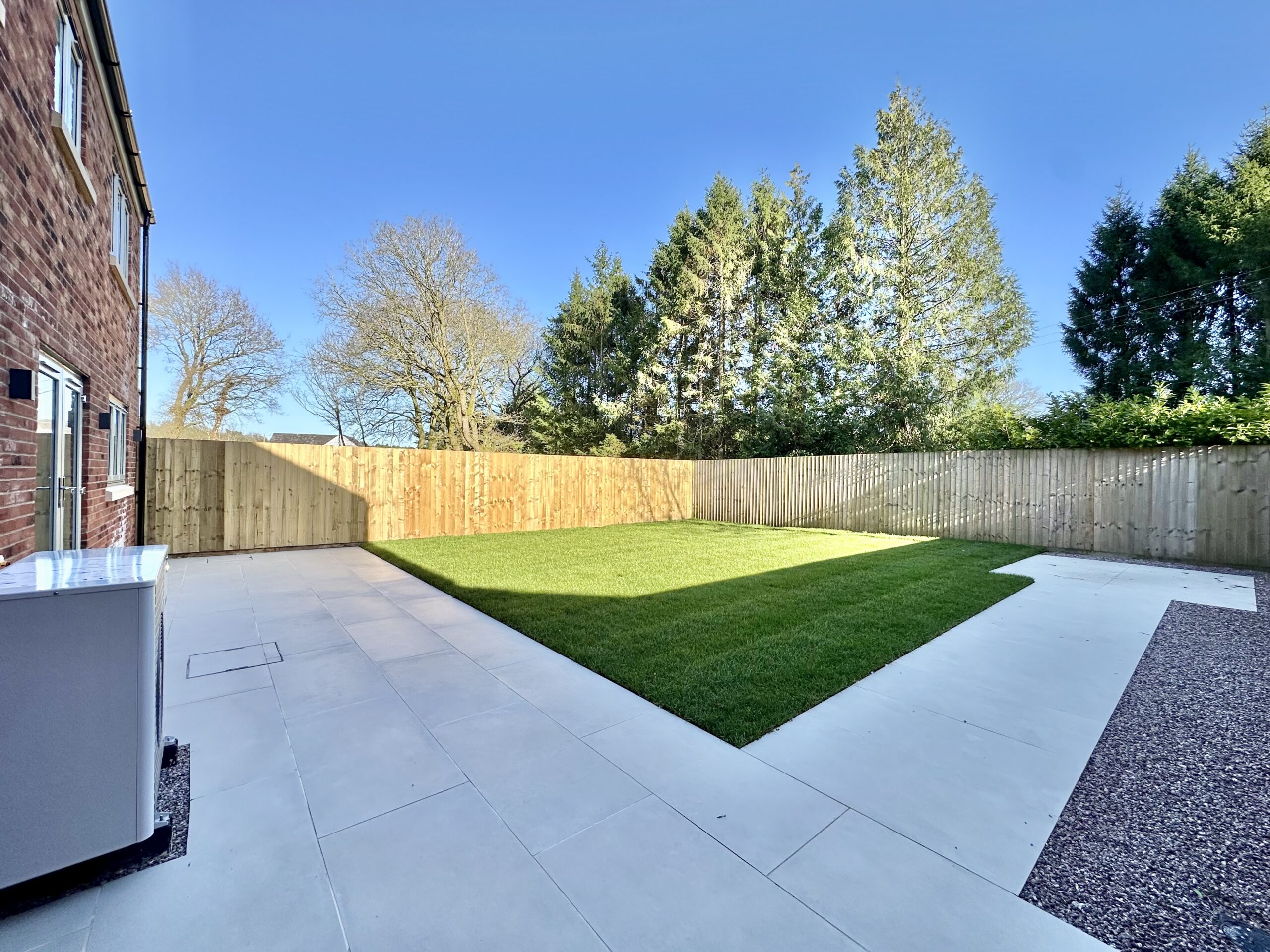 Landscaping with a PORCELAIN PATIO, turfed lawns, and planting