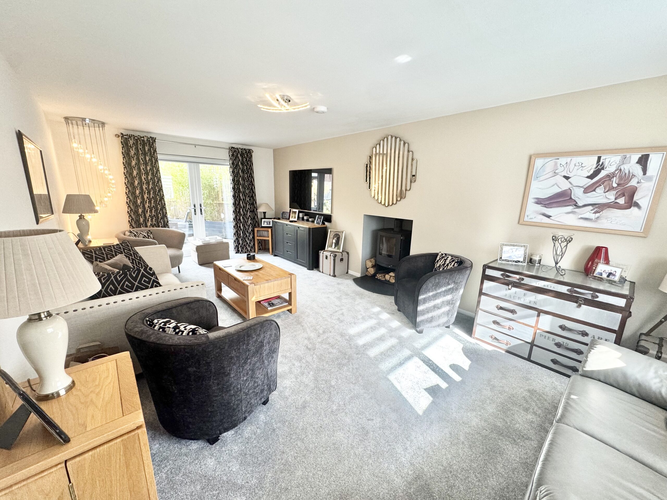The lounge is a truly impressive space, stretching the full depth of the property and bathed in natural light from its dual aspect. A front-facing window and rear French doors frame views of the garden, while a central log-burning stove creates a cosy focal point for relaxing evenings. Electric blinds add a contemporary finish, making this a room that is as functional as it is beautiful.