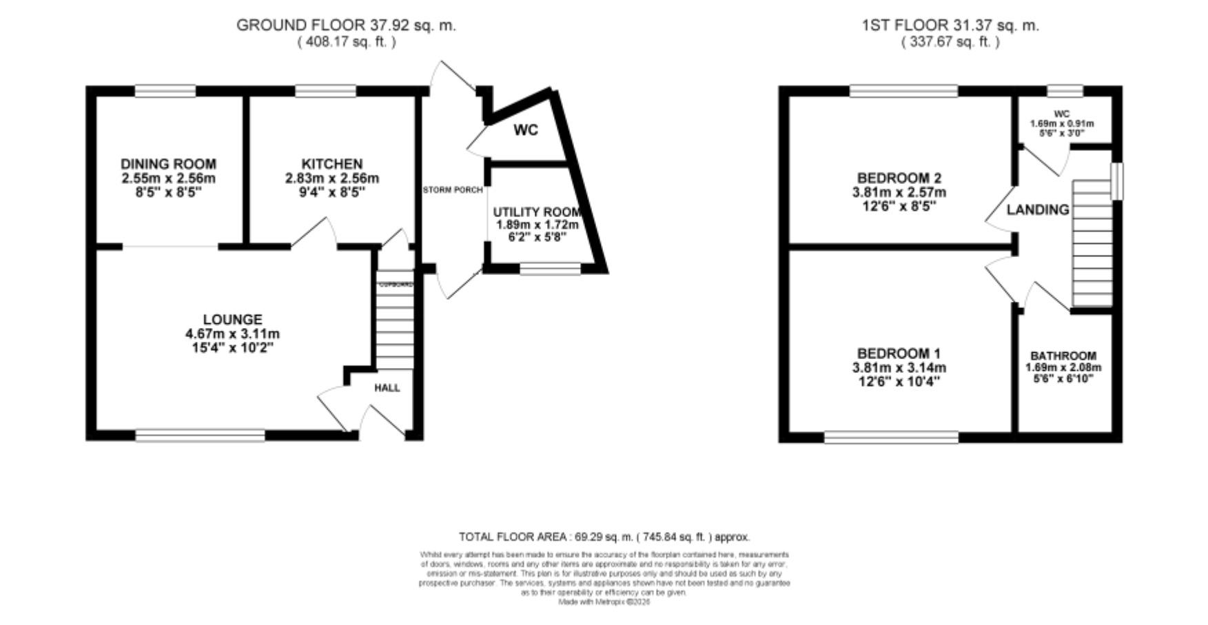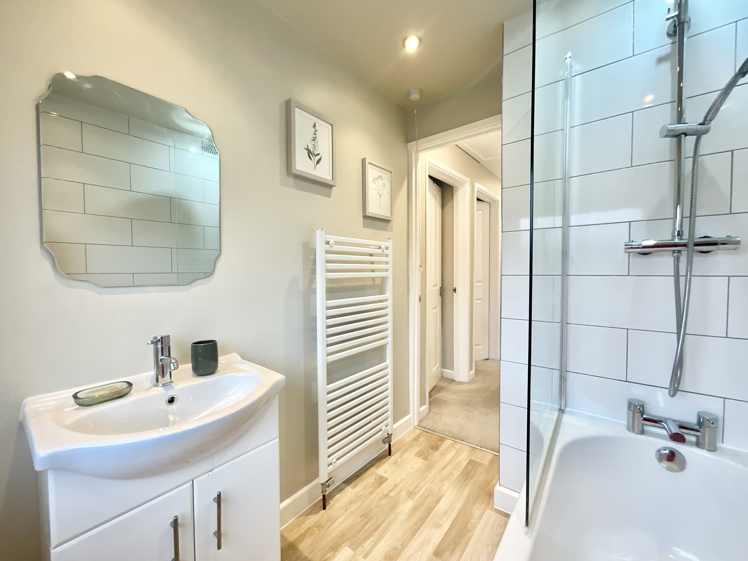 Upstairs, two generously sized double bedrooms provide calm and comfortable retreats with plenty of space for wardrobes, while the contemporary bathroom is finished with a modern suite including a shower over the bath, sleek sink, and heated towel rail. A separate W.C. adds a welcoming touch of convenience for busy households.