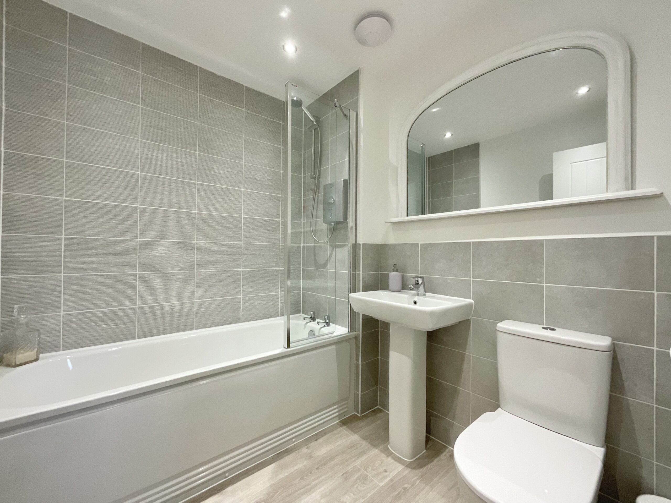On the first floor are two well-proportioned bedrooms. Bedroom two is a spacious double with potential for built-in wardrobes, along with a dedicated storage cupboard. Bedroom three is a versatile room currently used as a home office but equally suited as a single bedroom, nursery, or hobby space. The family bathroom is also located on this floor, finished to a sleek standard and featuring a bath with overhead shower.