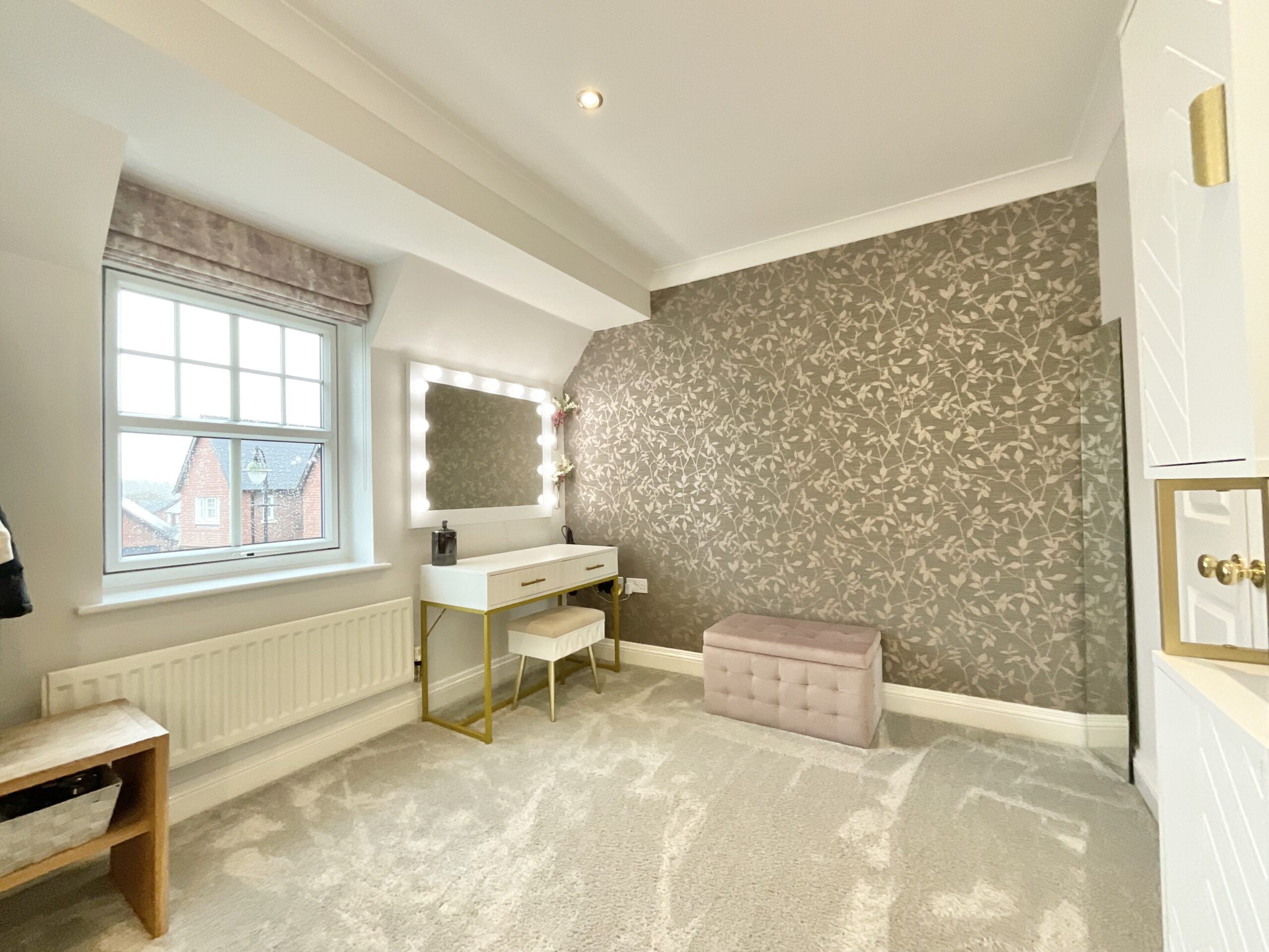 To the first floor are four well-proportioned double bedrooms. The principal bedroom benefits from an impressive en-suite featuring his and hers sinks, underfloor heating, and a spacious walk-in shower with rainfall and handheld fittings. Bedroom two also enjoys its own en-suite along with built-in storage. Bedroom three, currently used as a dressing room, features fitted wardrobes, while bedroom four, also with built-in wardrobe space, is presently arranged as a home office yet remains a comfortable double bedroom.