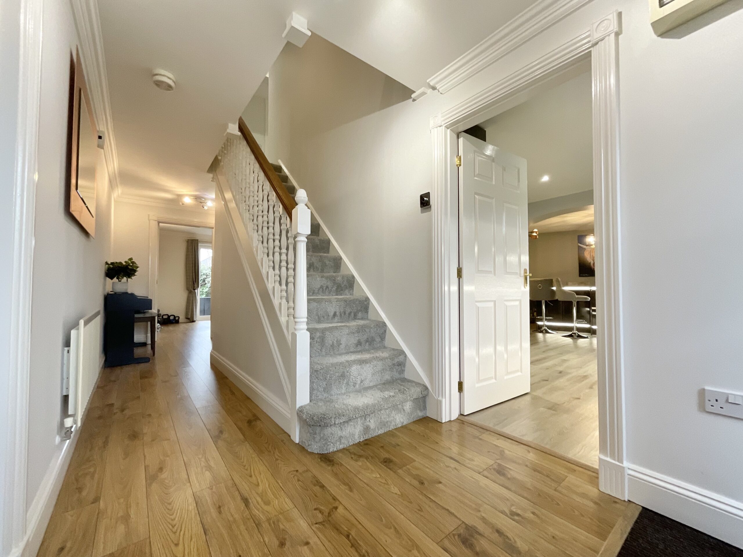 At the heart of the home is the recently re-fitted bespoke kitchen, finished to an exceptional standard with granite worktops and full-height cabinetry. The kitchen is equipped with a comprehensive range of high-end integrated appliances, including a double oven, five-ring induction hob with extractor, integrated fridge freezer, and a drinks fridge. This space flows naturally into a generous family area, currently centred around a large kitchen island offering seating and additional storage, making it ideal for both everyday living and entertaining.