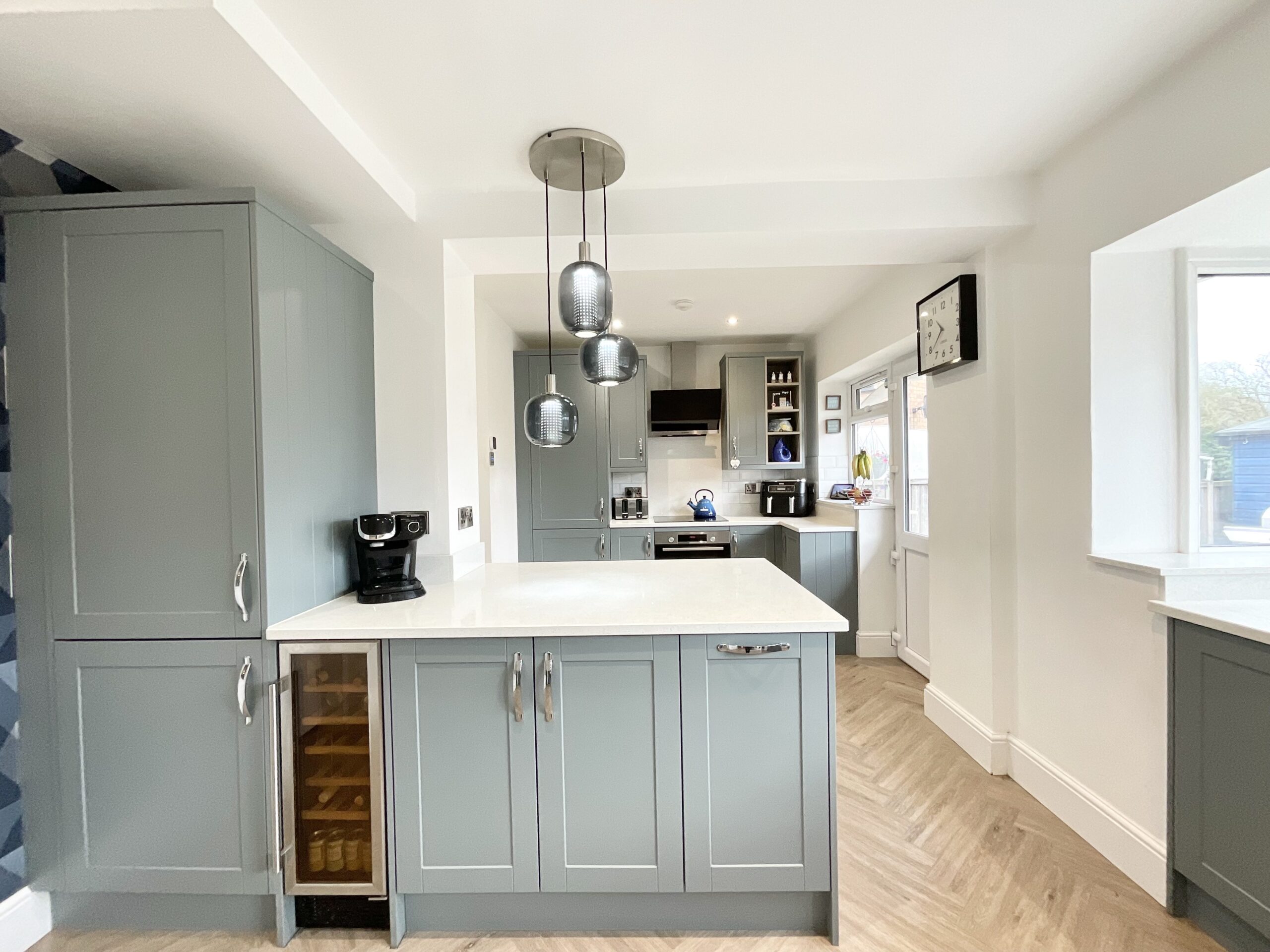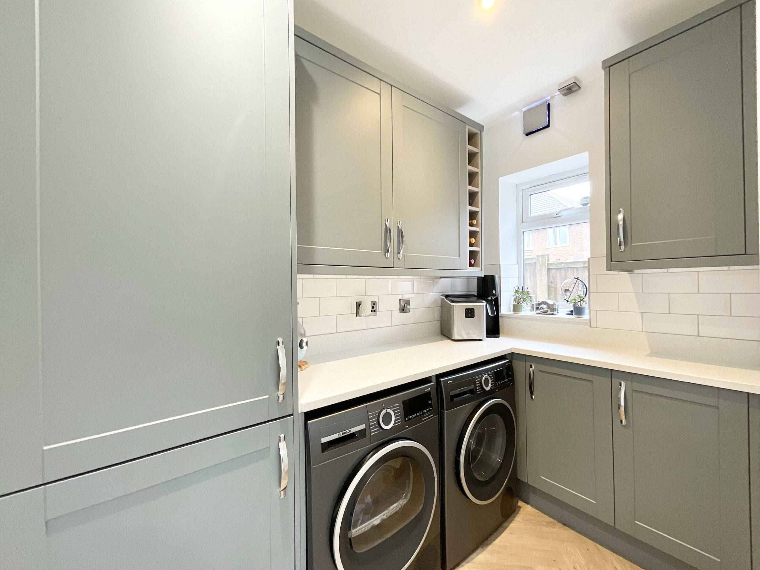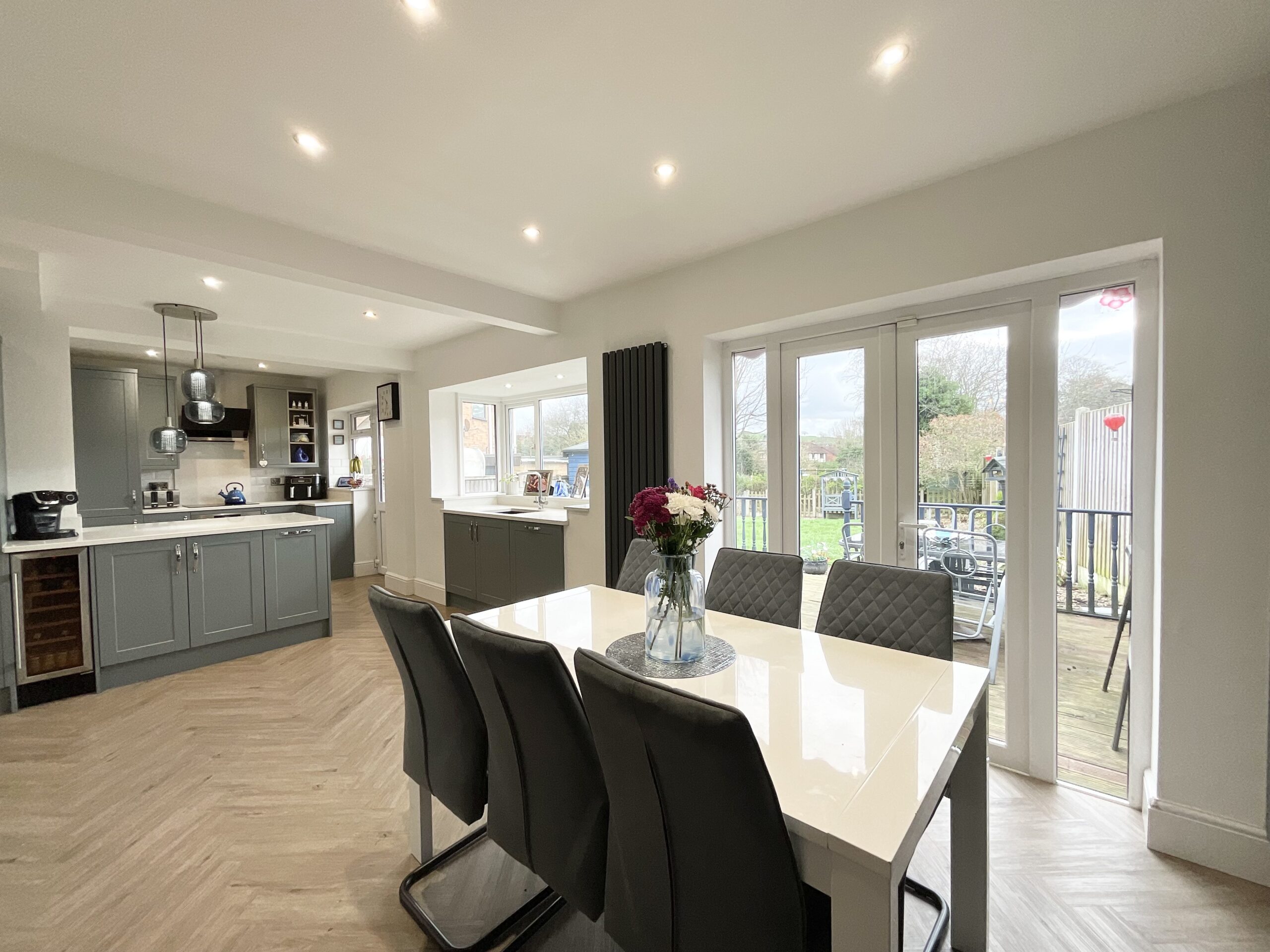 Step inside and you’re off to a strong start with a welcoming entrance hall that sets the pace. To the front, a cosy living room with a large bay window provides the perfect retreat… an ideal spot to unwind after a busy day. But it’s to the rear where this home really finds its stride. The impressive open-plan kitchen/diner forms the heart of the home, a sociable, light-filled space made for both everyday family life and entertaining at full pace. A striking picture window and French doors open directly onto the garden, allowing natural light to pour in and creating seamless indoor-outdoor living. The kitchen itself is fitted with sleek modern grey cabinetry and exquisite quartz worktops throughout, combining style with substance. Integrated appliances include a fridge/freezer, dishwasher, ceramic hob with extractor hood, oven, wine fridge and a stainless-steel sink, ensuring everything is in place whether it’s a quick breakfast dash or a weekend hosting marathon. Just off the kitchen, the utility room provides additional space for further appliances and features matching cabinetry, keeping the design cohesive and clutter neatly out of sight. Adding an extra touch of comfort, both the kitchen and adjoining utility room benefit from underfloor heating, creating a warm and inviting atmosphere underfoot all year round. There is also a further reception room on the ground floor, a truly versatile space that can adapt as life changes pace. Whether used as a study for home working, a snug, a playroom or hobby room, it’s ready to flex with your needs. Completing the ground floor is a convenient W/C with vanity wash hand basin.
