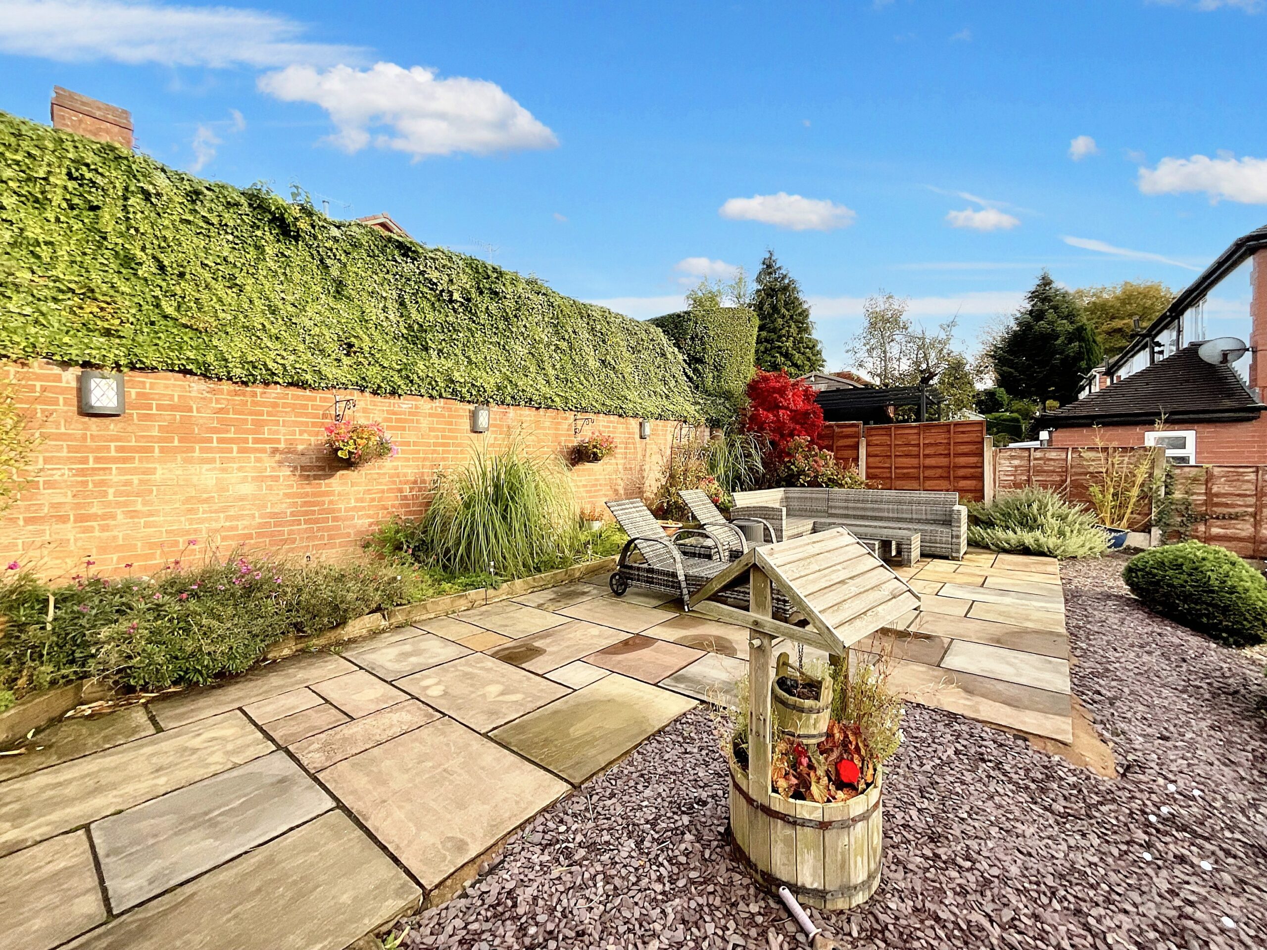 - Beautiful, landscaped, tiered garden with spacious patio seating spaces, low-maintenance slate, and mature shrubs.