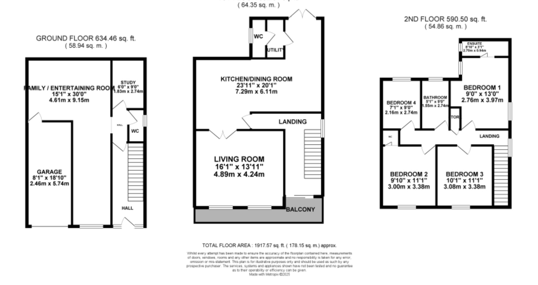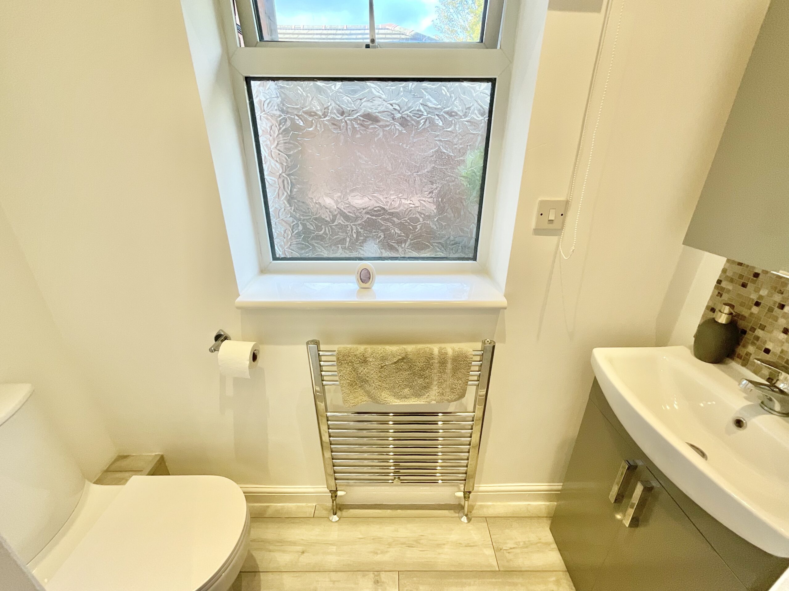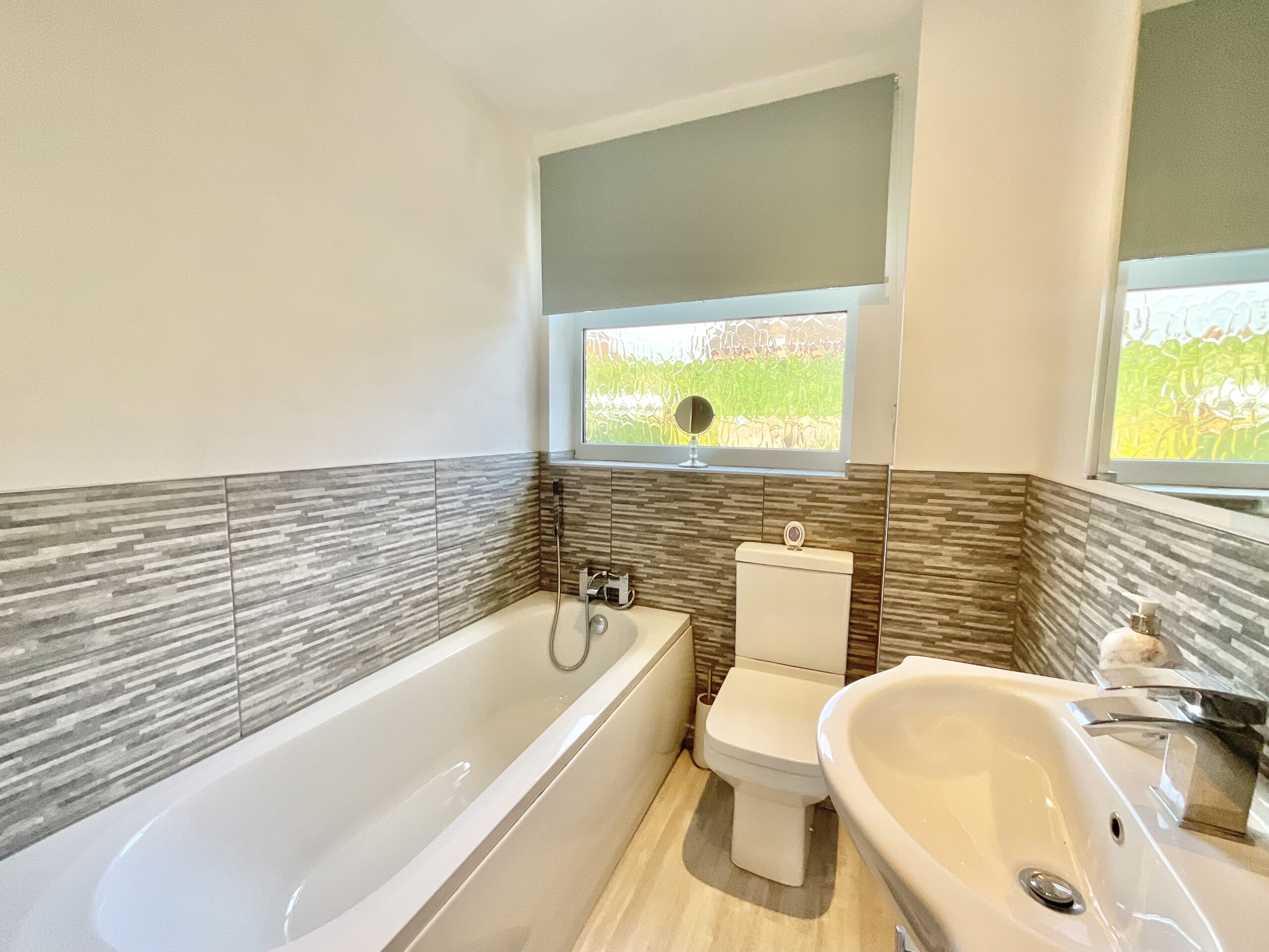 Upstairs is home to four spacious bedrooms, including the master with dual-aspect windows and its own en suite shower room. The second double bedroom has lush views from the front window and a hidden W/C for added convenience. A further double bedroom and single bedroom are perfect for growing families, guests, or perhaps your own dressing room! The family bathroom is perfectly designed with a sleek bath, separate shower cubicle, sink, W/C, and modern tiles covering half the wall.