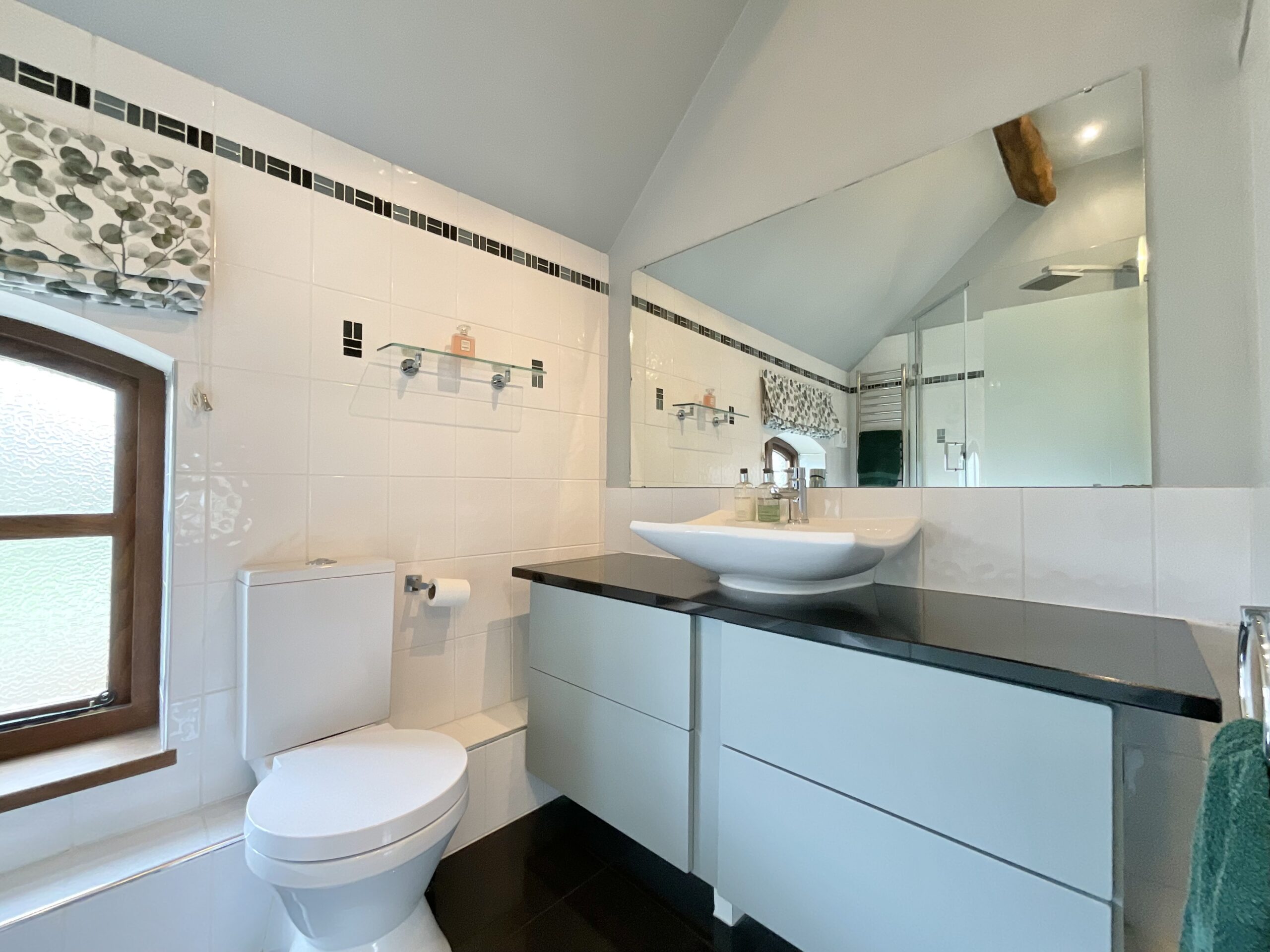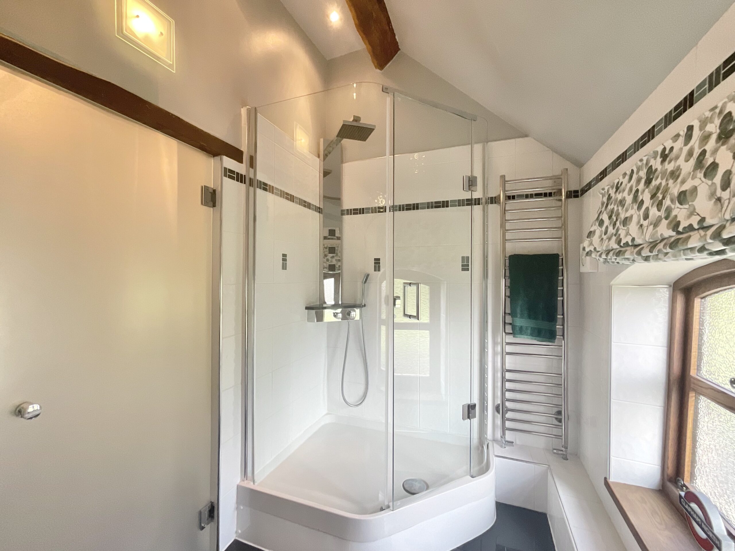 Upstairs, a galleried landing adds architectural interest and leads to four generously sized double bedrooms. The principal suite is particularly impressive, boasting a full-width window spanning the rear wall, perfectly framing breathtaking views of the surrounding rolling hills and flooding the room with natural light. This luxurious space also includes a dressing room and a beautifully appointed ensuite with dual shower heads, including a rainfall feature for a spa-like experience. Bedrooms two and three are both spacious doubles, each benefitting from their own ensuite shower rooms with walk-in showers. Bedroom four is equally generous in size, offering flexibility for family, guests, or even a home office. The main bathroom is finished to a high standard and includes both a bath and a separate shower.