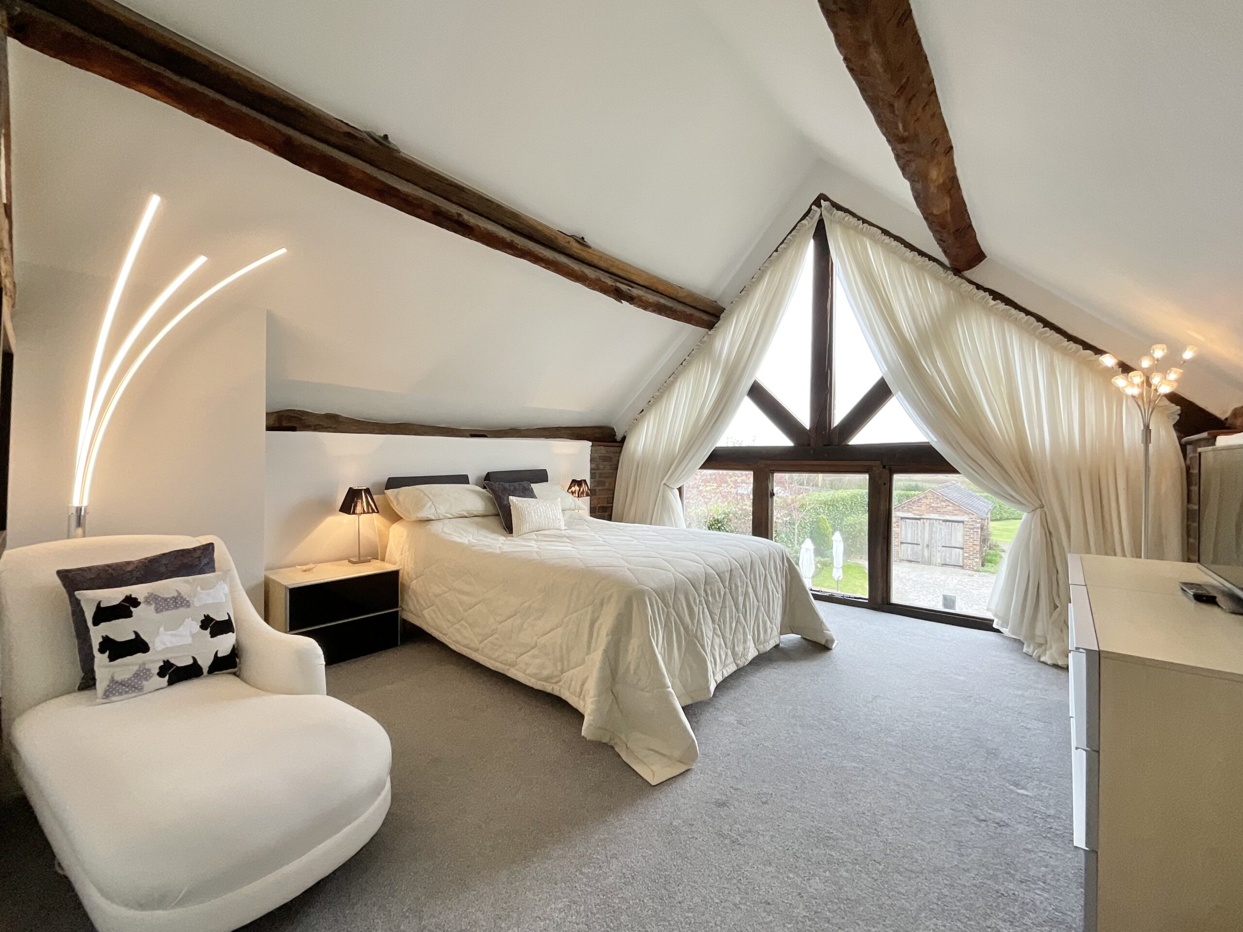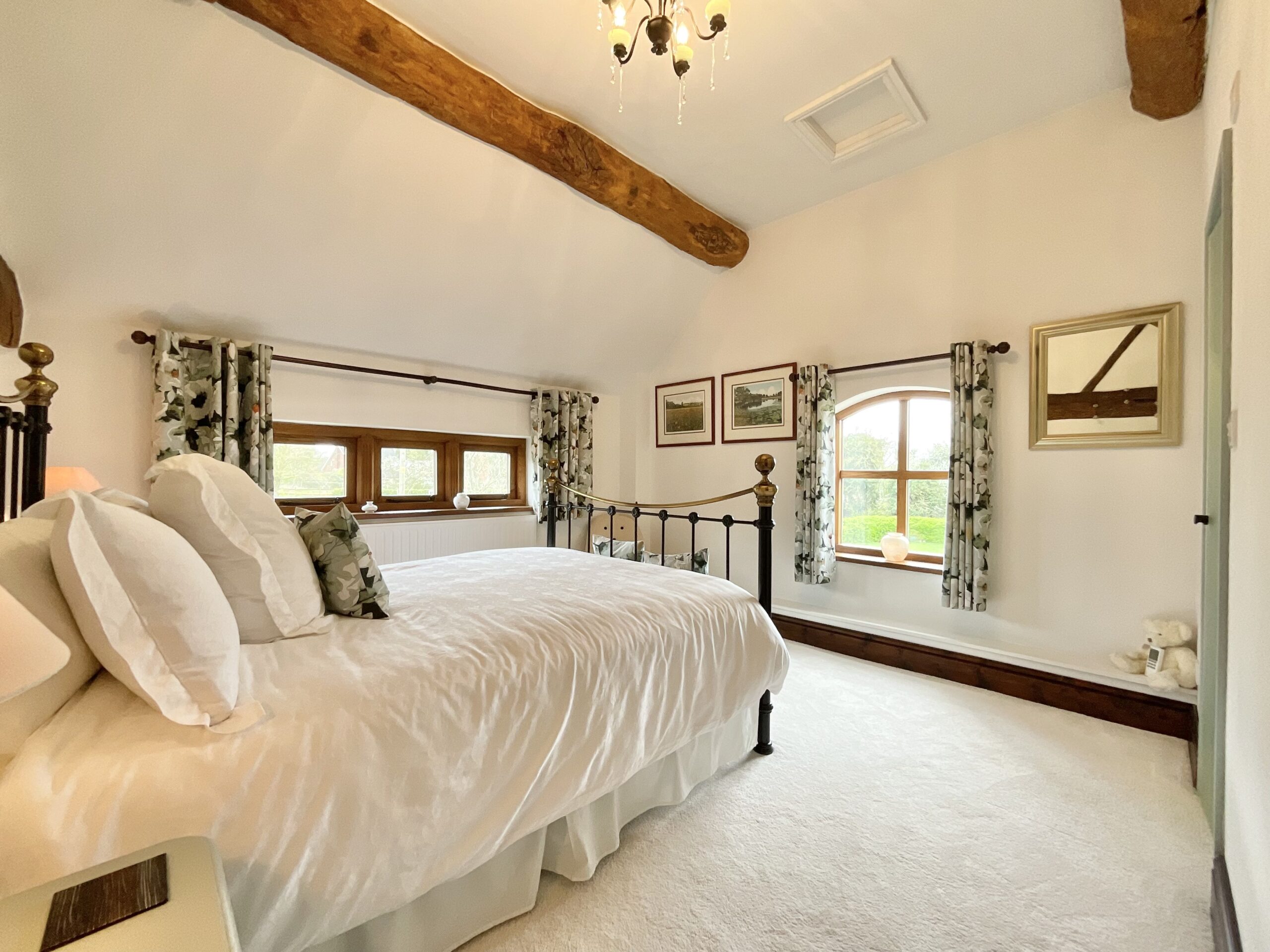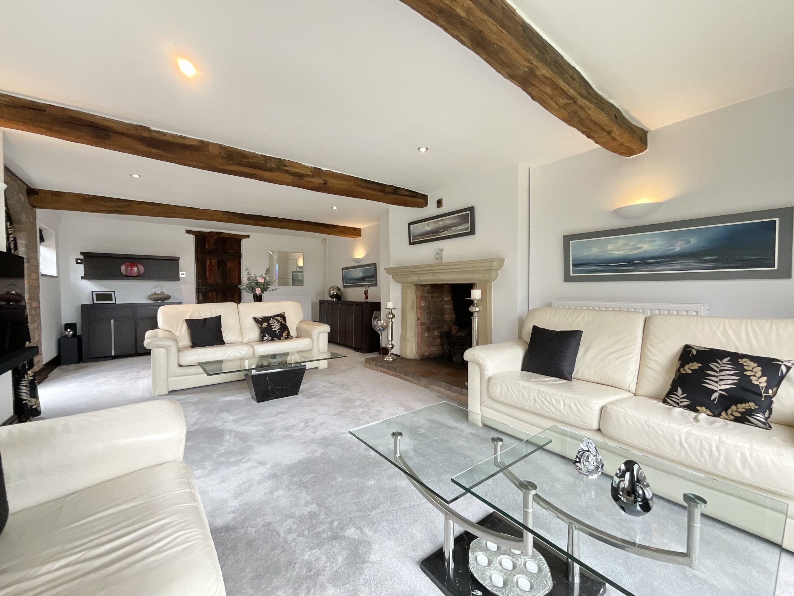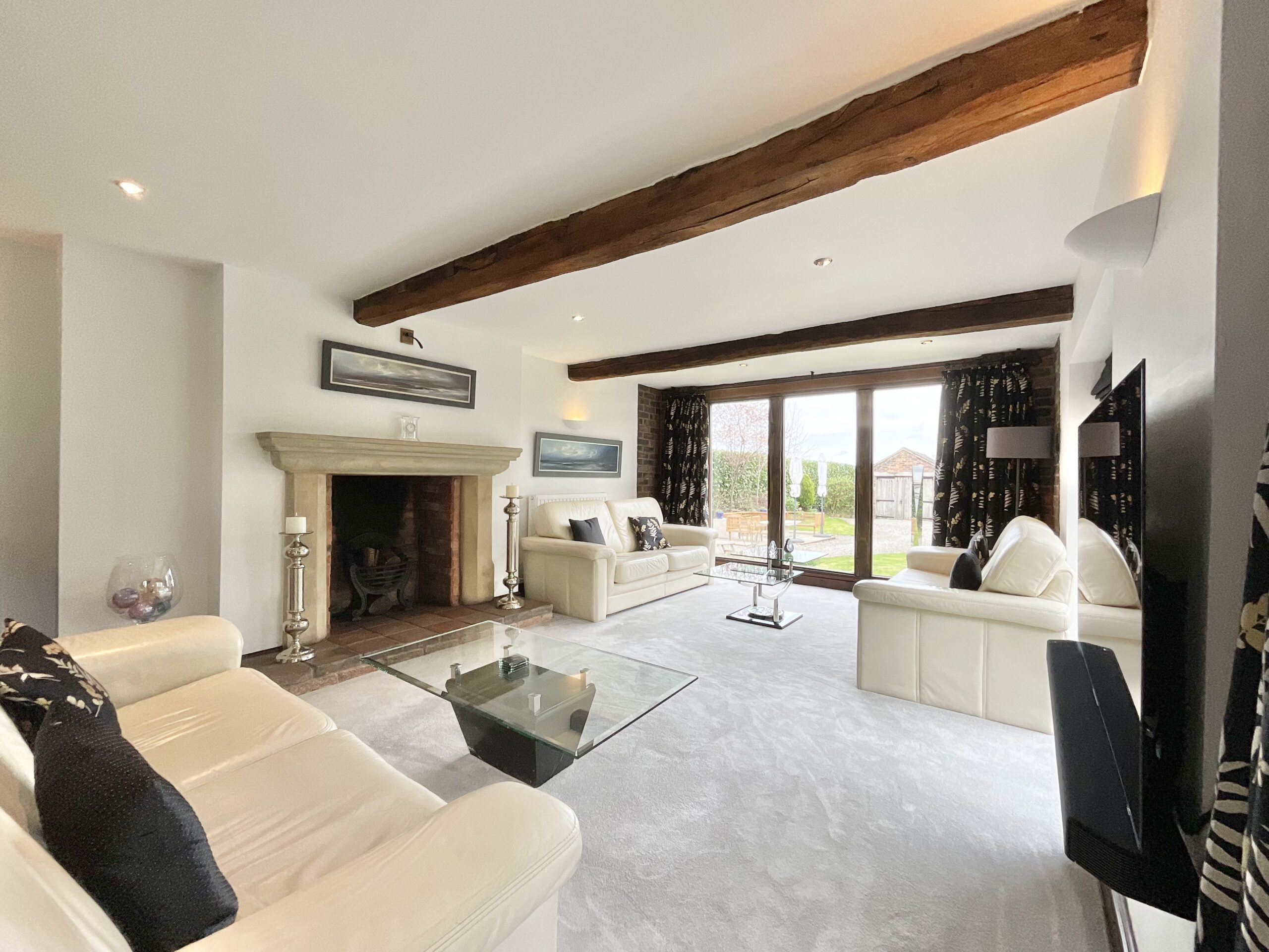 - A characterful barn conversion dating to 1863, featuring original elm doors, oak windows, and striking exposed structural beams throughout.