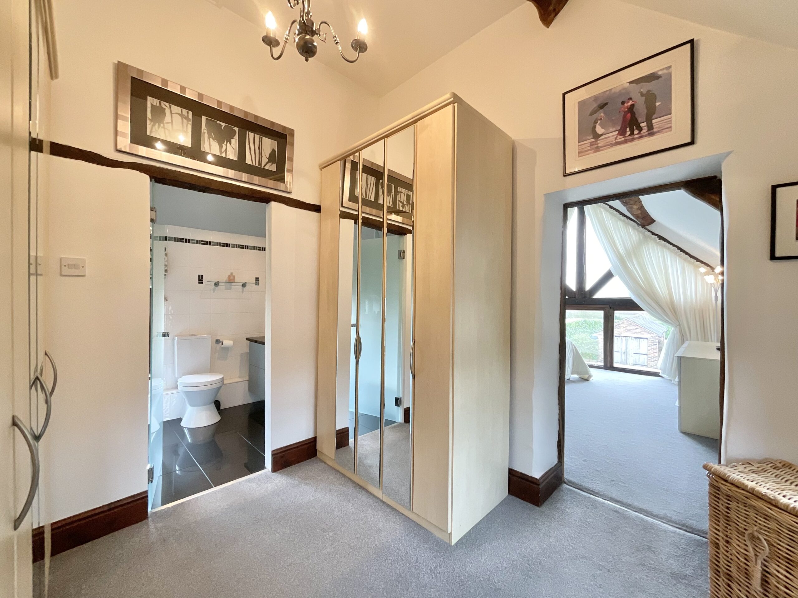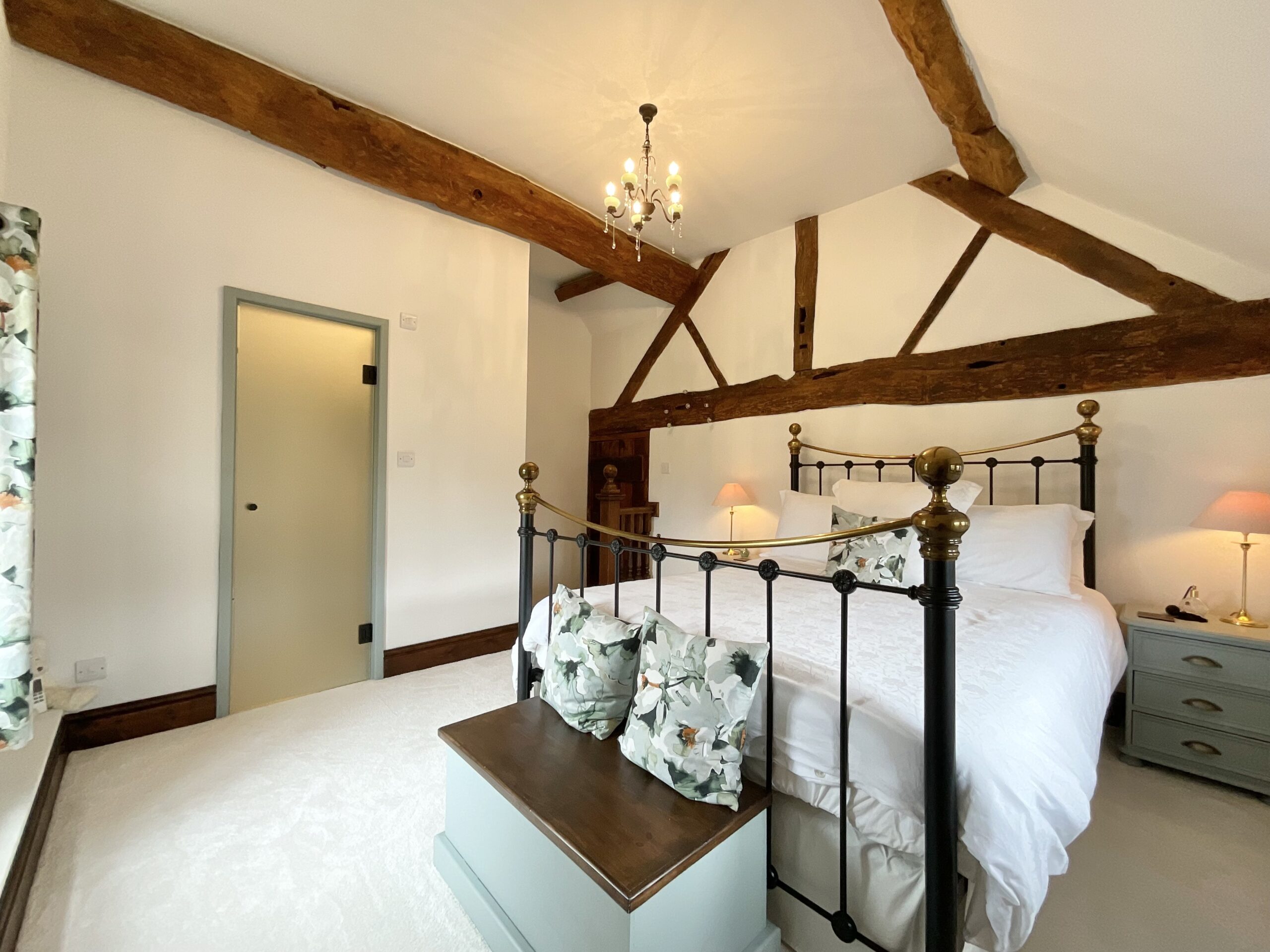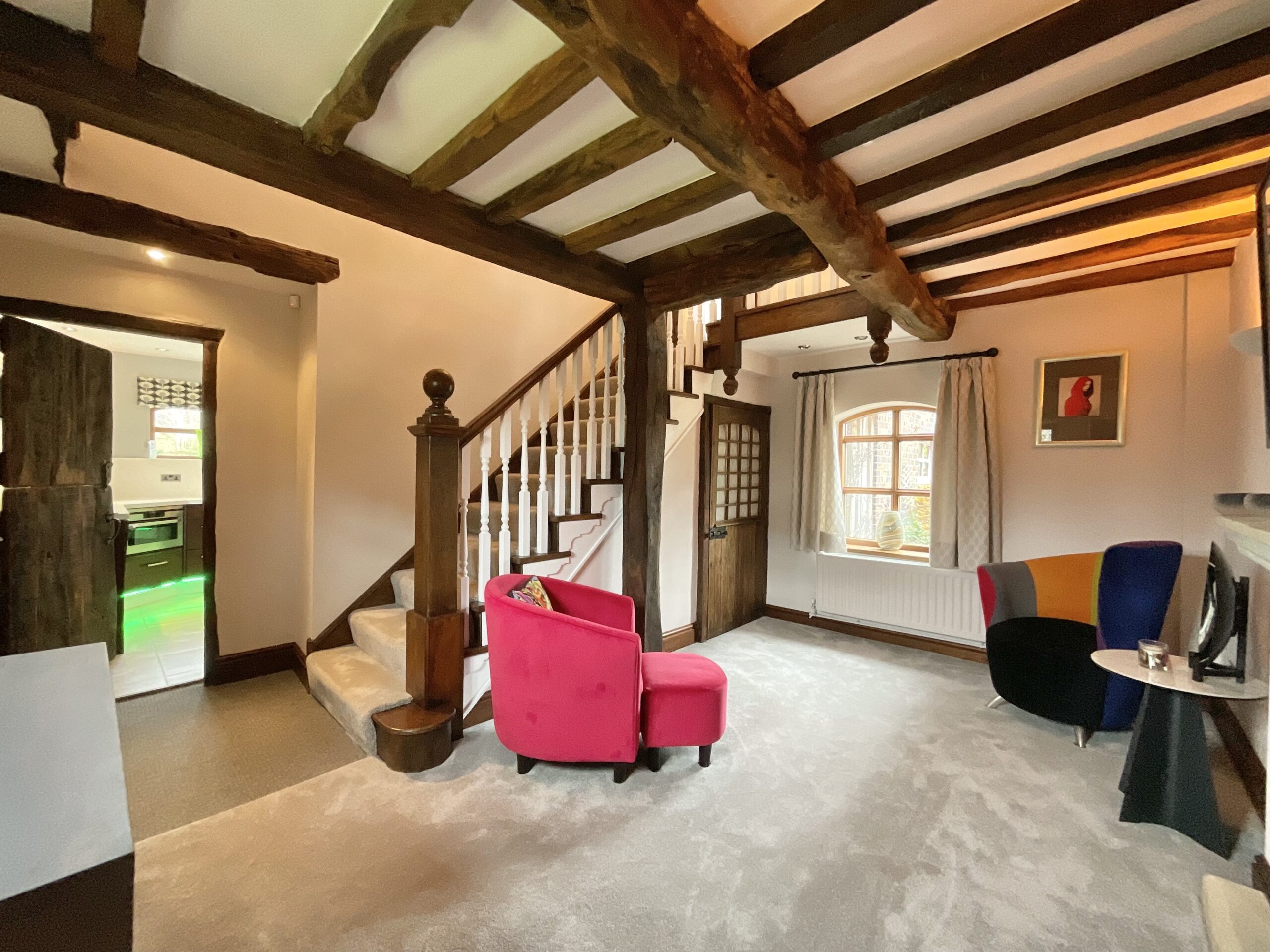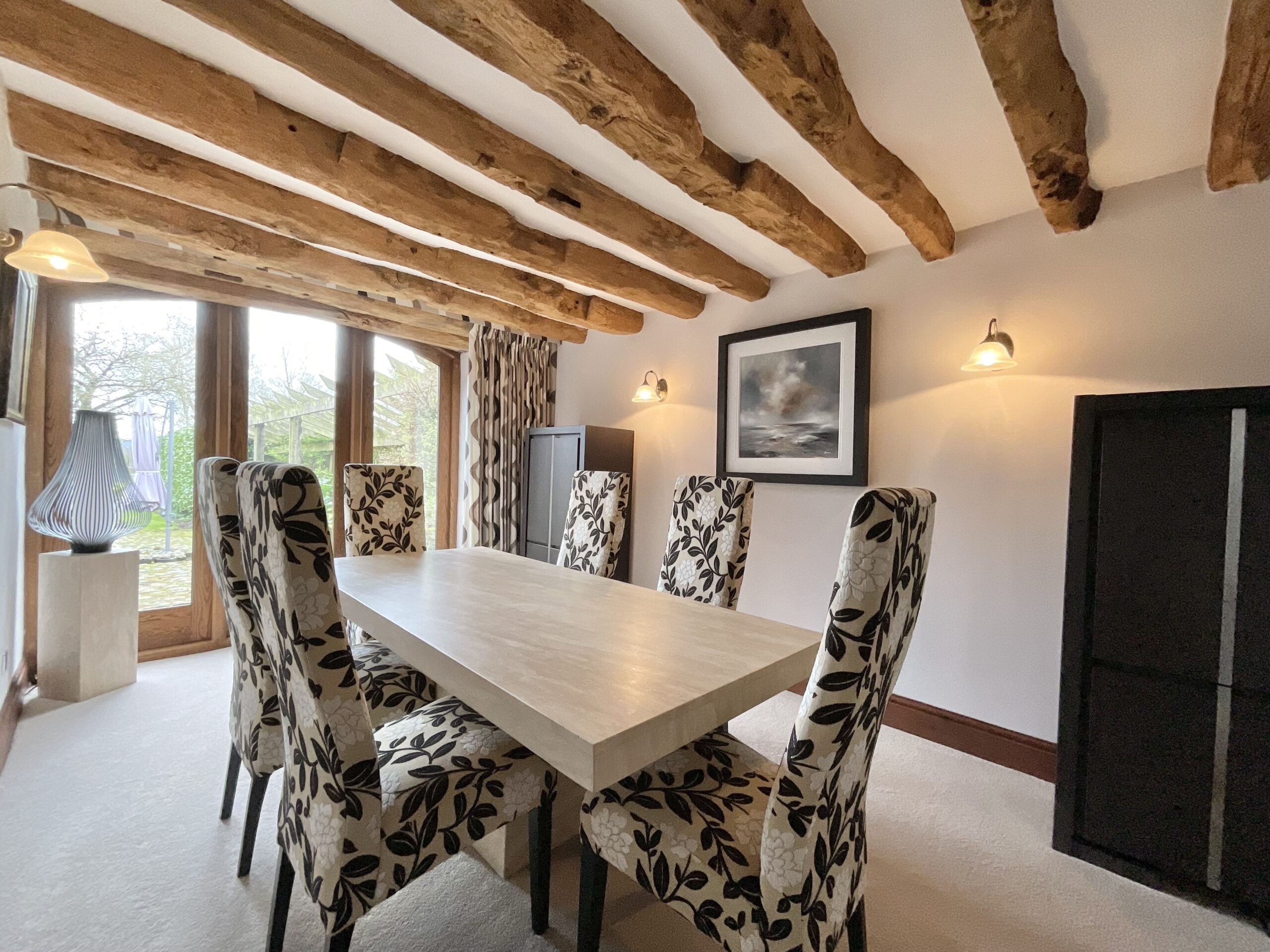 From the moment you step inside, the home’s heritage is immediately apparent. Beautifully preserved, over 100-year-old elm wood doors run throughout, complemented by solid oak-framed, double-glazed windows and glazed doors that enhance both warmth, energy efficiency, and authenticity. Exposed beams feature prominently across the property—almost all of which are structural—creating a sense of integrity and craftsmanship, with only one non-structural beam located in the master bedroom.