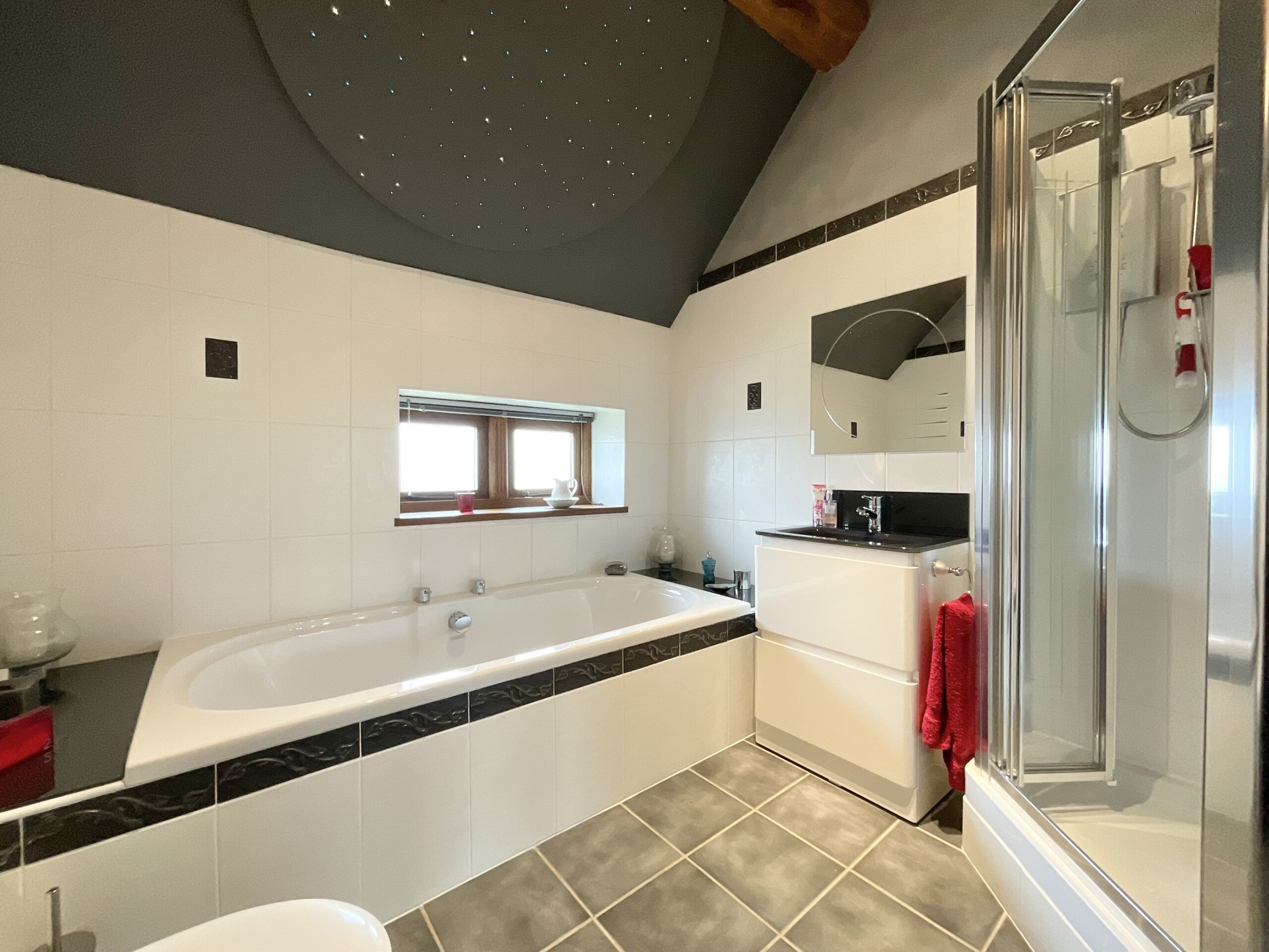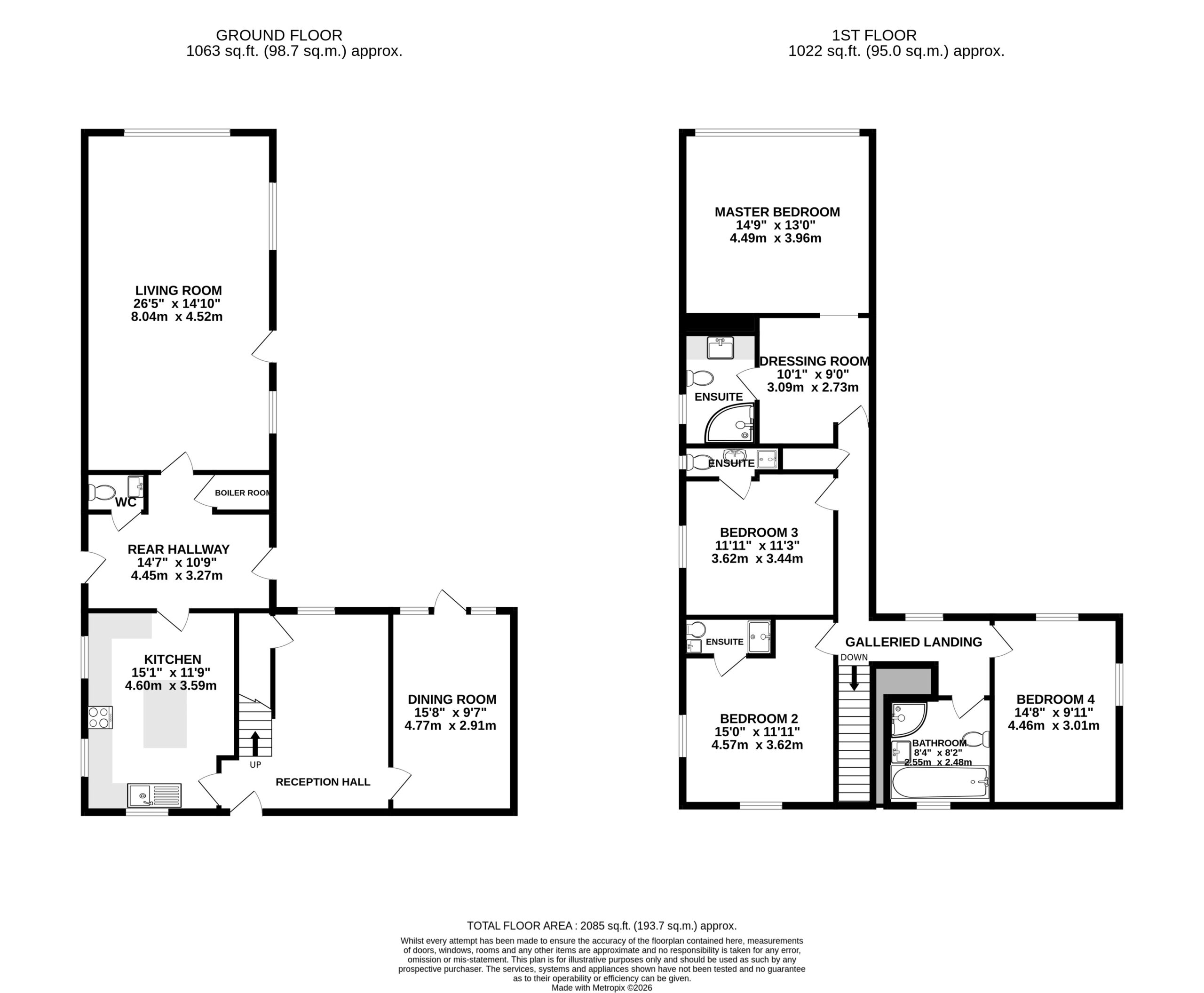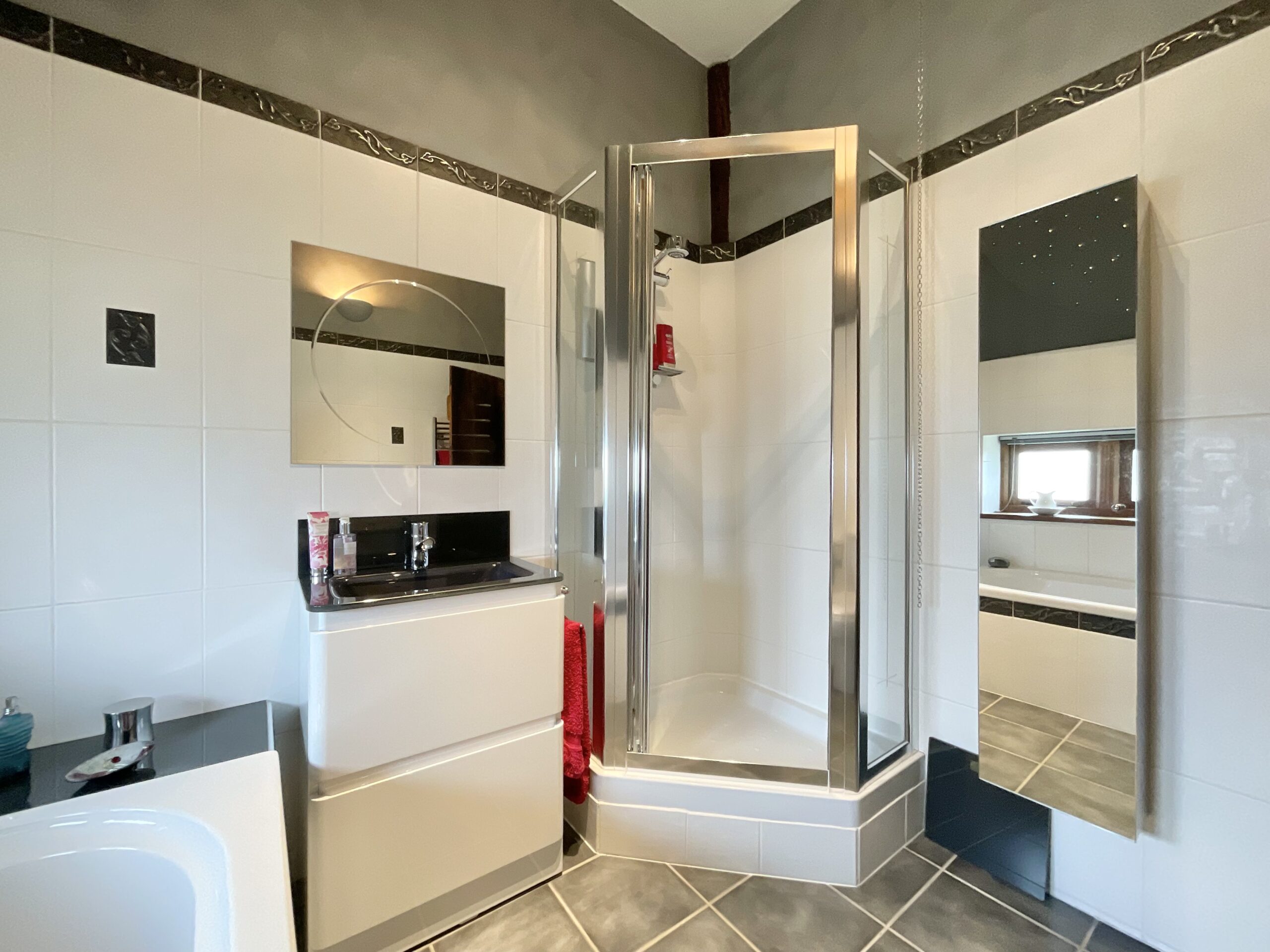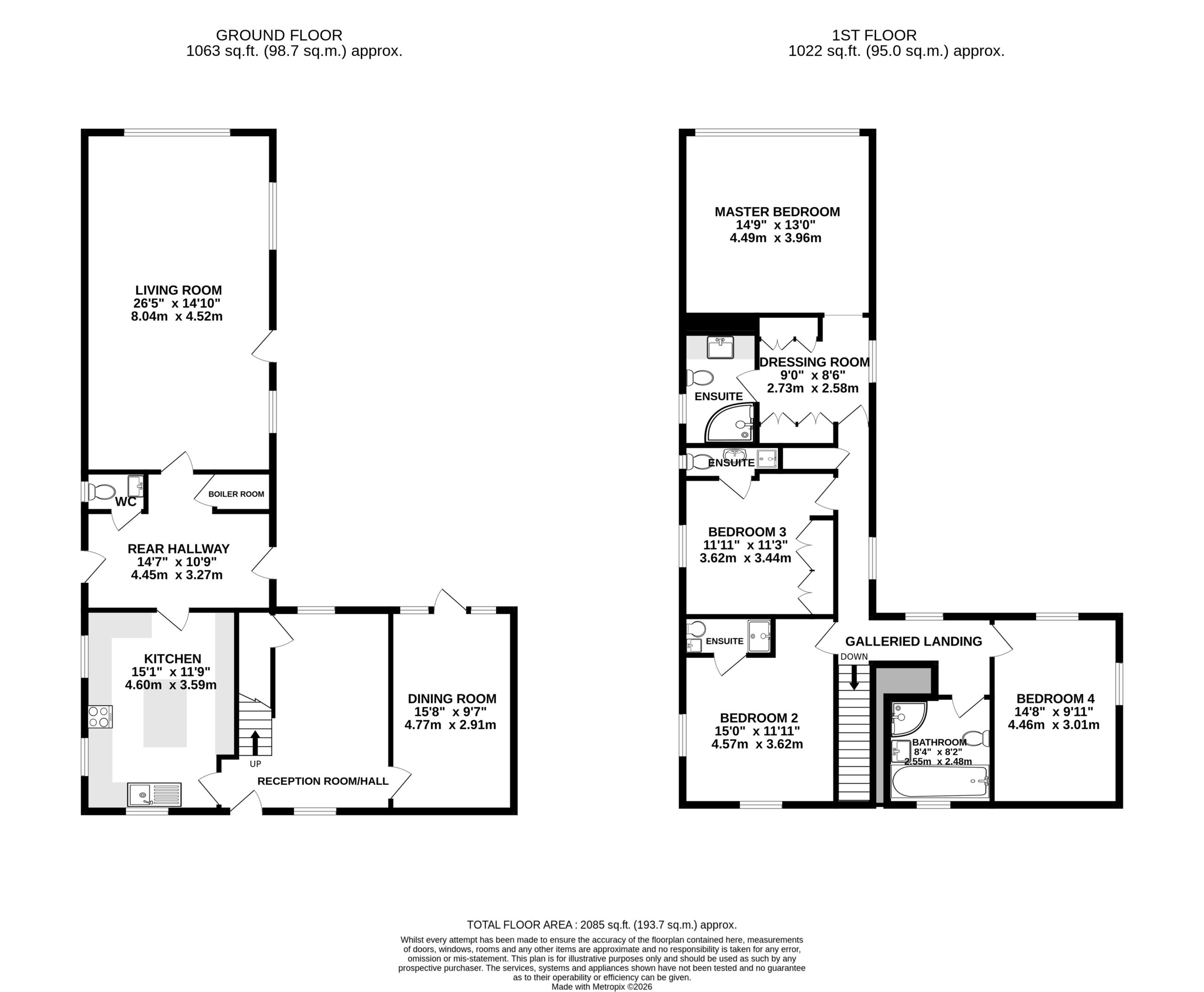 - Four spacious double bedrooms include three ensuites, plus a stylish main bathroom with both a bath and separate shower.