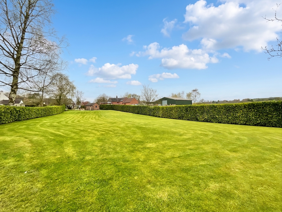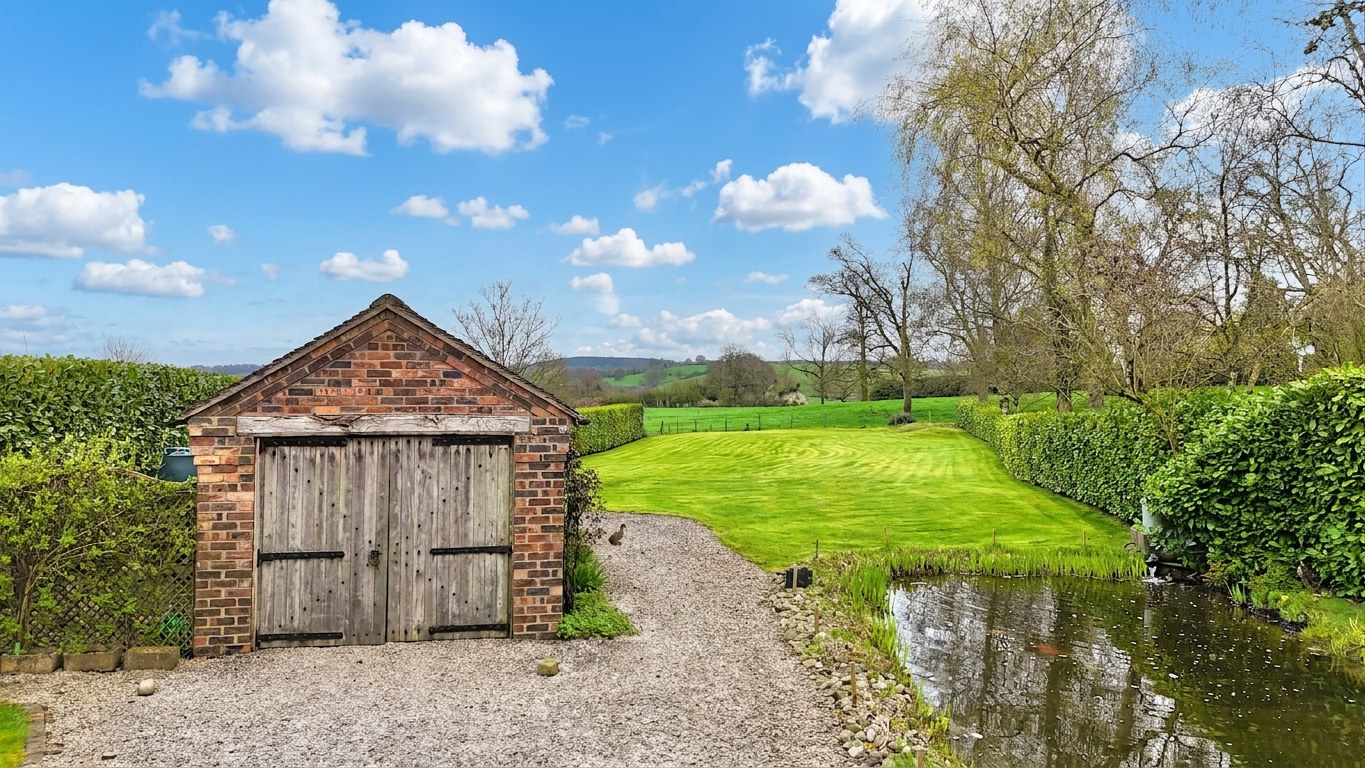 Externally, the property continues to impress. To the front, there is ample parking for at least four vehicles, with additional space accessible through side gates—ideal for larger households or visitors. The expansive rear garden, set within the half-acre plot, provides a peaceful and private setting, predominantly laid to lawn and perfectly positioned to take full advantage of the surrounding countryside views. Two designated seating areas offer ideal spots for outdoor dining or relaxation at different times of day, while a charming pond adds to the tranquil atmosphere. A garage provides additional storage or parking, completing this superb outdoor space.