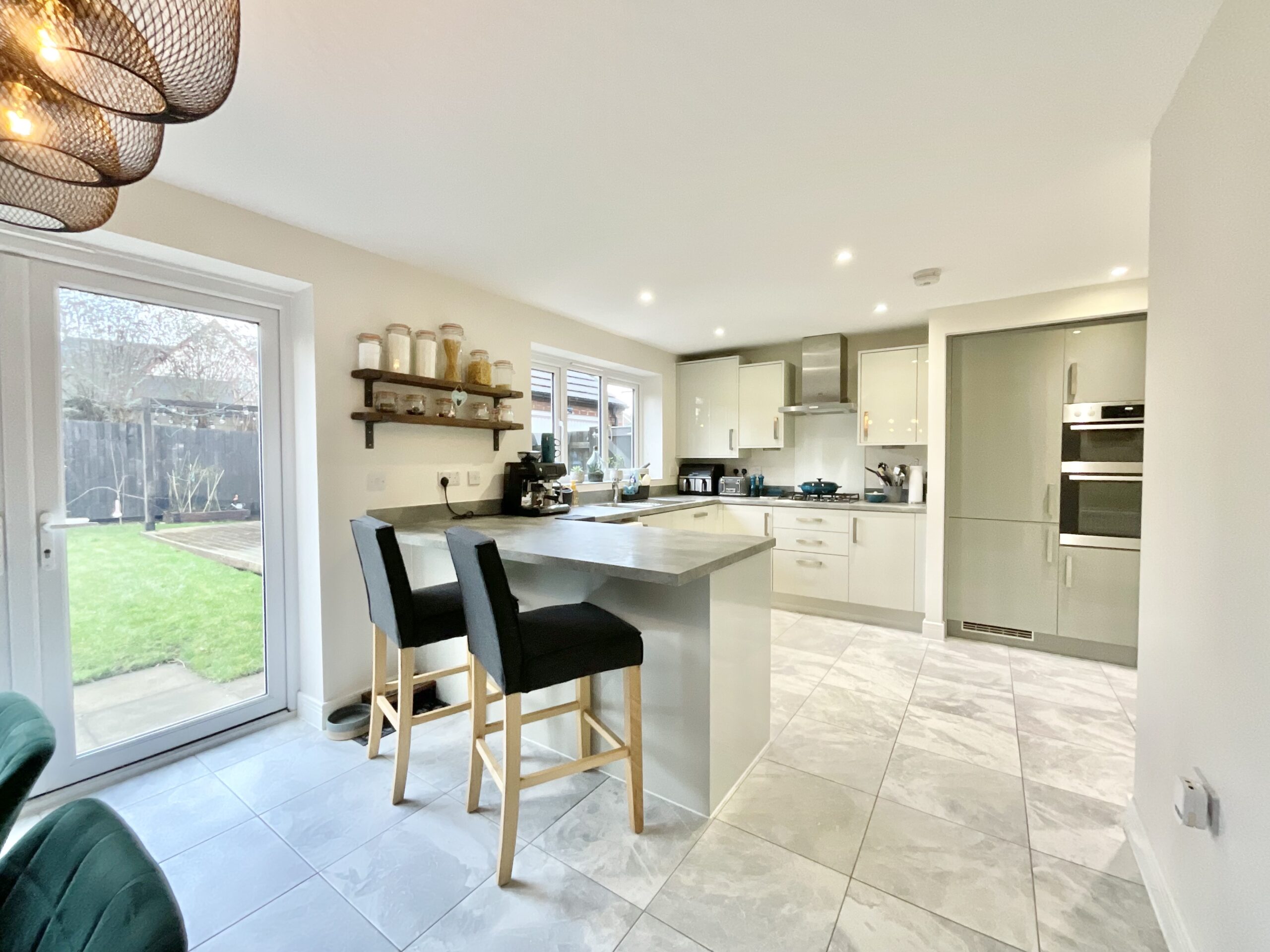 - Bright open-plan kitchen/dining area with a sleek U-shaped kitchen with matching cabinetry, a breakfast bar, and dining area. Plus a warm and inviting living room, under-stairs storage, and W/C.