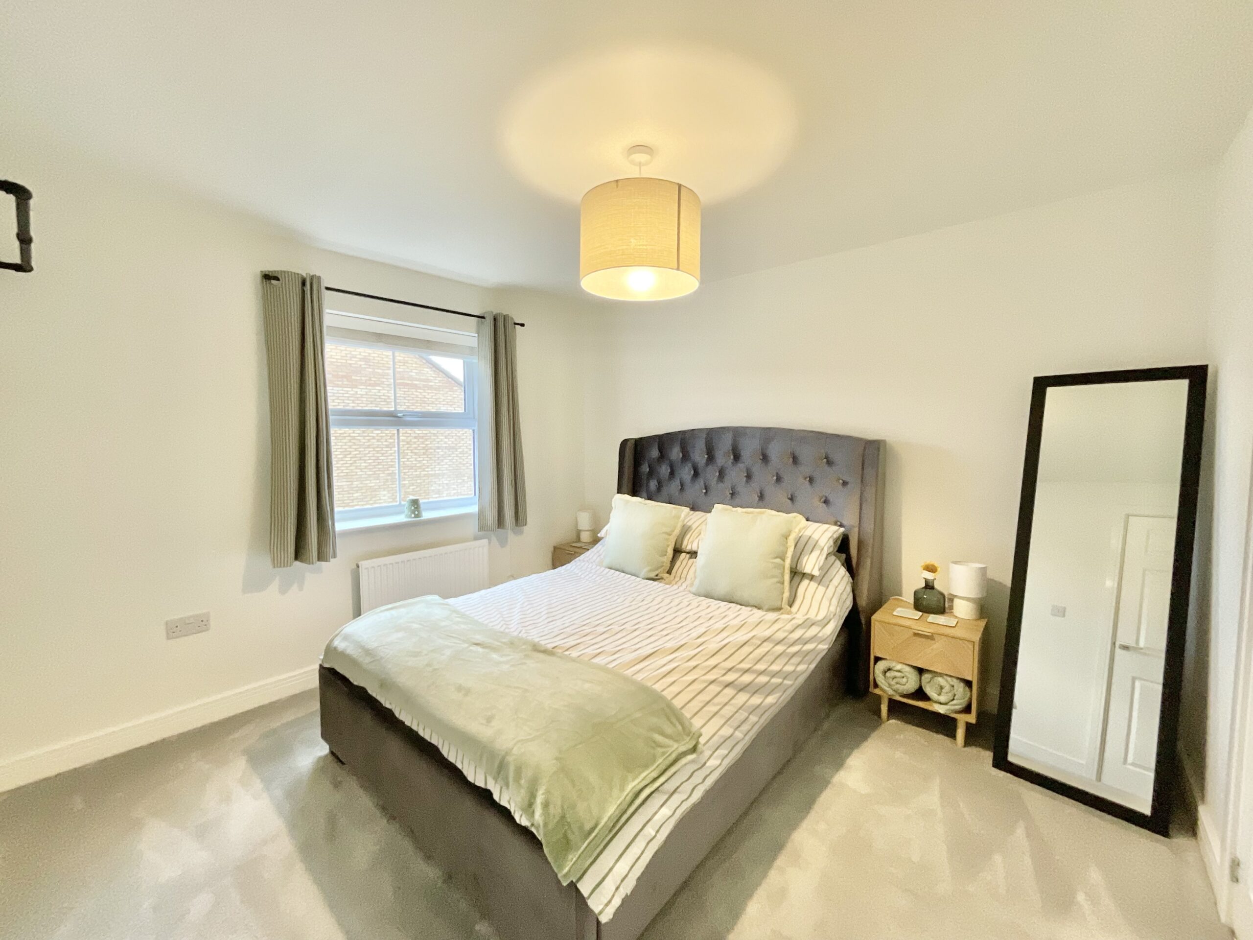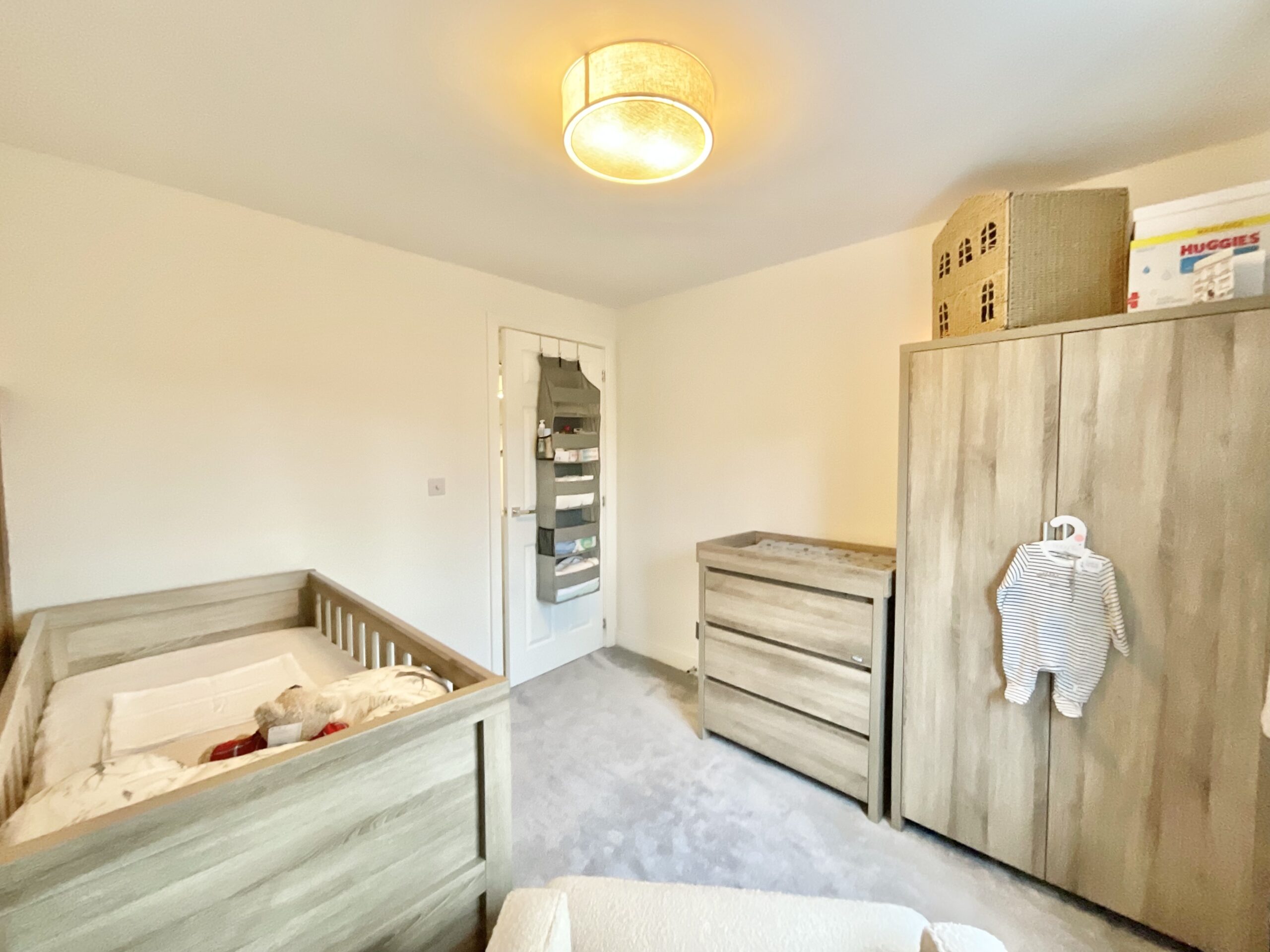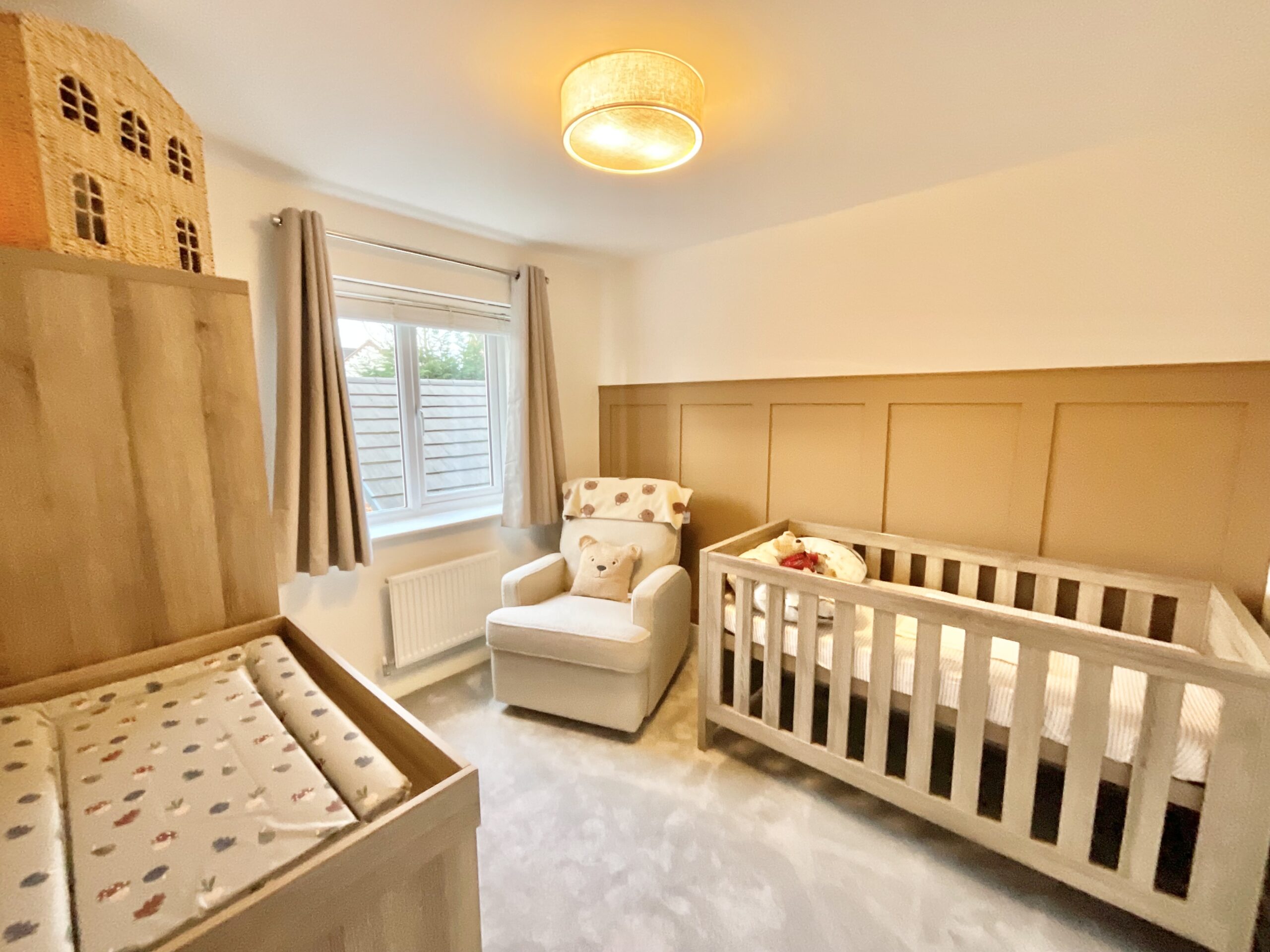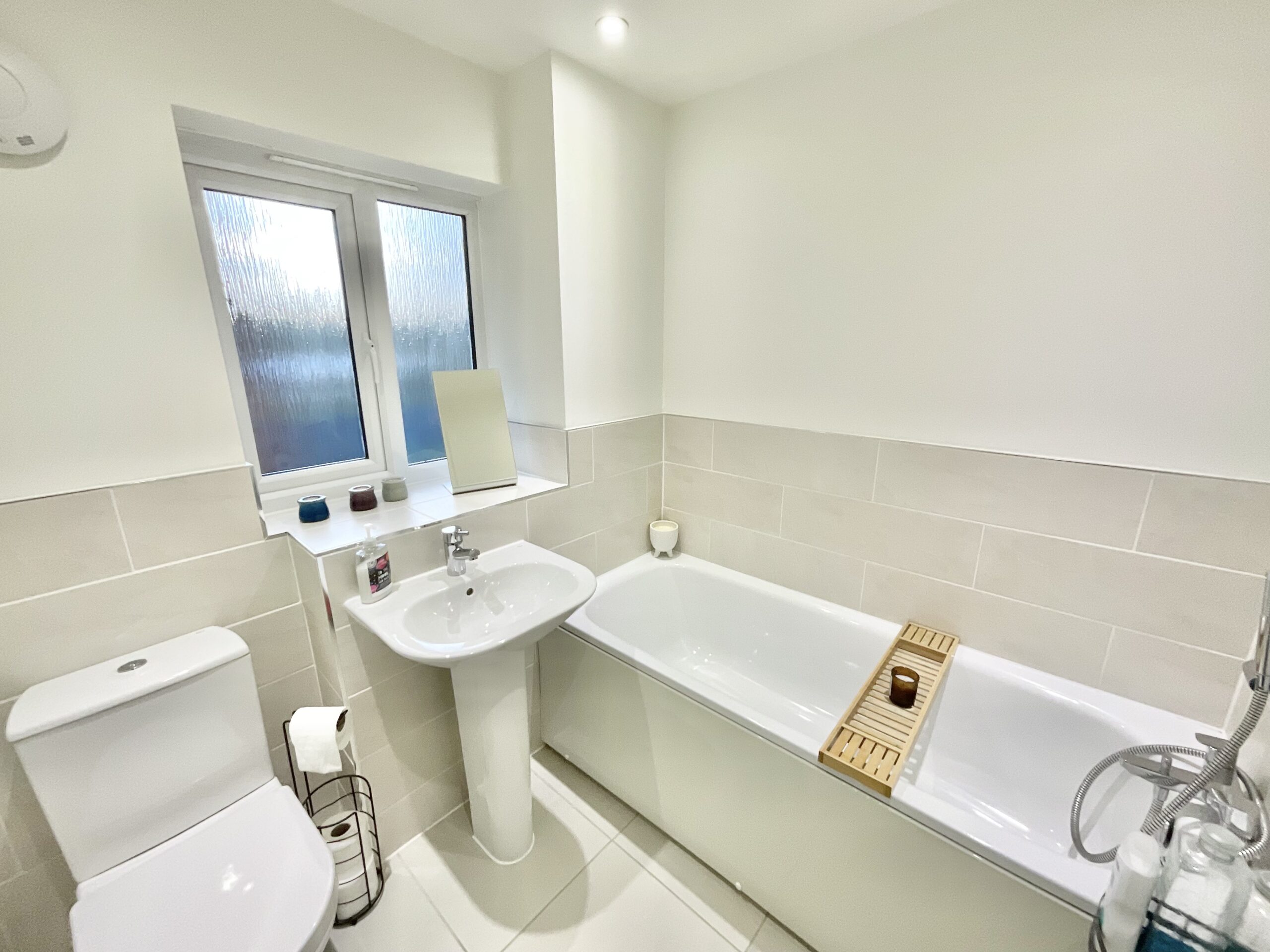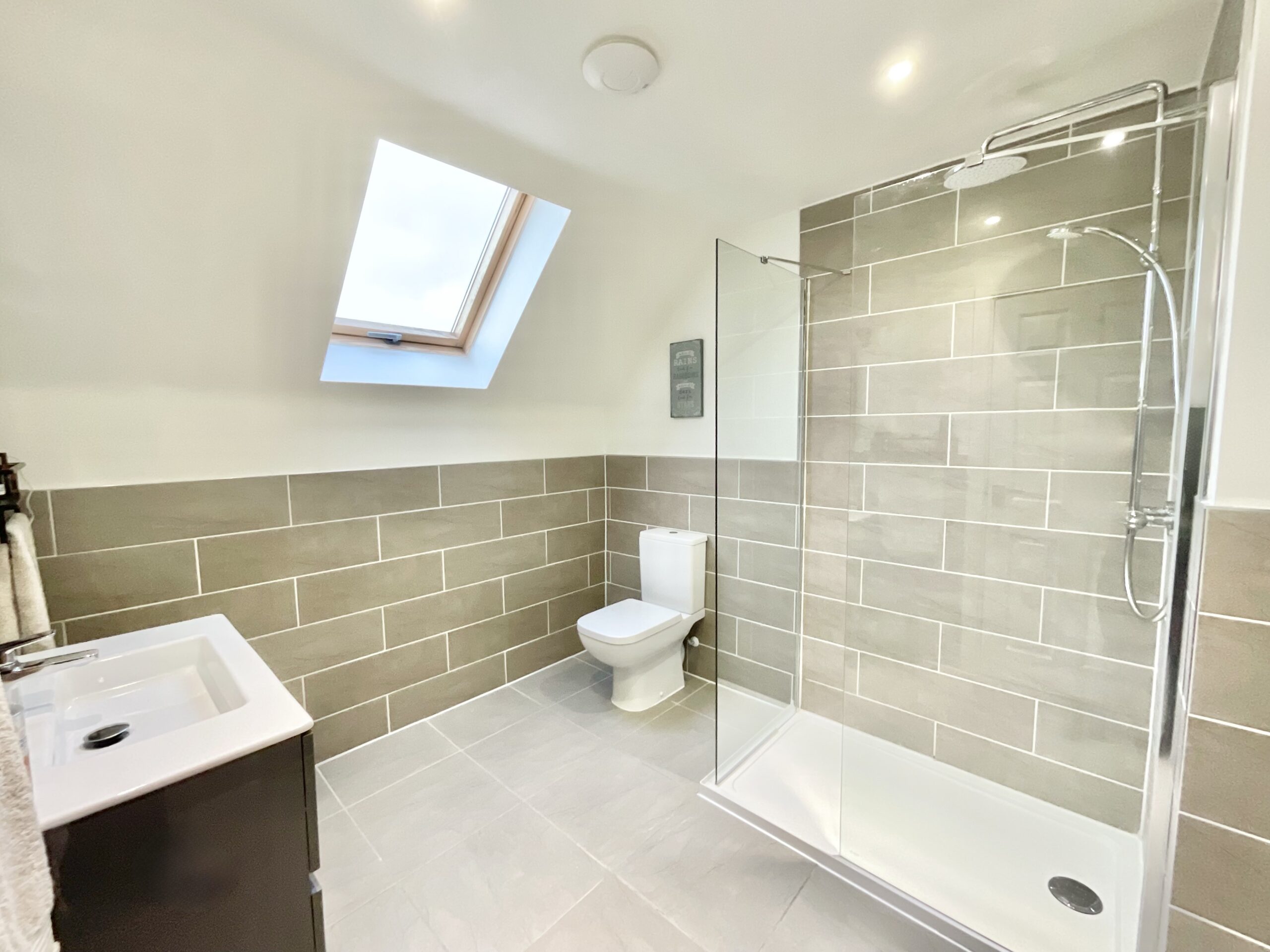 The first floor accommodates four generously sized bedrooms, including one with its own en suite shower room with an upgraded rainfall shower, plus a family bathroom with neutral half-height tiling, a bath, sink, and W/C.