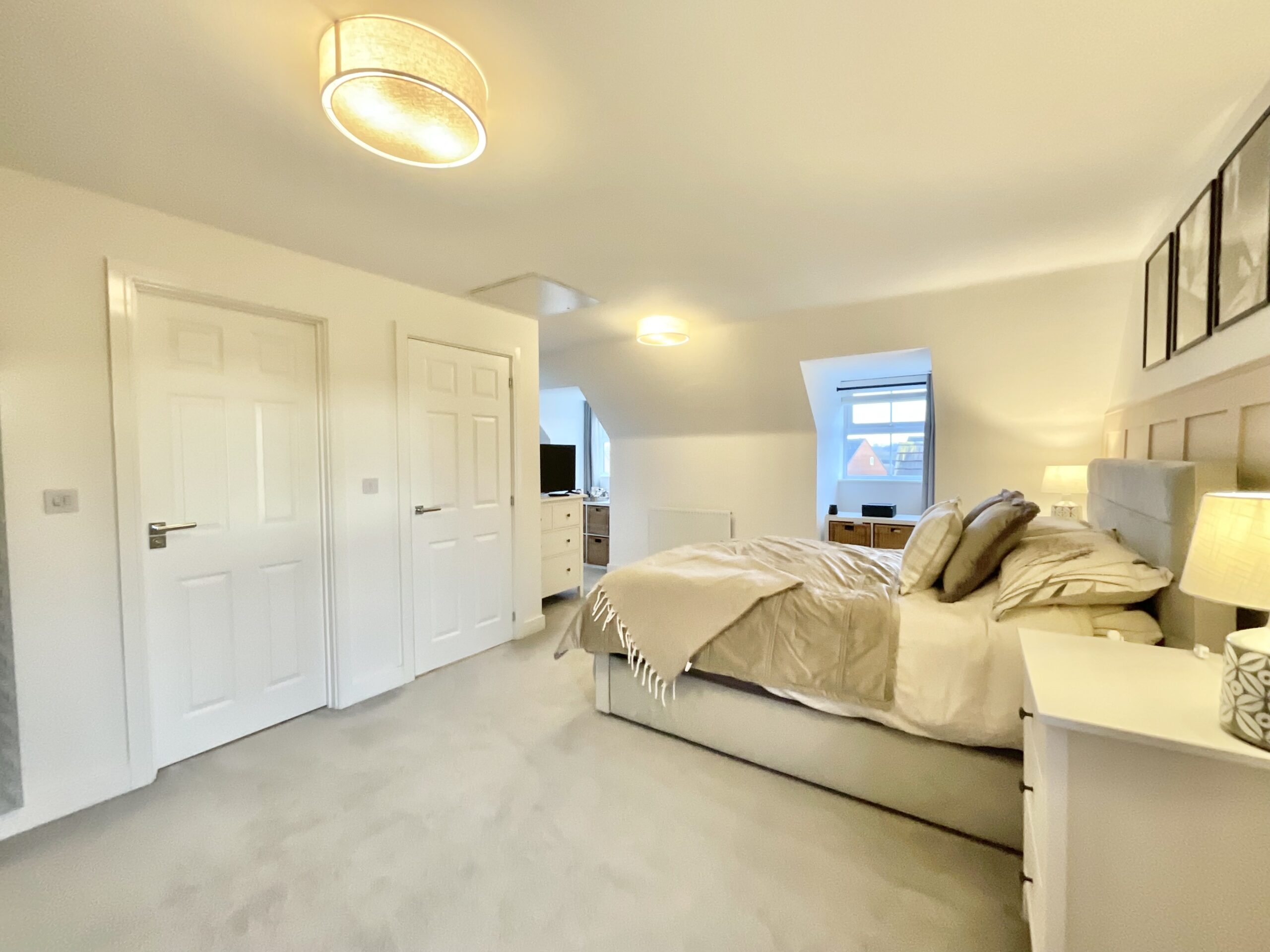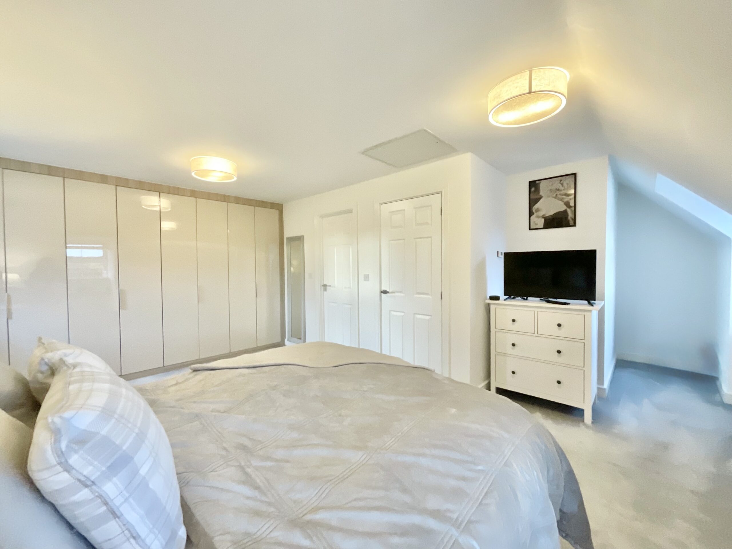 The second floor houses the master bedroom, an expansive suite with fitted wardrobes, dual-aspect windows, and a luxurious en suite shower room with a walk-in rainfall shower, floating sink, and W/C.