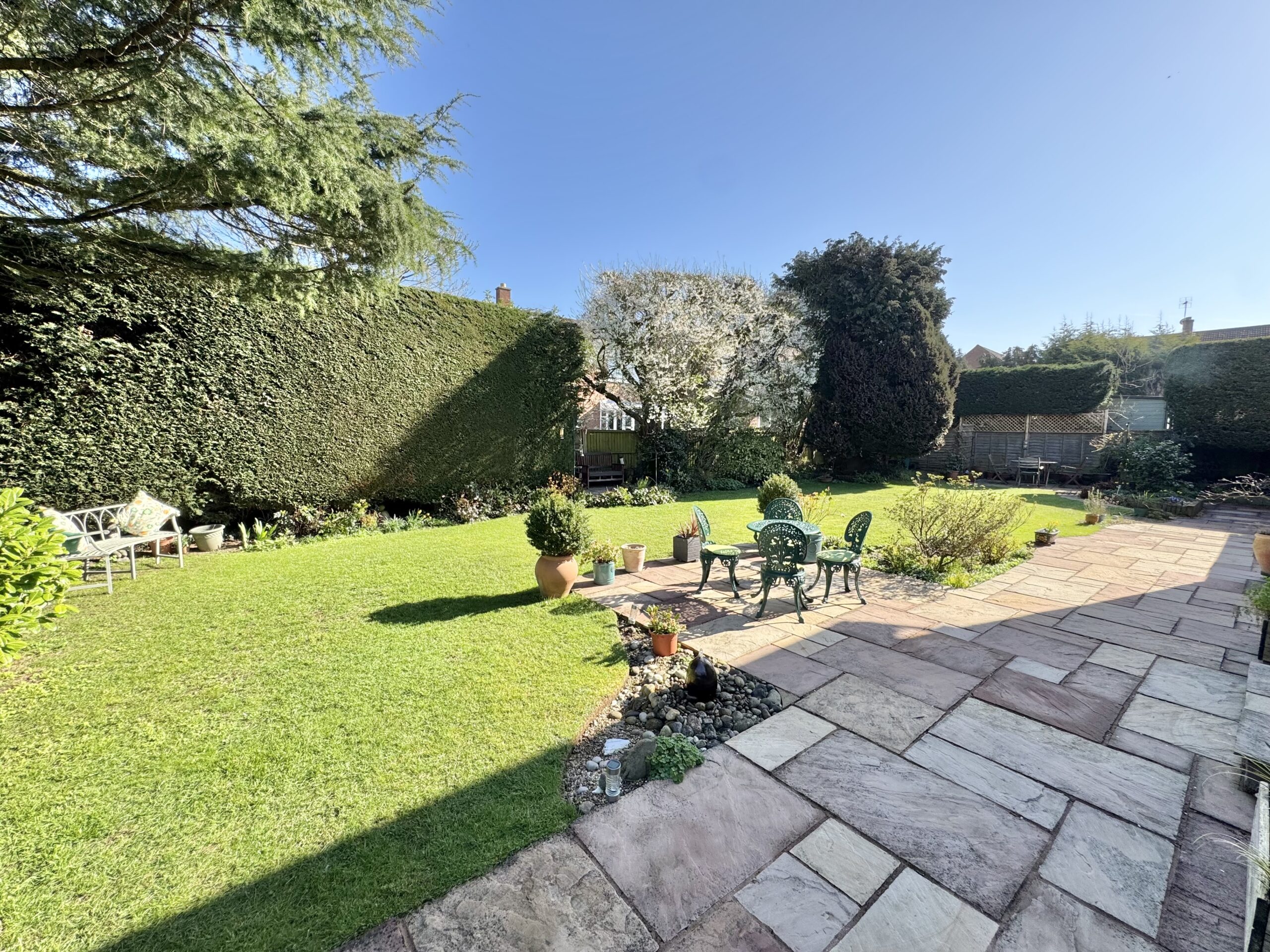 Externally, the property continues to impress. To the rear, a substantial flagged patio spans the full width of the house, creating a superb outdoor entertaining area, surrounded by mature shrubs, hedging, and trees for a private, enclosed feel. Timber fencing borders the garden, with convenient side access on both sides leading to the front, where additional sheds provide useful storage.