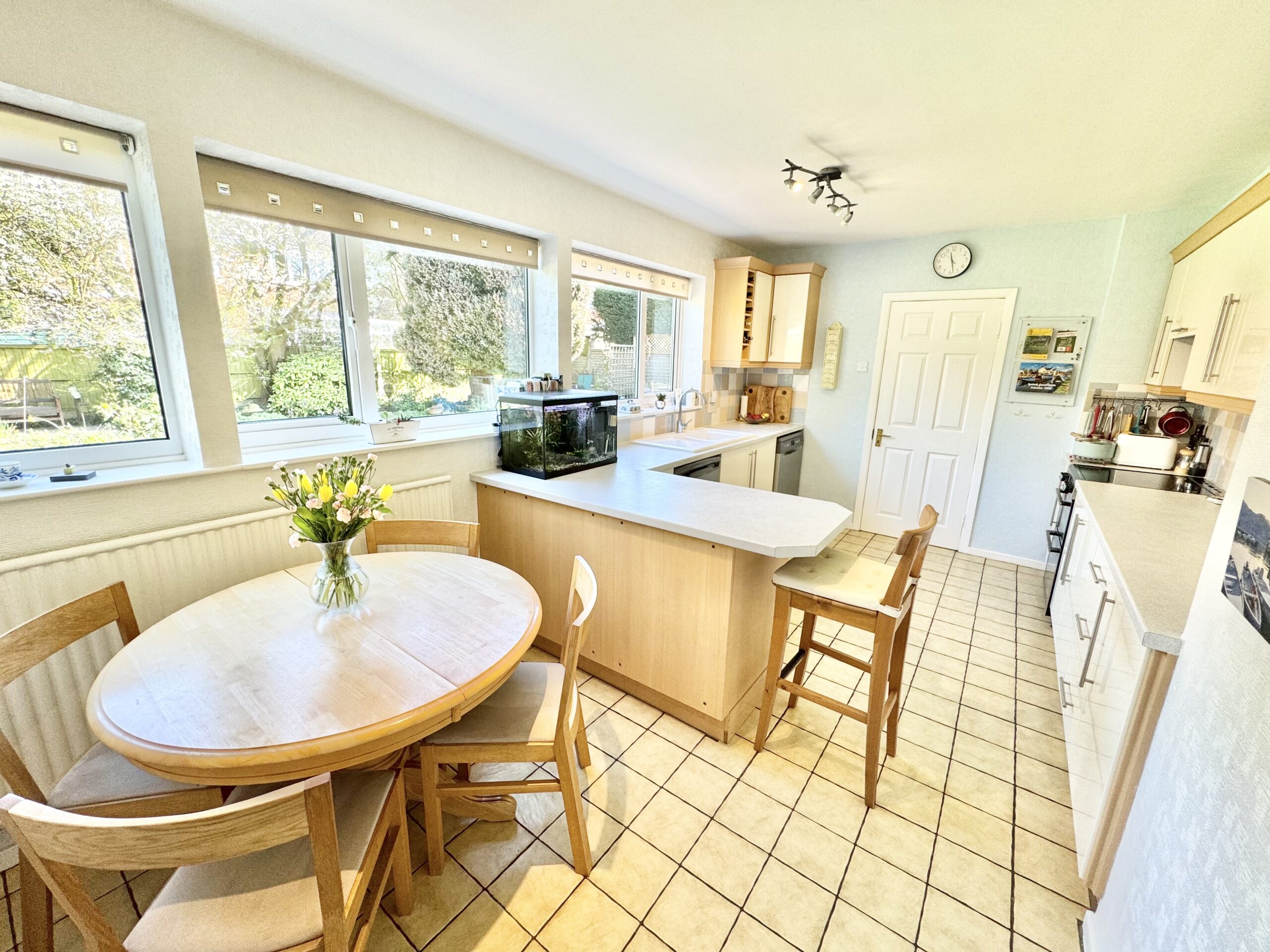 To the front, the dining room enjoys a bright outlook through a double glazed window and benefits from a convenient serving hatch into the kitchen, enhancing the flow for hosting and family meals. The kitchen/breakfast room itself is a fantastic, sociable space, fitted with a range of wall and base units with roll-top work surfaces over, and offering room for a dining table and chairs. Three rear-facing windows flood the room with natural light, while there is ample space for appliances including a cooker, dishwasher, and washing machine, alongside a one-and-a-half bowl ceramic sink with swan neck mixer tap.