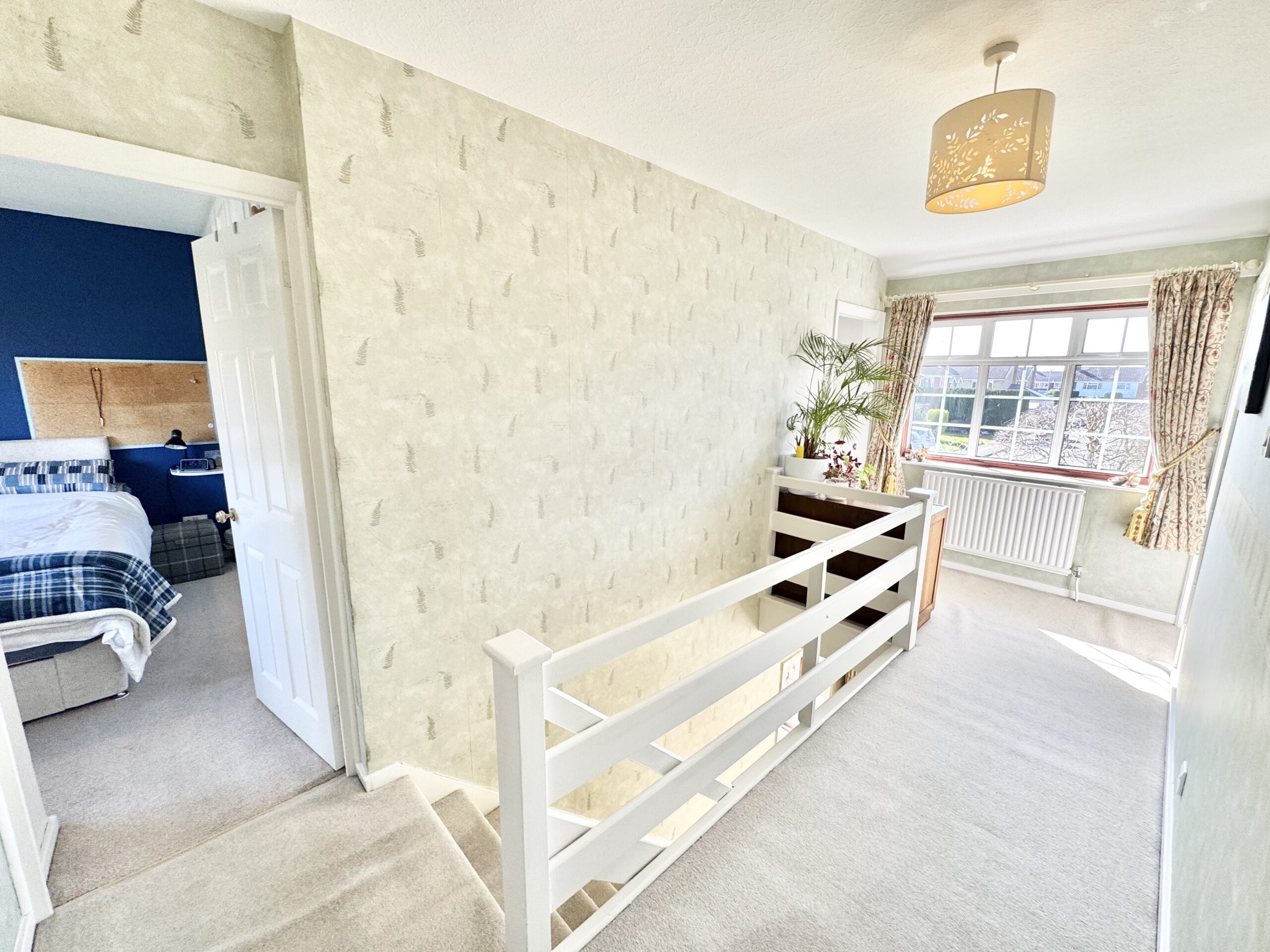 Upstairs, the landing is bright and airy, with a front-facing window, loft access, and doors to all principal rooms. The main bedroom is a generous retreat, complete with triple wardrobes and its own ensuite shower room. Bedroom two is particularly light-filled, benefiting from dual-aspect windows to the front and side. Bedrooms three and four both enjoy rear aspects, with fitted wardrobes, while bedroom four also incorporates a useful desk area and airing cupboard.