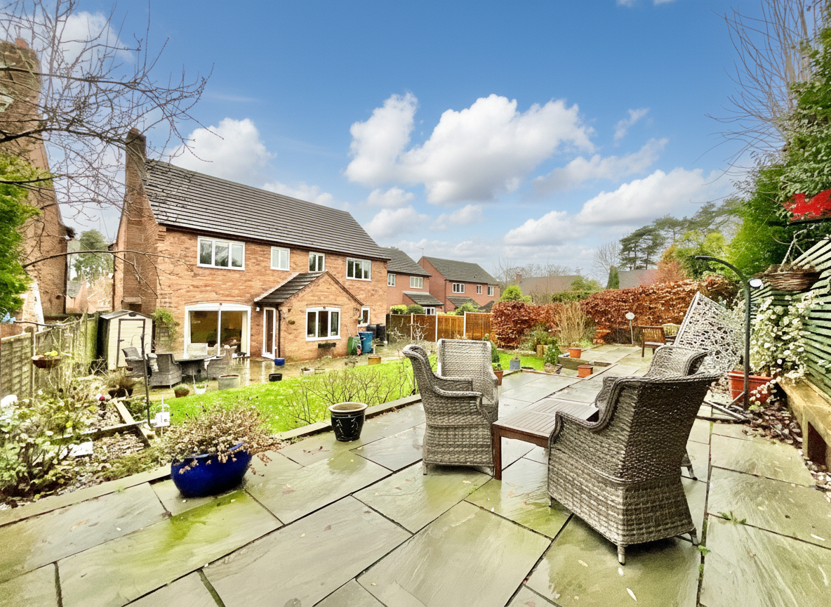 Set within a peaceful pocket of attractive detached homes, the kerb appeal here is undeniable. A well-kept front garden and spacious driveway provide ample off-road parking and lead to a convenient garage. Out back, the generous garden is a true woodland escape offering lush lawn, mature greenery and a tiered patio perfect for alfresco dining, family fun or simply soaking up the peace.