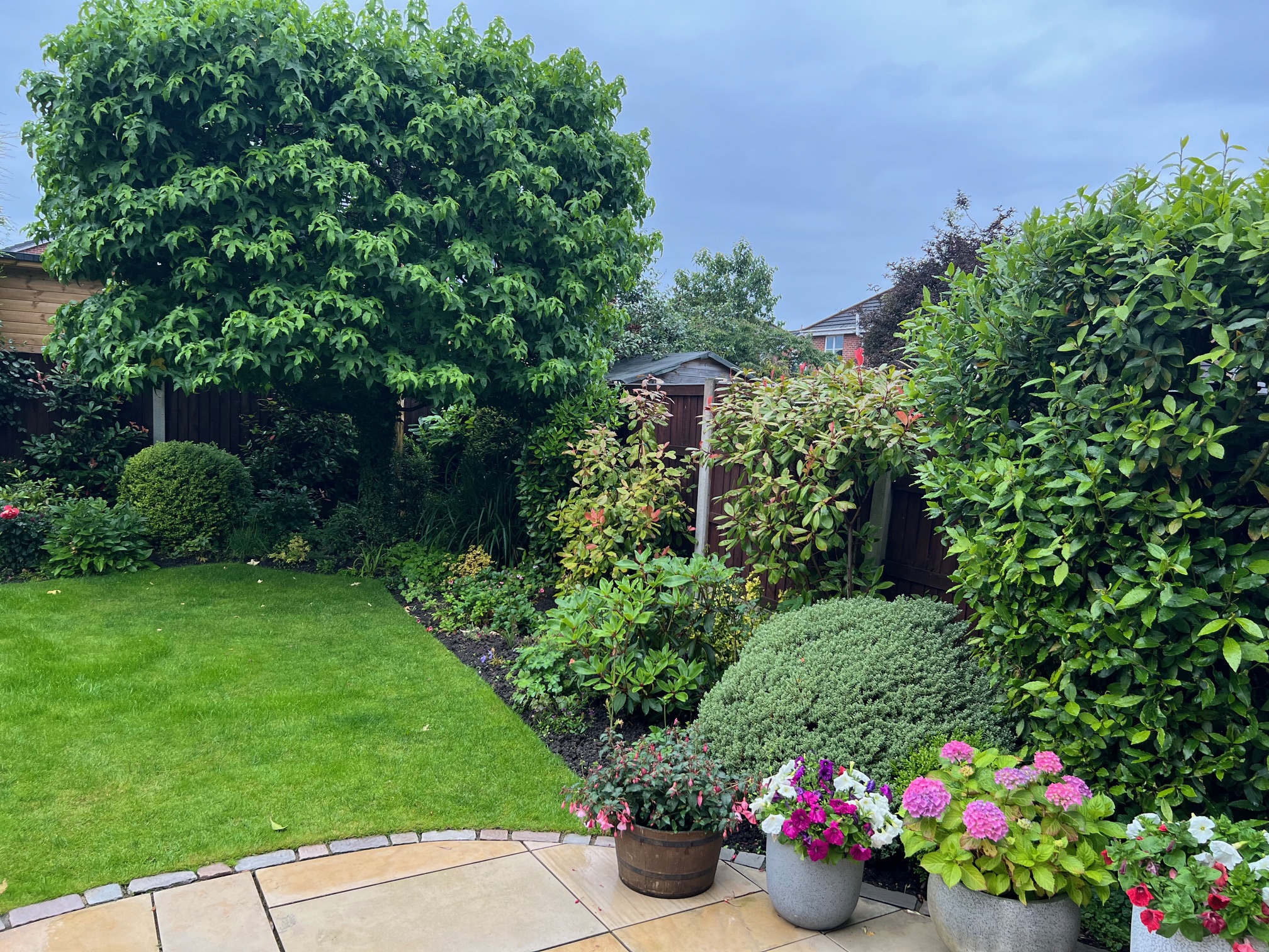 - Landscaped rear garden with patio, lawn, and mature trees and shrubs for privacy