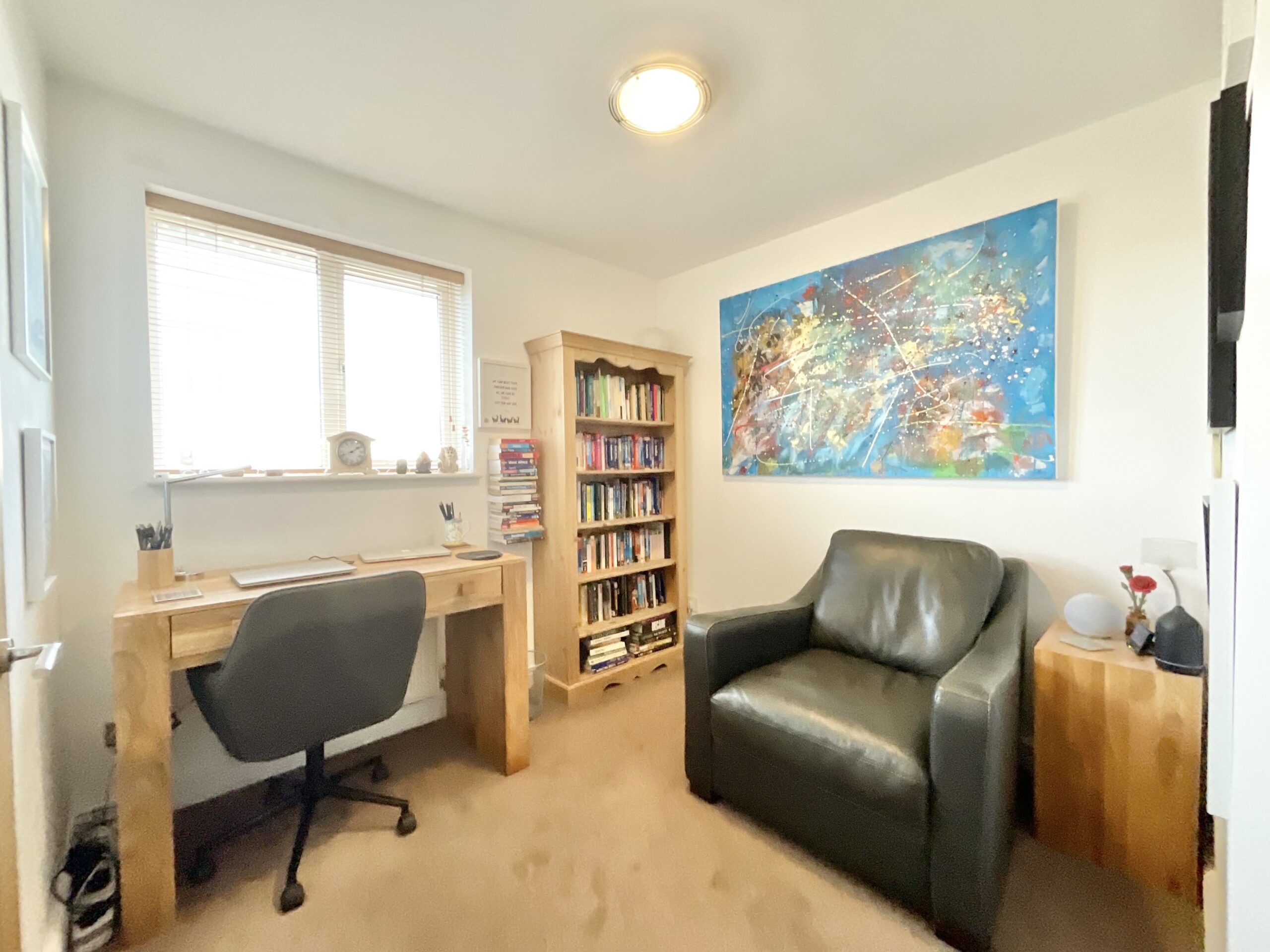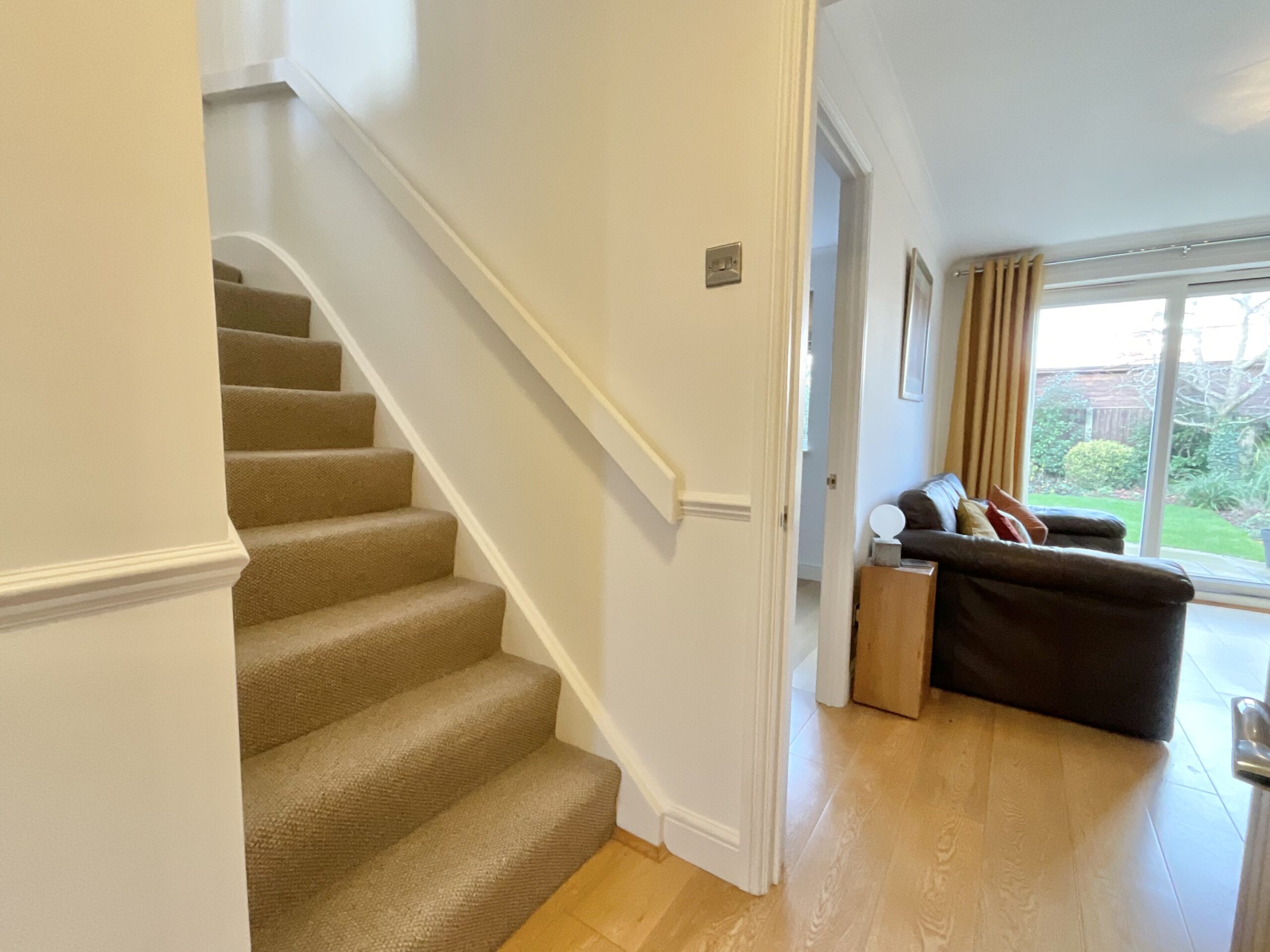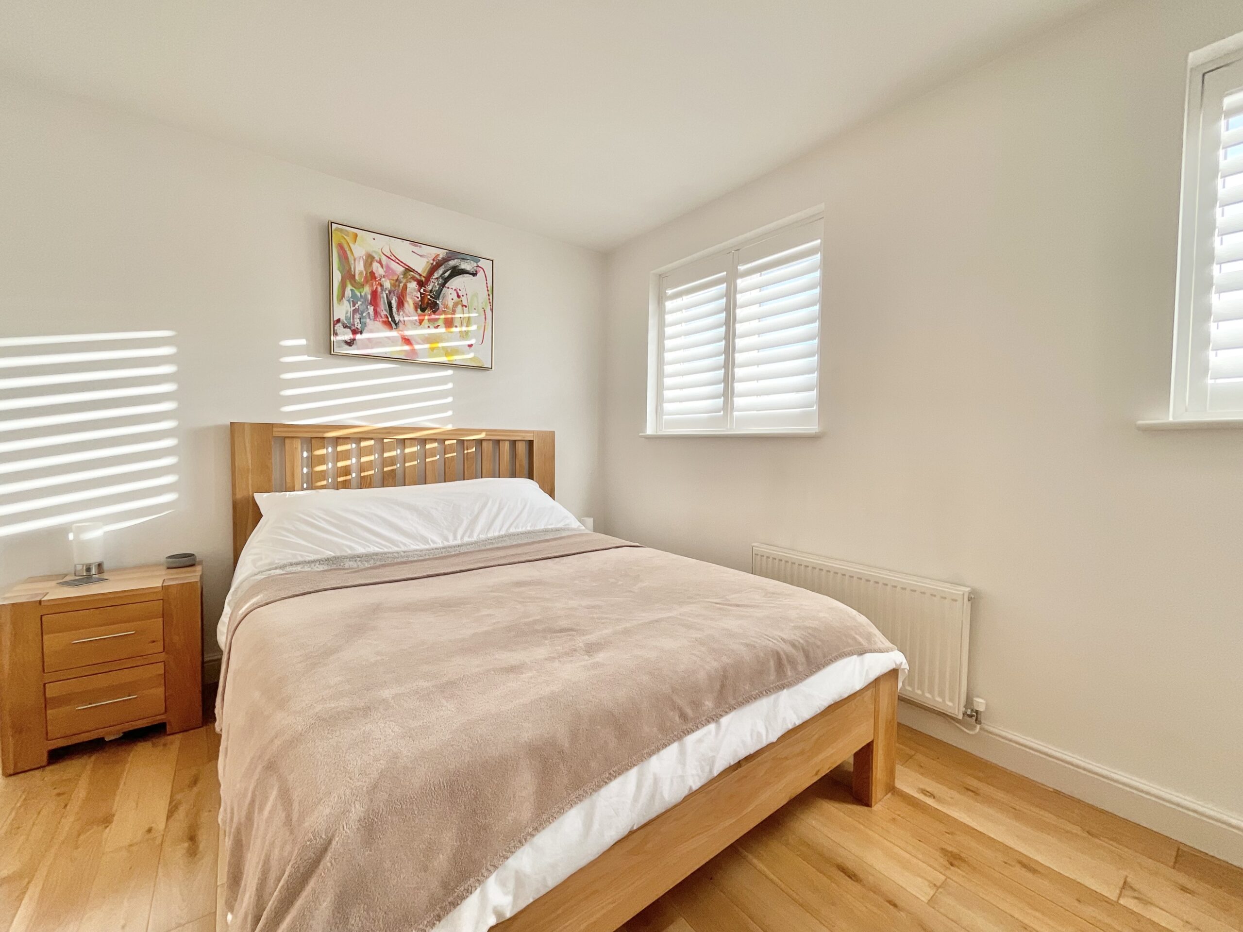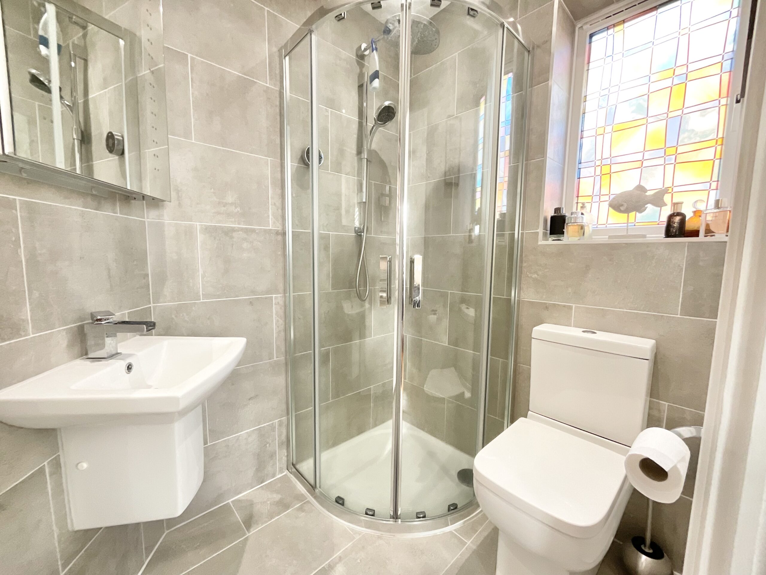 Upstairs, the main bedroom is a standout feature, benefiting from two windows fitted with elegant plantation shutters, built-in wardrobes, and a newly fitted en-suite shower room. Two further bedrooms, both with fitted wardrobes, provide flexible accommodation for children, guests, or home working. The family bathroom has also been recently updated and is finished in a modern, contemporary style.