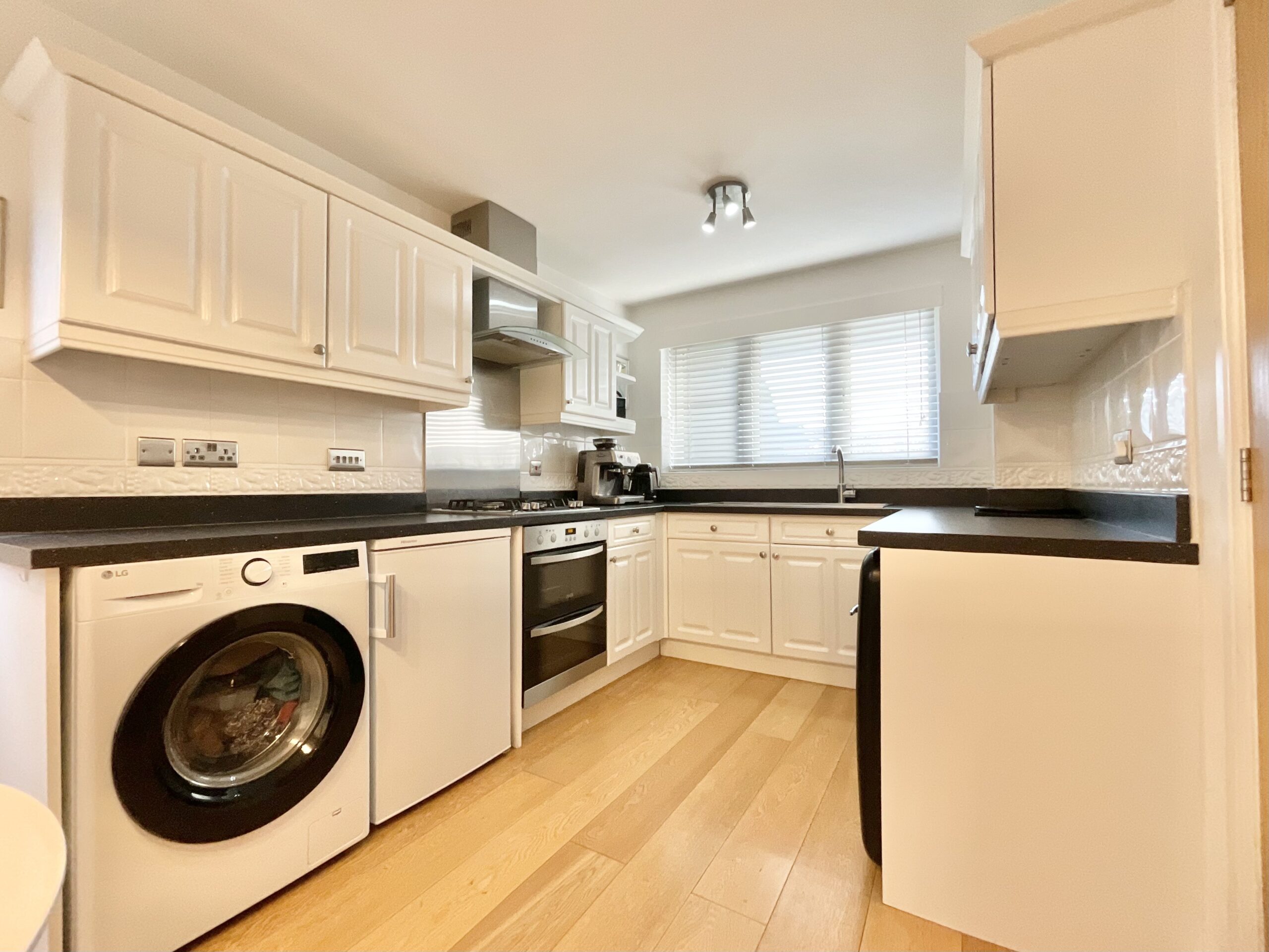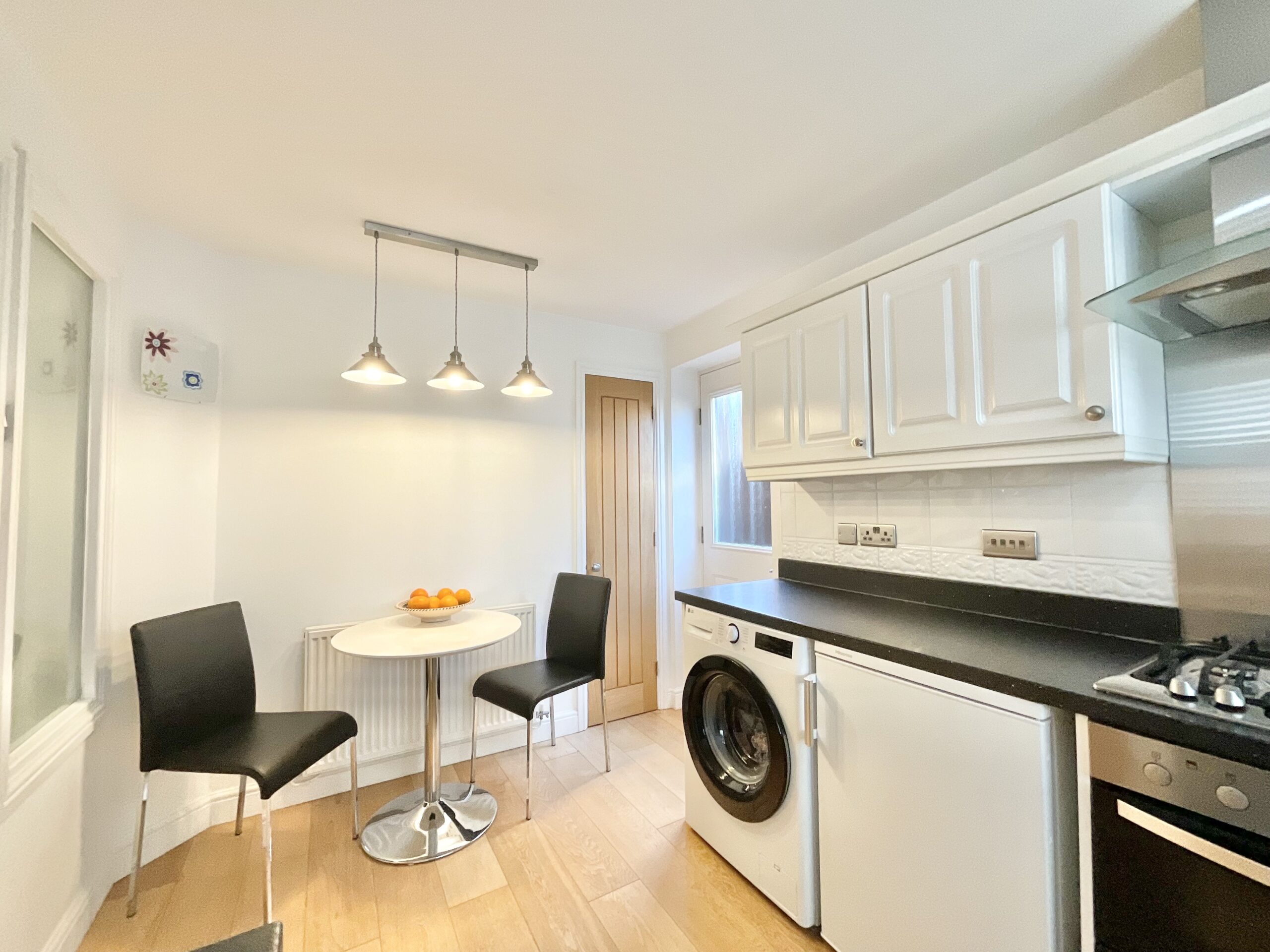 The kitchen is positioned at the front of the home and is fitted with a stylish range of units complemented by contrasting work surfaces. There is space for an under-counter fridge and freezer, plumbing for a washing machine, space for a cooker, a useful storage cupboard, and room for a small bistro chair and table set. A downstairs cloakroom adds further practicality.