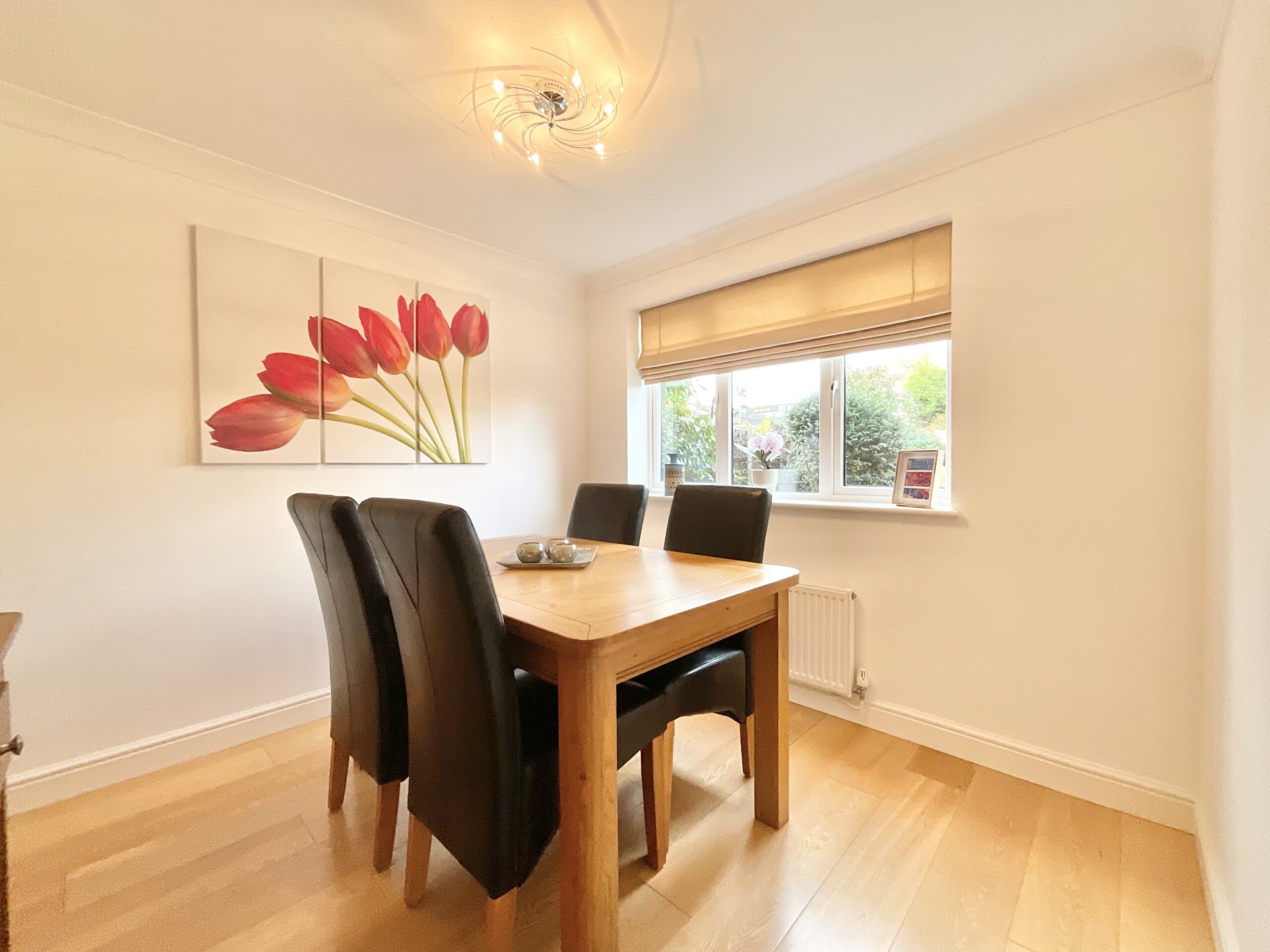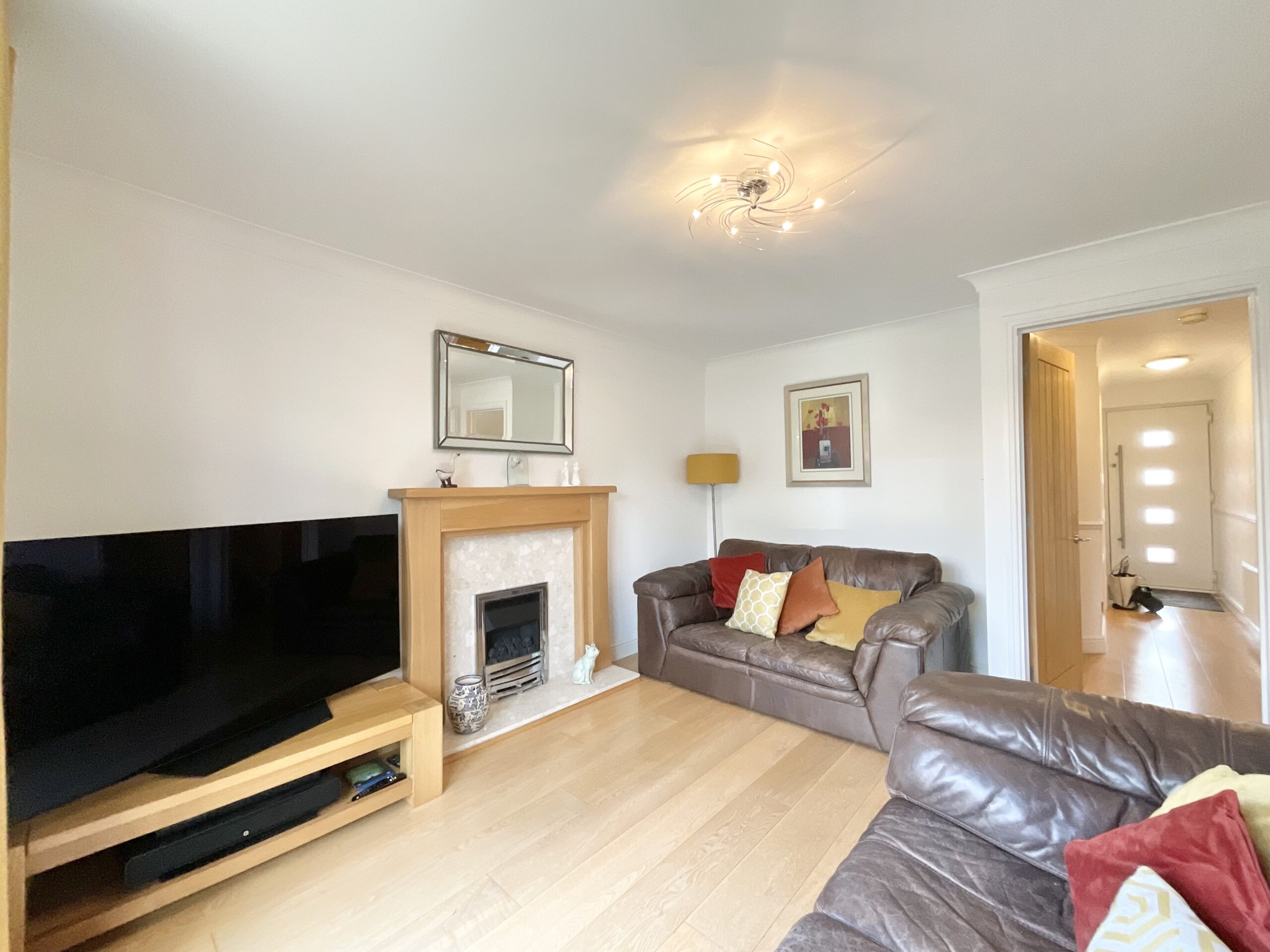 The property is entered via a welcoming hallway featuring engineered oak wooden flooring and attractive oak wooden doors throughout, setting the tone for the quality found throughout. To the rear, a bright and spacious lounge provides a comfortable space to relax, with an adjoining dining room creating a sociable layout ideal for family life and entertaining.