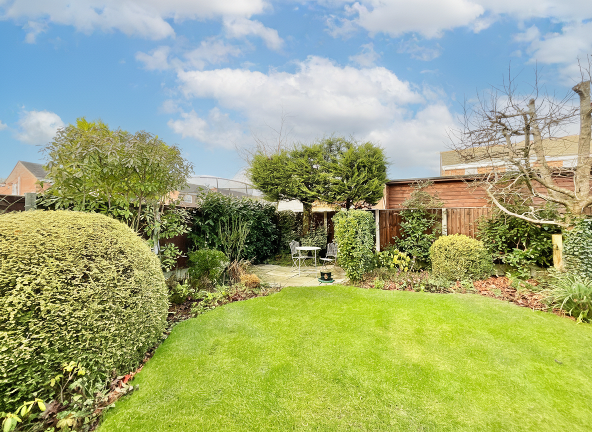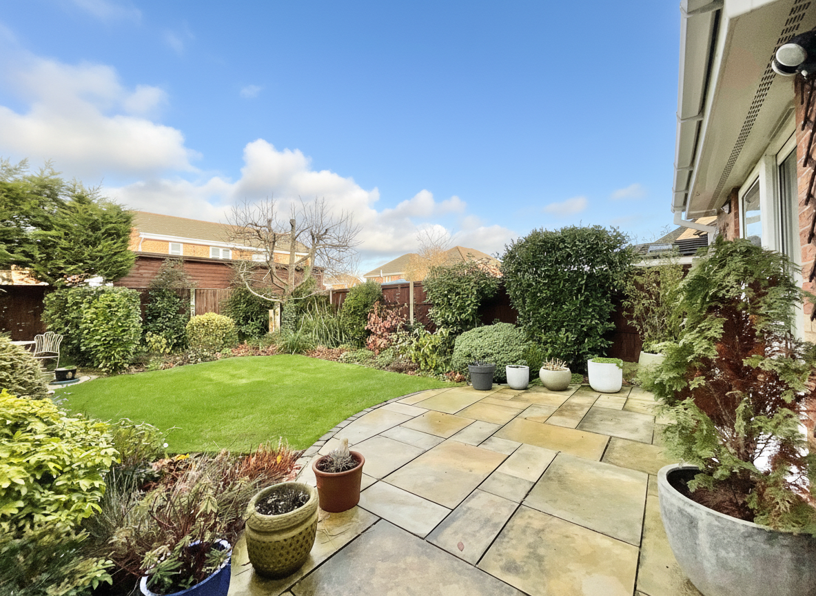 4. Landscaped rear garden with patio, lawn, and mature trees and shrubs for privacy