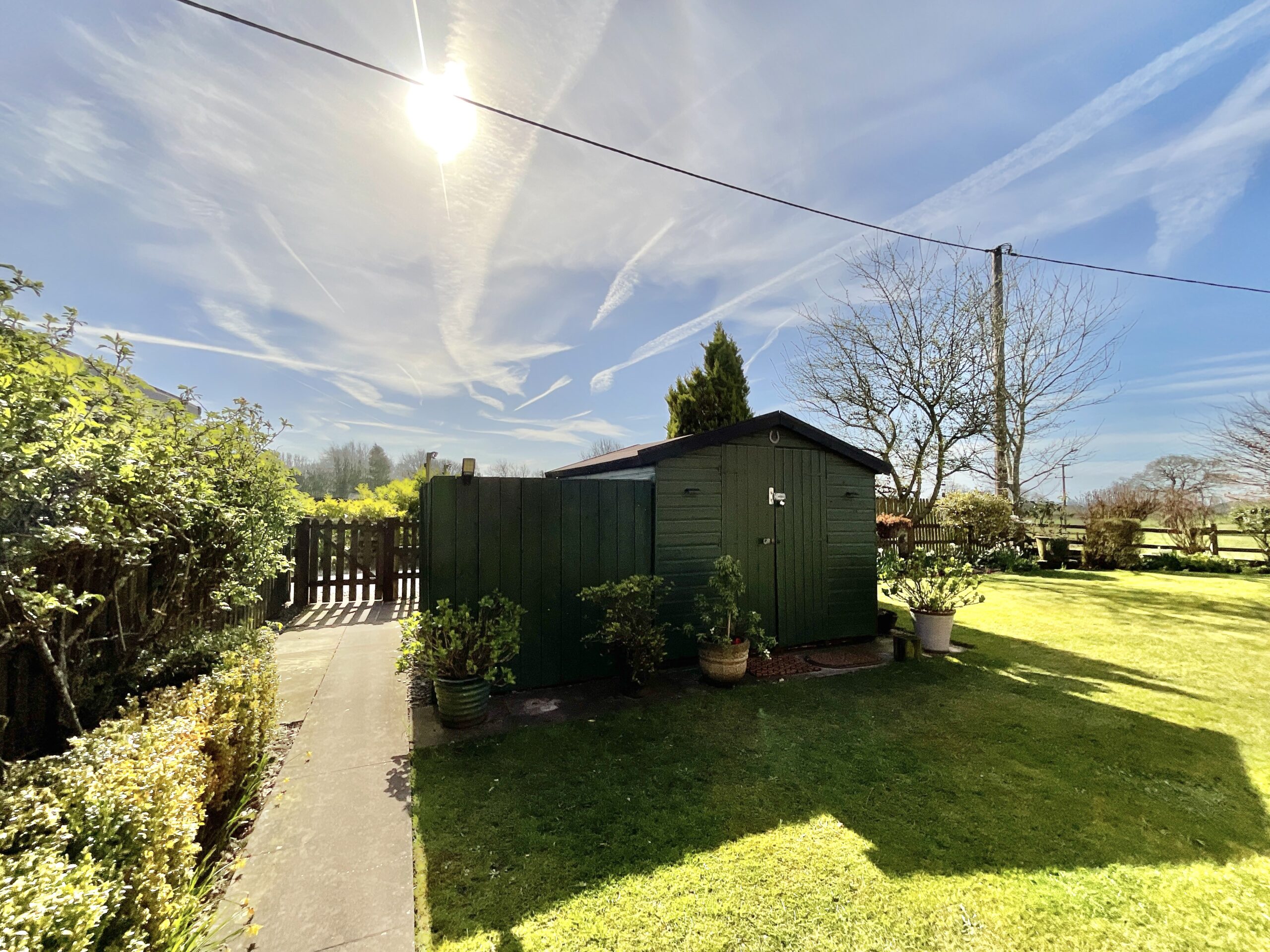 - Outside, enjoy a south-facing garden with sun all day long! Along with a shed for storage and three designated parking spots to the rear.
