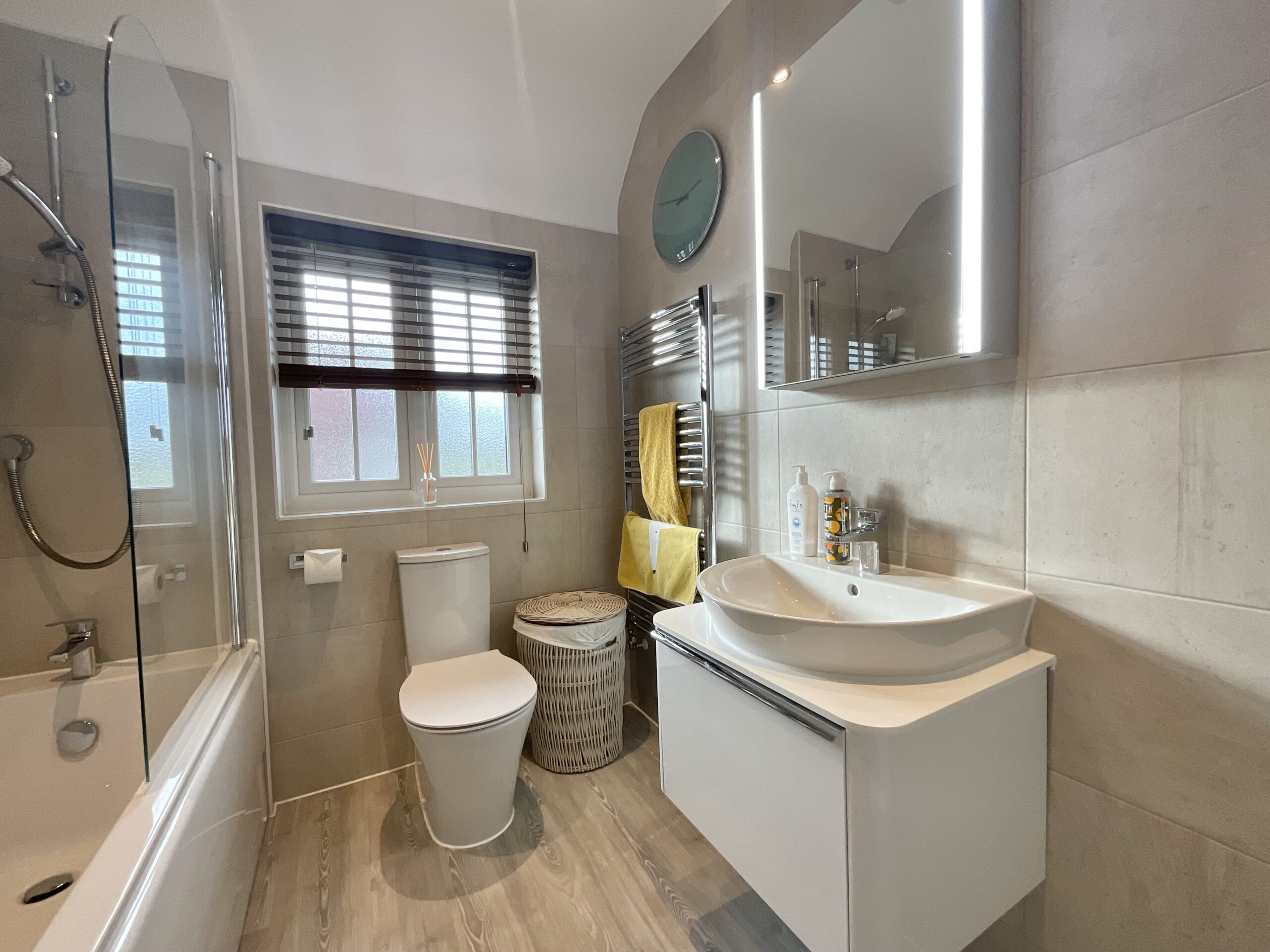 The main bathroom is well-appointed with a bath and overhead shower, complemented by a sleek vanity unit and illuminated mirror, creating a modern and relaxing space.