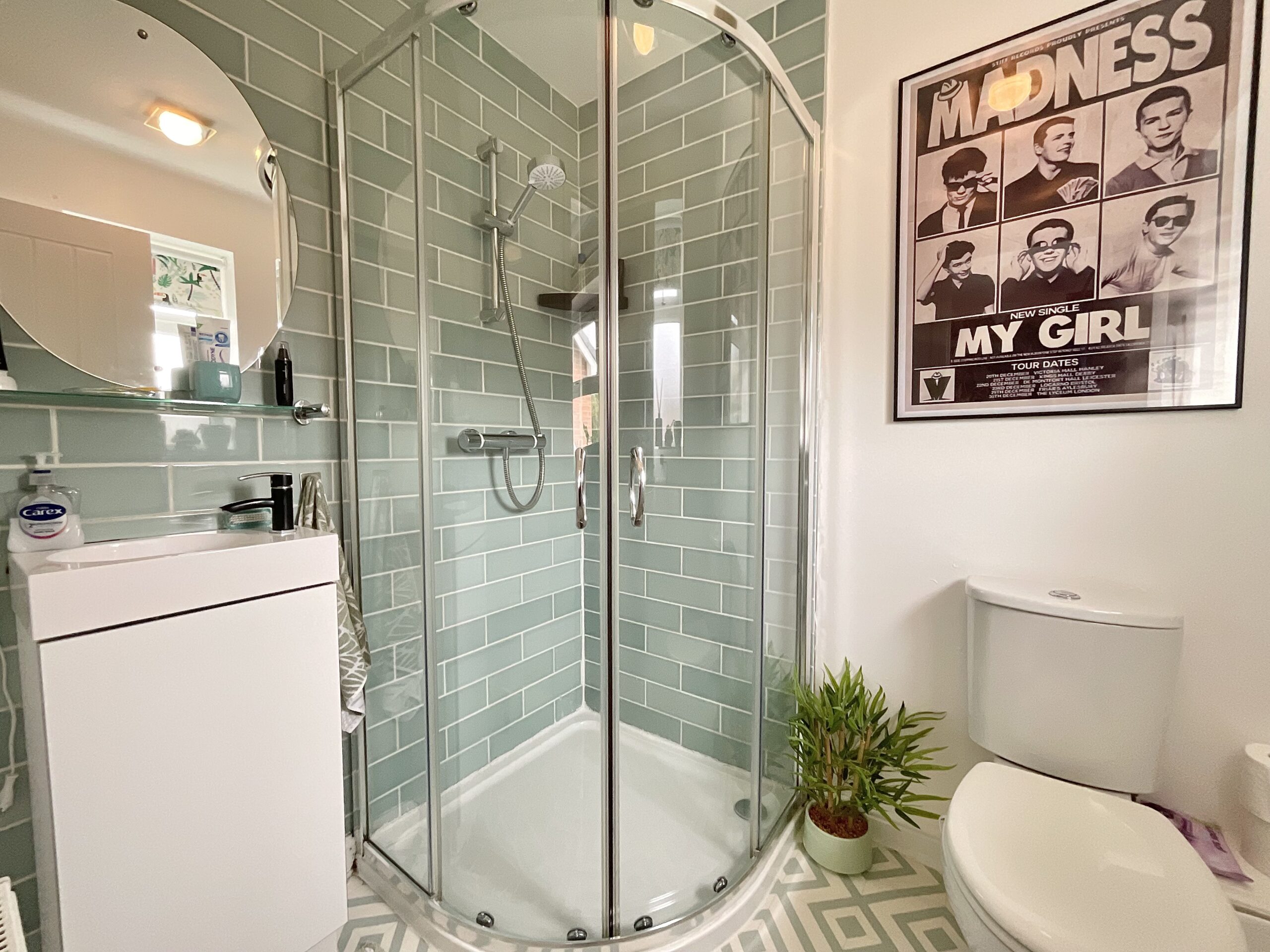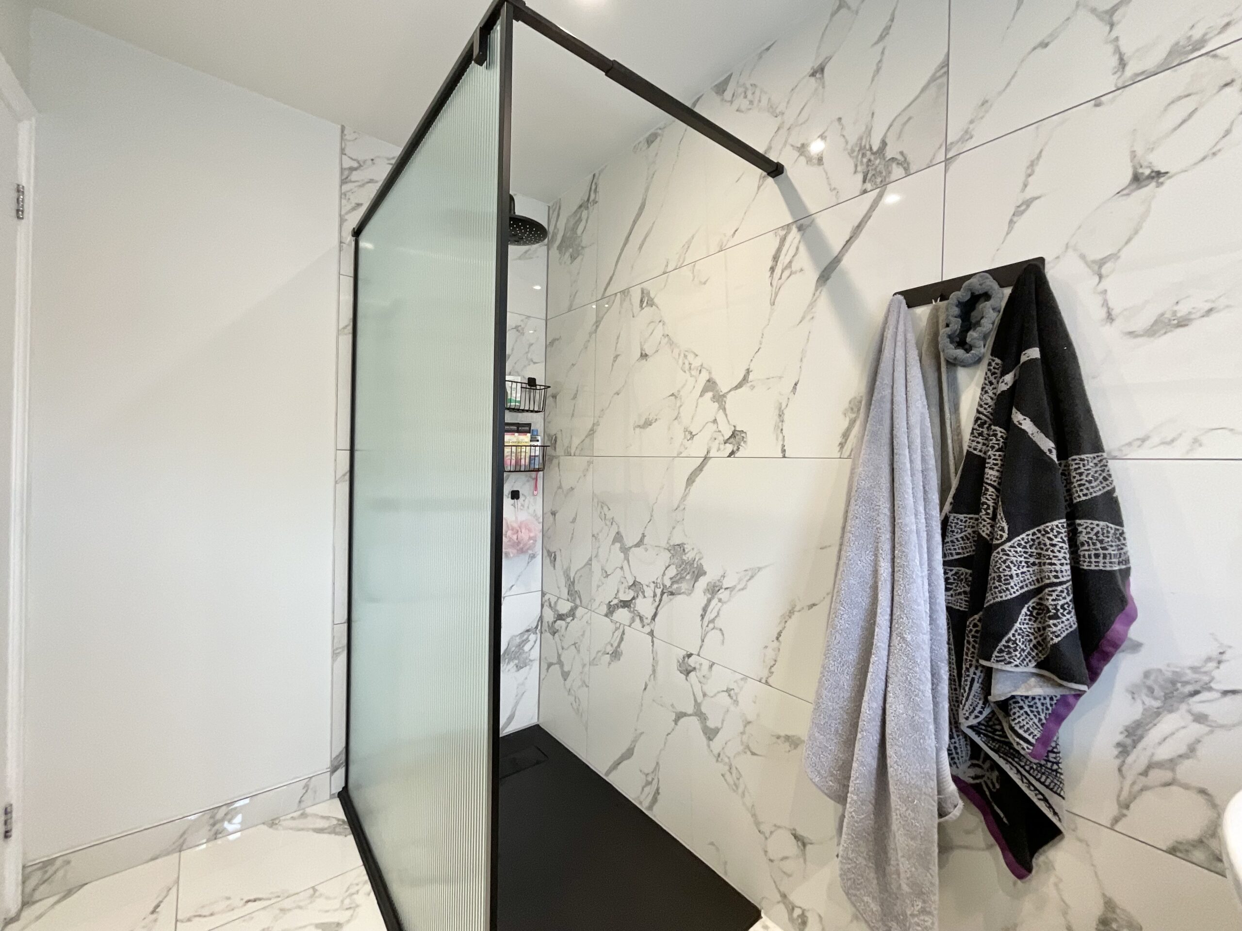 The main bathroom echoes the modern feel of the rest of the home, with clean lines, tasteful fittings, and a large walk-in shower framed by an obscured glass panel for both style and privacy. A mirror with built-in lighting adds a touch of luxury, and a water pressure pump has been installed in the property to ensure a strong, consistent flow in both bathrooms — providing a more enjoyable and efficient shower experience.
