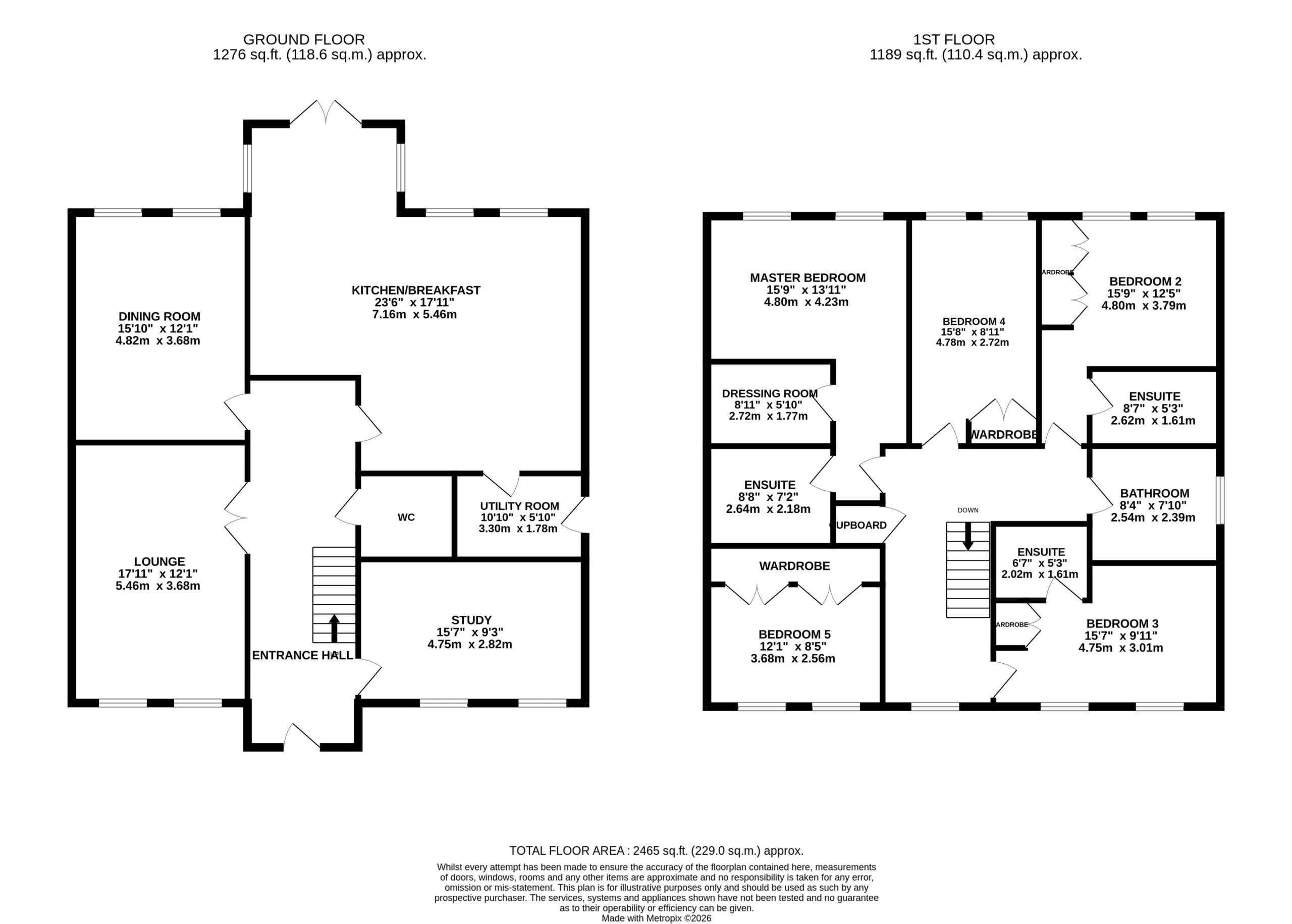 - Five double bedrooms, three with en-suites; master includes a separate dressing room and fitted wardrobes throughout