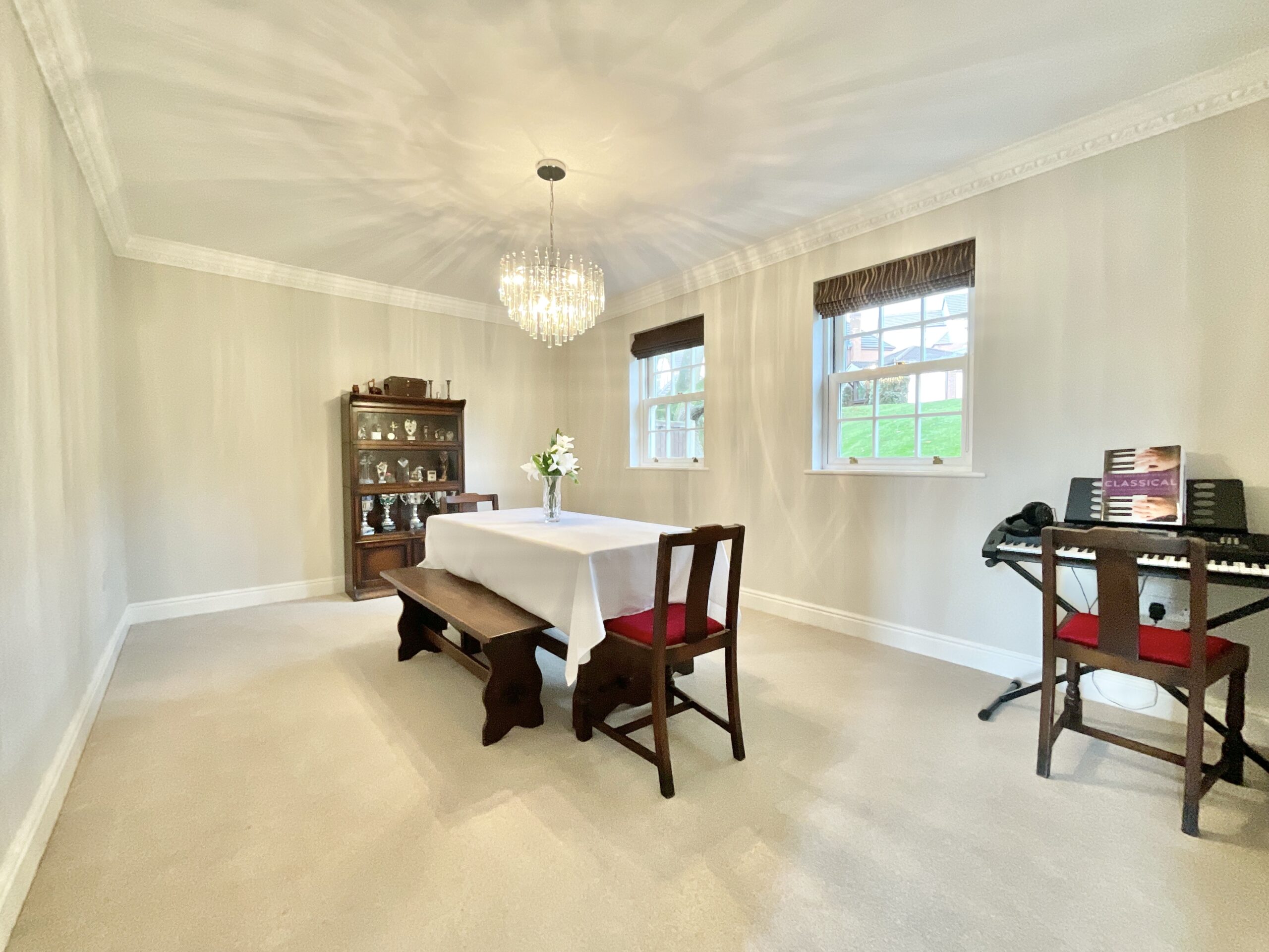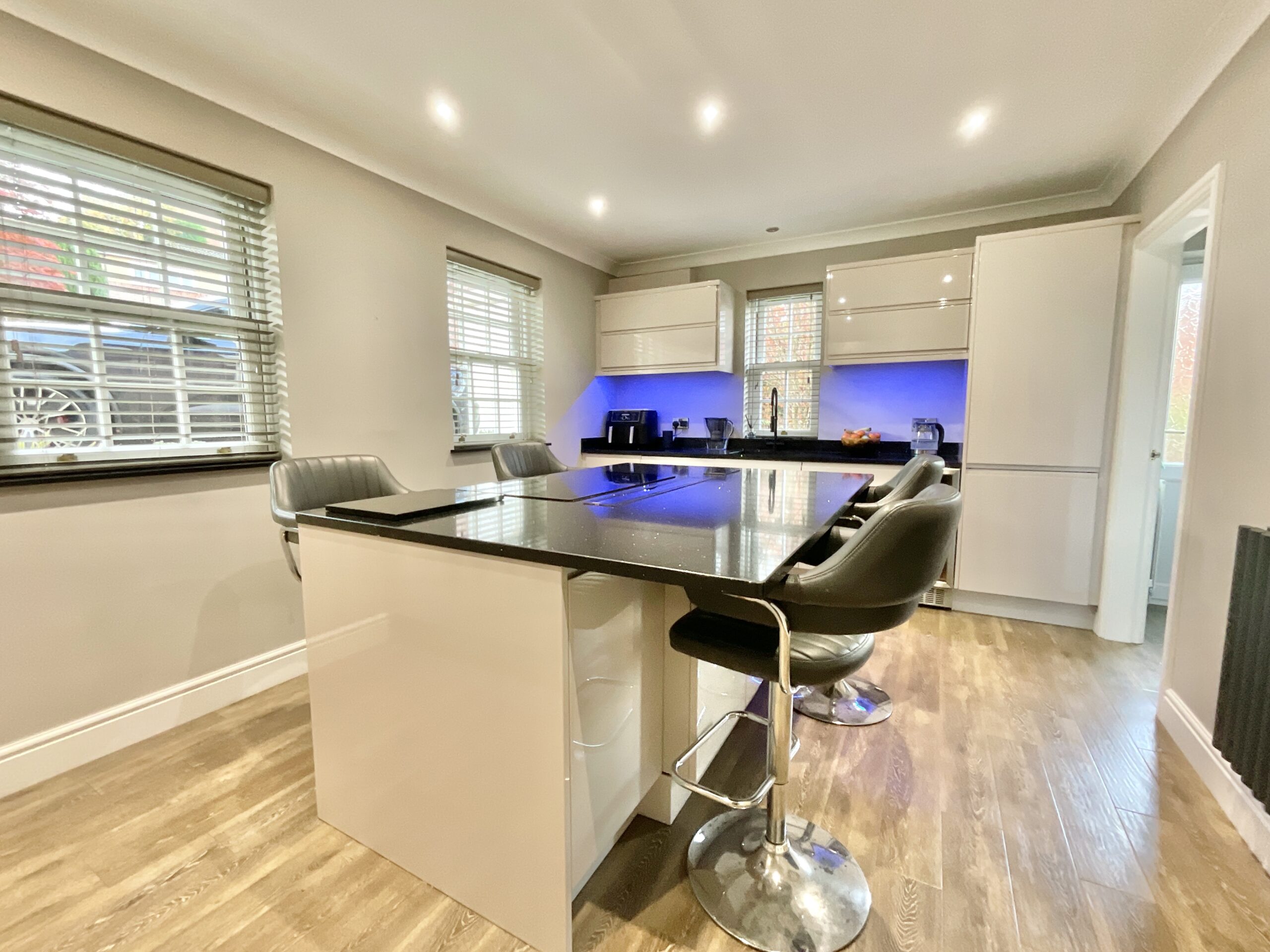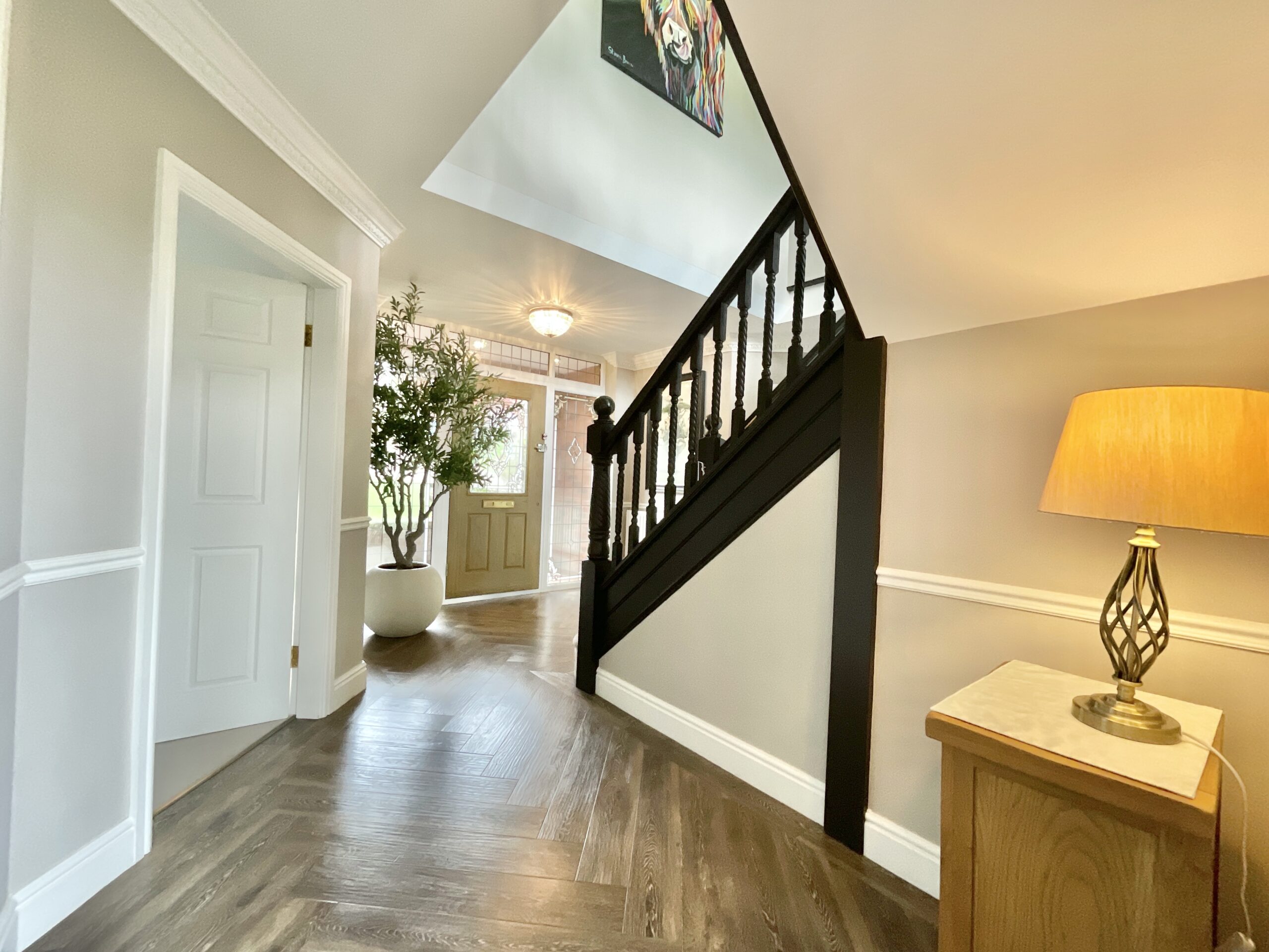From the moment you cross the threshold, you’re greeted by a grand entrance hall featuring show-stopping herringbone Karndean flooring and a dramatic feature staircase, a true once upon a time moment that sets the tone for the sophisticated spaces that follow. Light pours through floor-to-ceiling windows in the rear sitting/sun room, illuminating expansive living areas made for everything from family film nights to fabulous soirées. Multiple reception rooms give you the freedom to live, lounge or laugh just the way you like. The heart of the home, a sleek and stylish kitchen, is as functional as it is fashionable, complete with glossy cabinetry, a statement island with breakfast bar, integrated Neff appliances, induction hob, wine fridge and a neighbouring utility room that keeps everything running smoothly behind the scenes. Each reception room offers a unique flavour of elegance, from plush carpets underfoot to a cosy gas fireplace perfect for chilly evenings. Whether you're entertaining or unwinding, every corner whispers comfort with class.