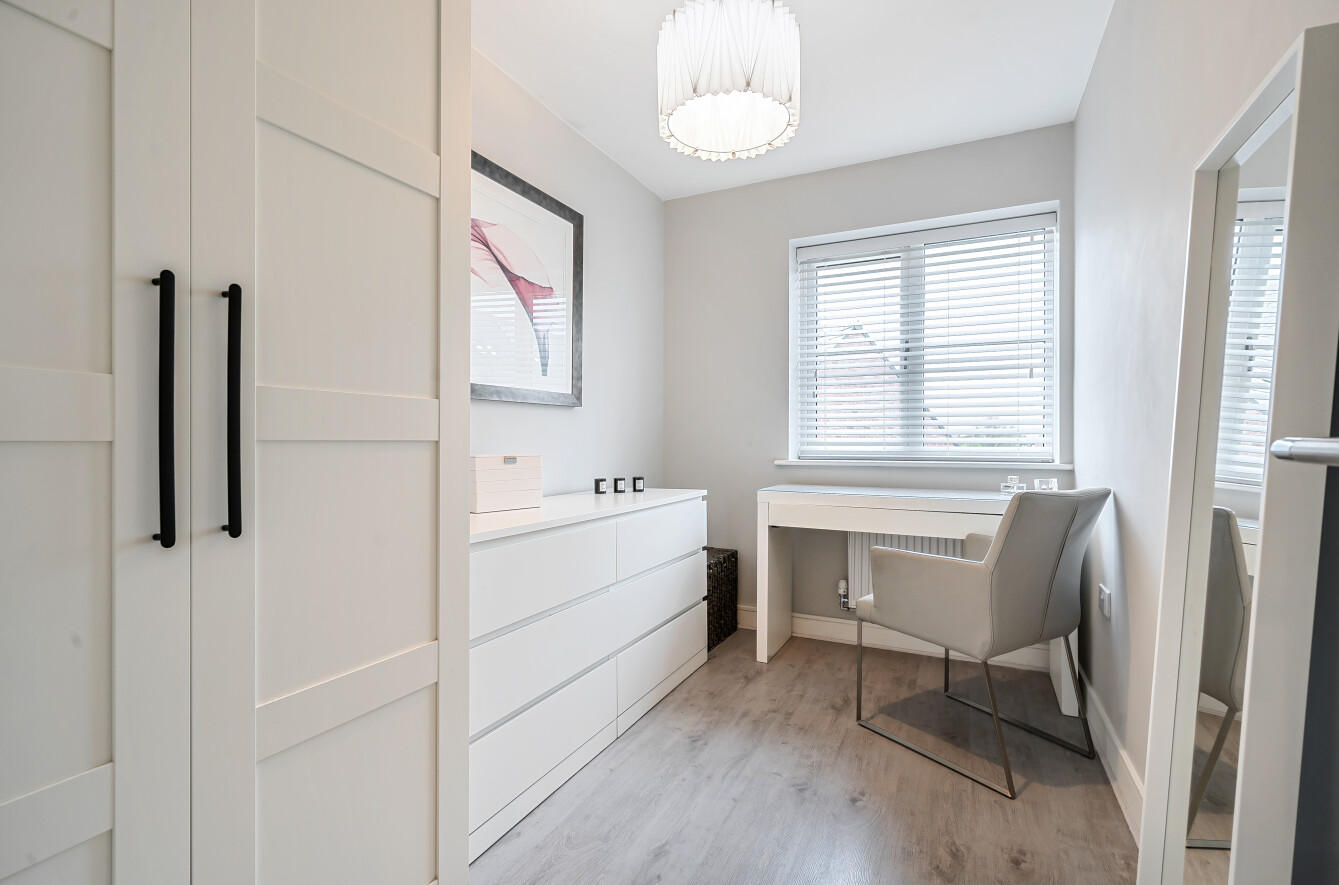 To the first floor, the principal bedroom features fitted wardrobes and a stylish en-suite shower room with walk-in shower, wall-hung WC, wash basin and an LED back-lit mirror. The second bedroom is a generous double with attractive panelling, while the third bedroom is a well-proportioned single room. The family bathroom is beautifully appointed with a bath and rainfall shower over, wall-hung vanity unit, wall-hung WC and LED back-lit mirror. Additional storage is provided by a landing cupboard with hanging rails, and there is also a large boarded loft offering excellent storage space.