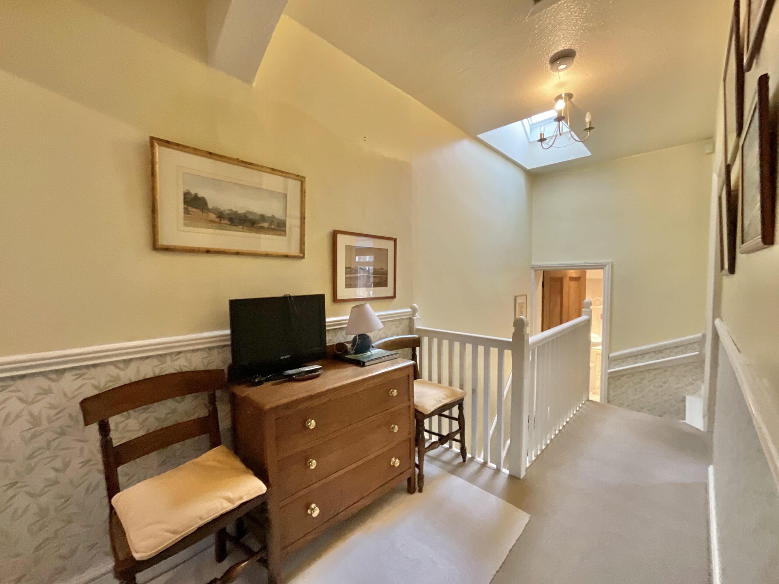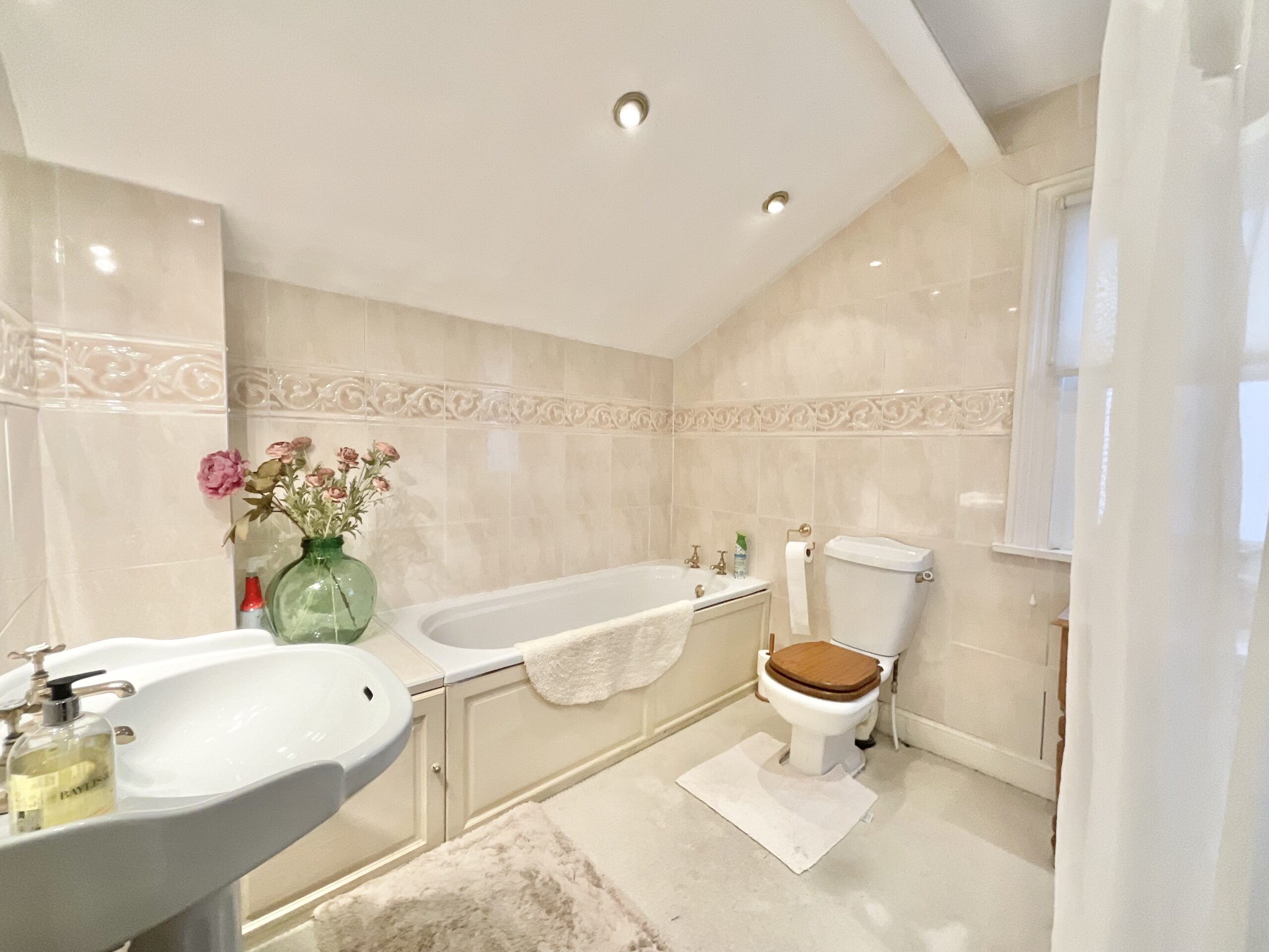 Upstairs, there are three well-proportioned bedrooms. Two spacious doubles include fitted wardrobes, offering excellent storage, while the third room is ideal as a single bedroom, nursery, home office, or dressing room. The family bathroom is generously sized and well-appointed, featuring a separate electric shower, bath, WC, and wash basin.