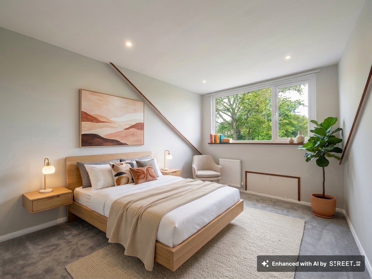 Beyond the kitchen, you’ll find a snug with a glazed sliding door looking out onto the garden, perfect for watching the seasons change across your very own green expanse. Whether it becomes a hobby room, reading nook, or second living space, it’s a room that keeps the garden in view and brings the outdoors in. Also on the ground floor is a generously proportioned bedroom, perfect for guests, downsizers who prefer single-floor living, or anyone who loves a little extra space. To top off the ground floor, there’s a sleek, modern bathroom complete with a bath, WC, and wall-mounted wash hand basin.