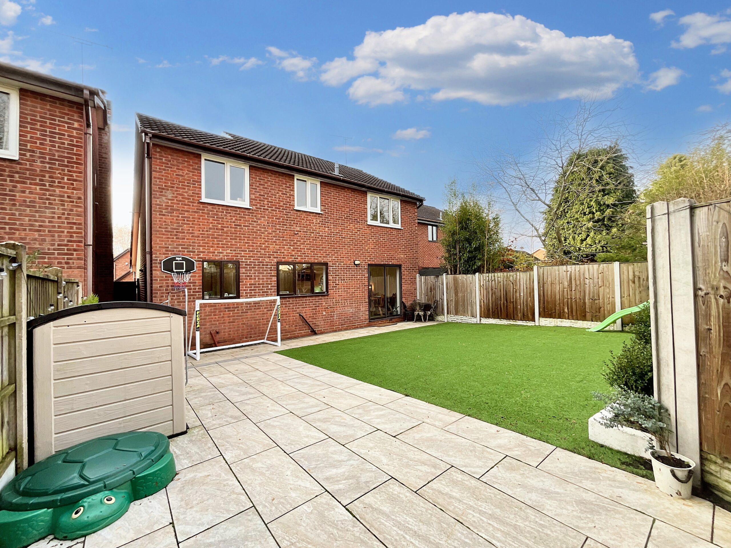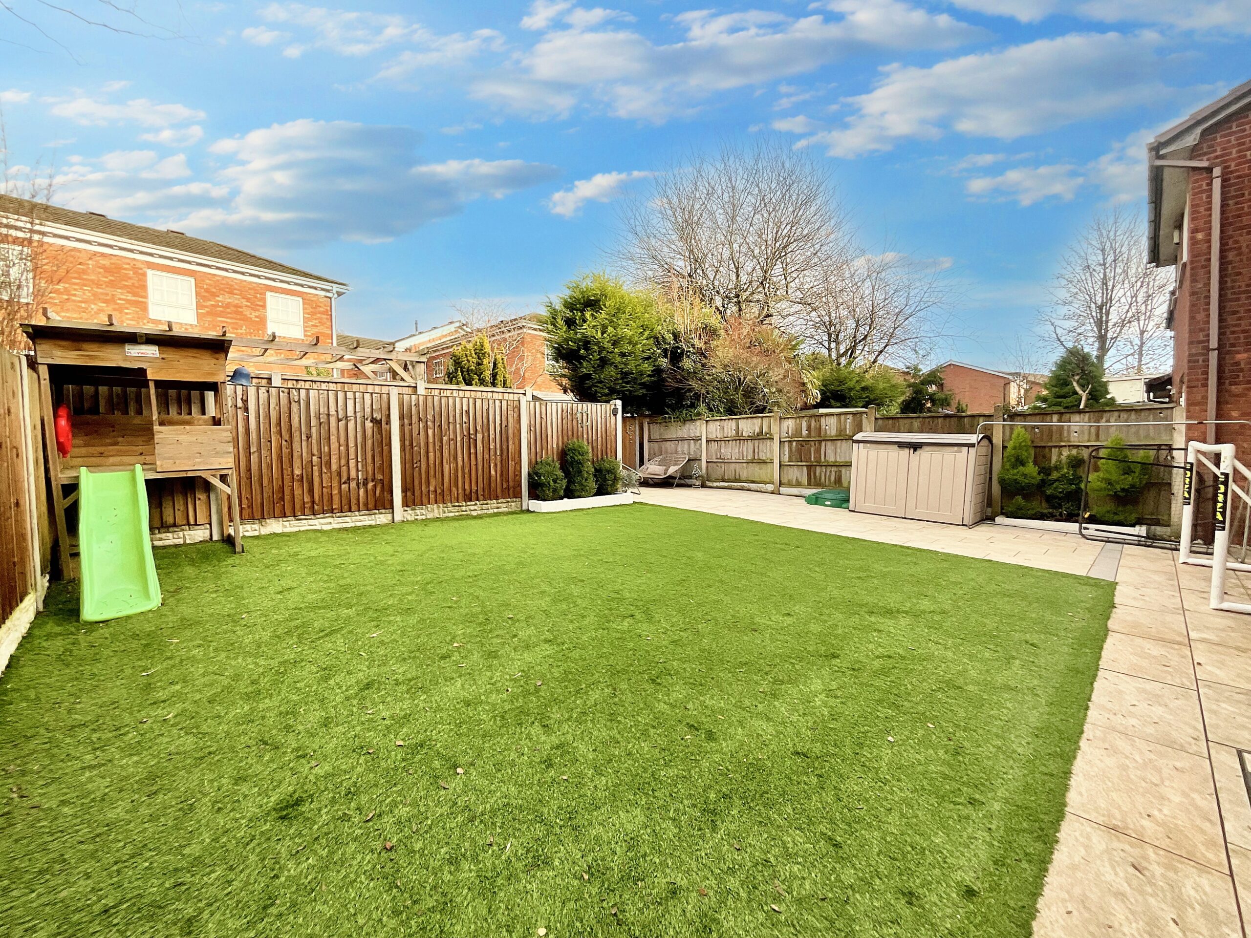Outside, the low-maintenance rear garden awaits with a large patio seating space, an artificial lawn, and convenient side access to the front of the home. Upon approach to the property, you’re greeted with a well-manicured front lawn, a driveway with off-road parking, and a single garage for secure storage.